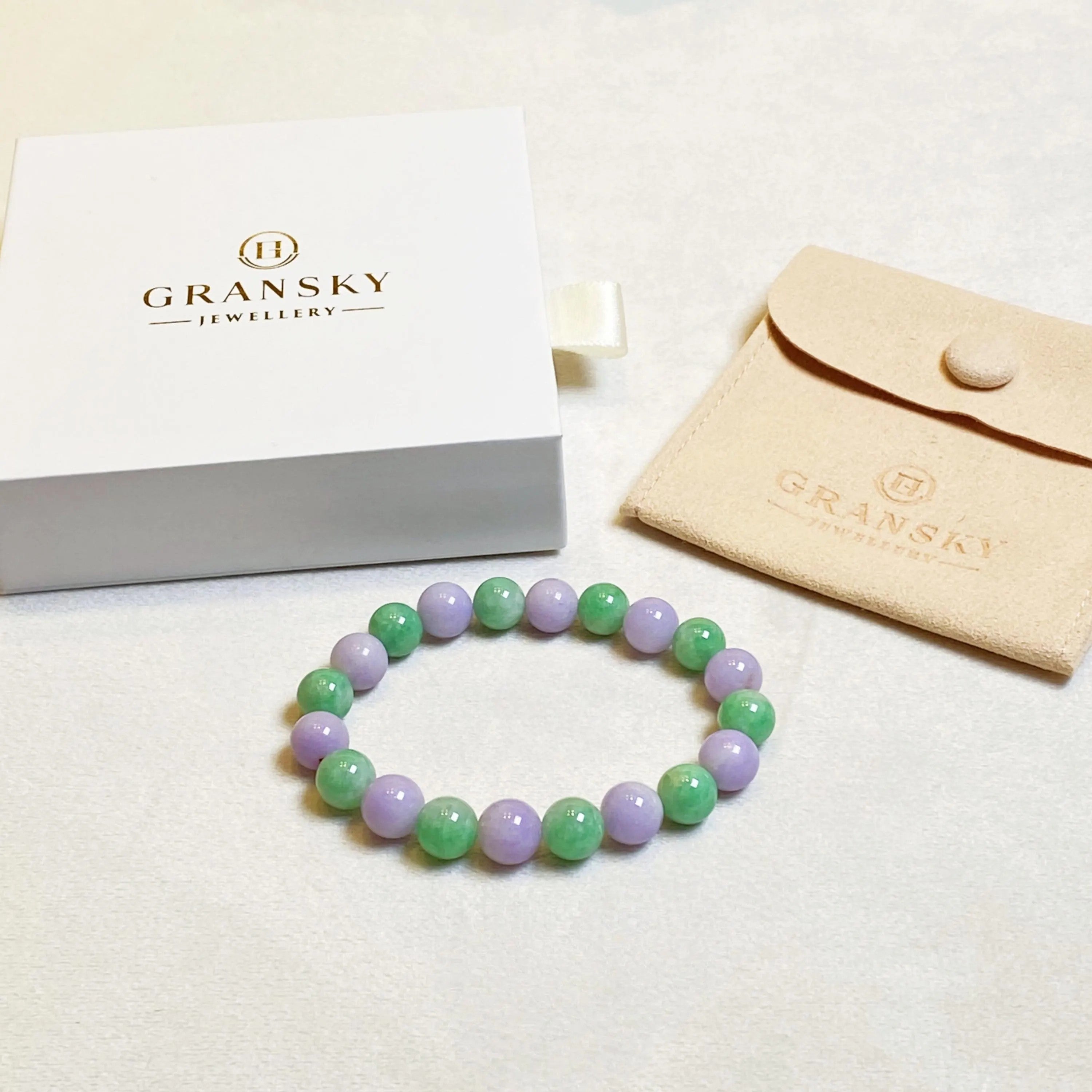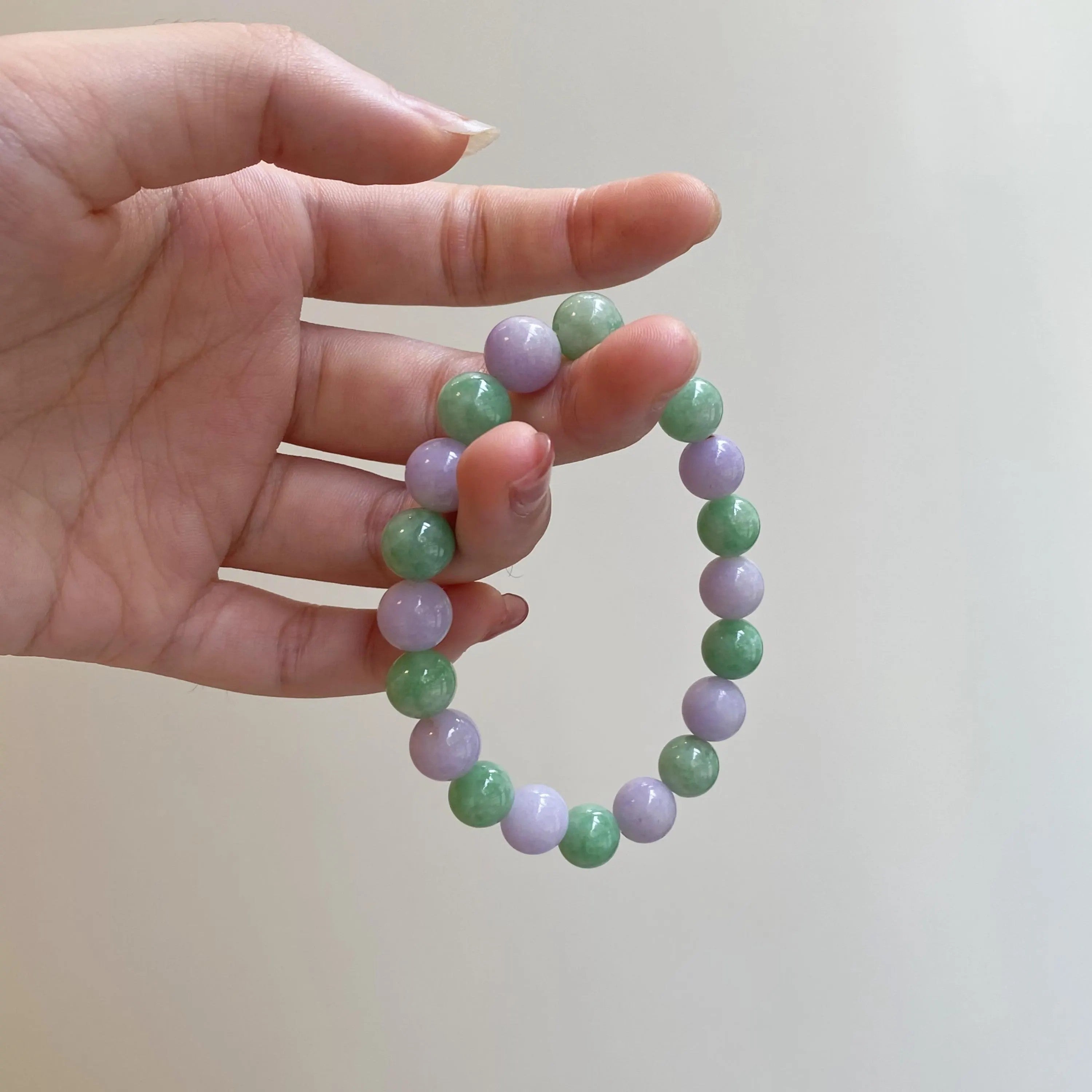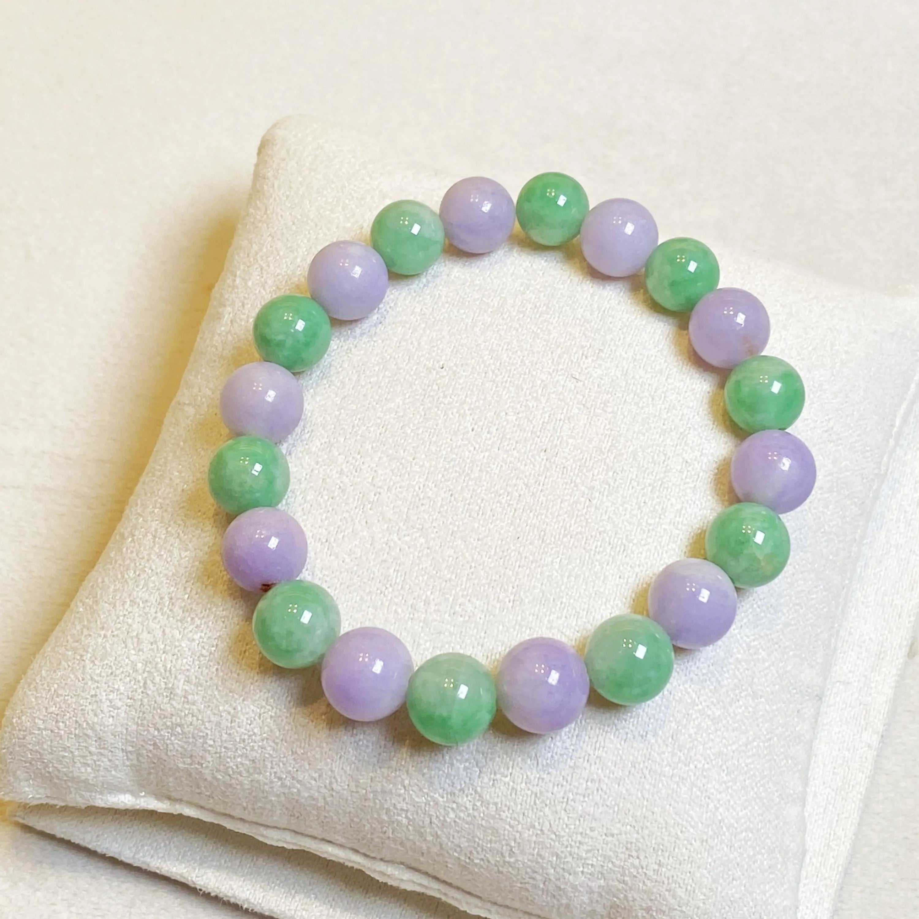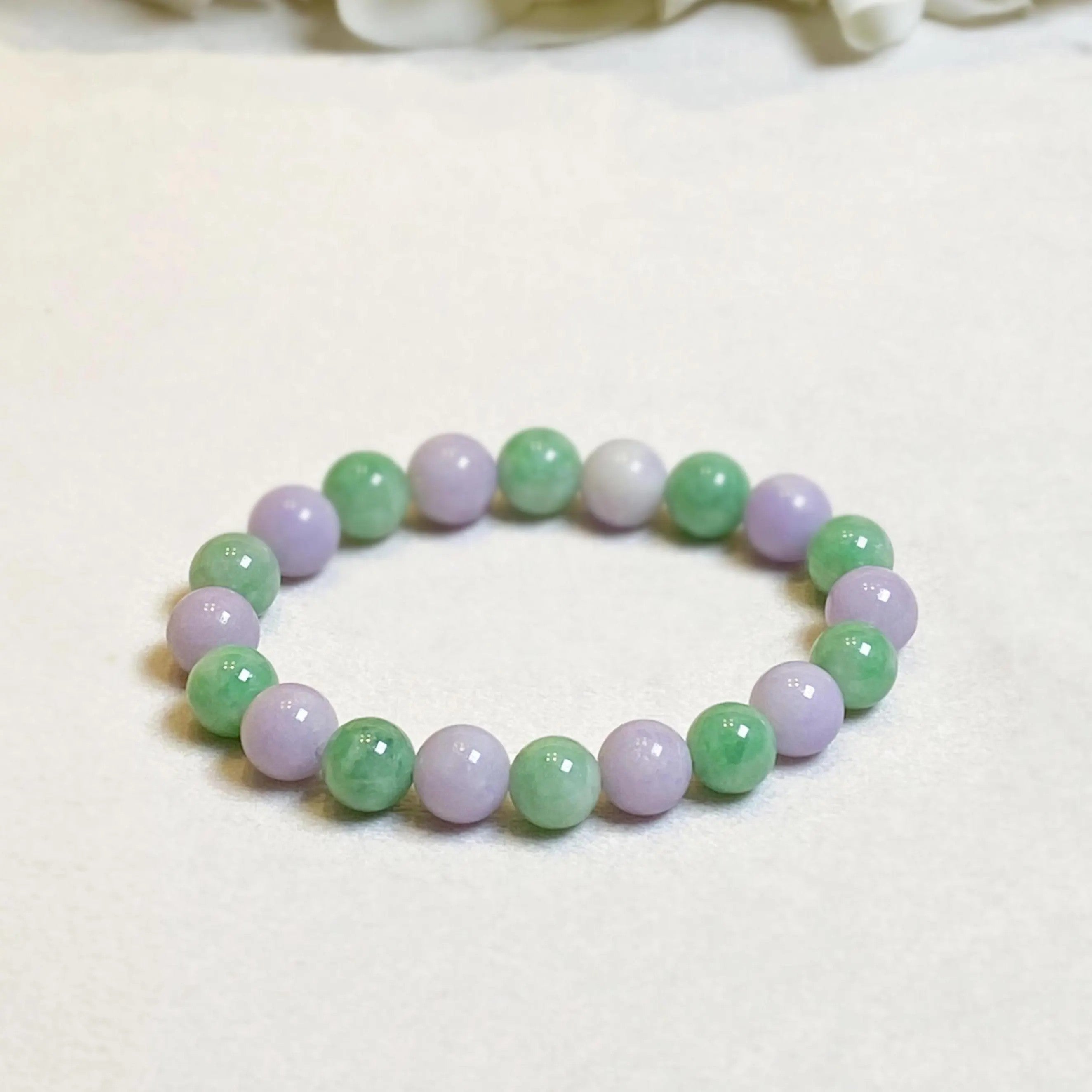 Alternating Green and Purple Jade Beaded Bracelet - 9-9.5mm Beads, 17cm, Natural Jadeite