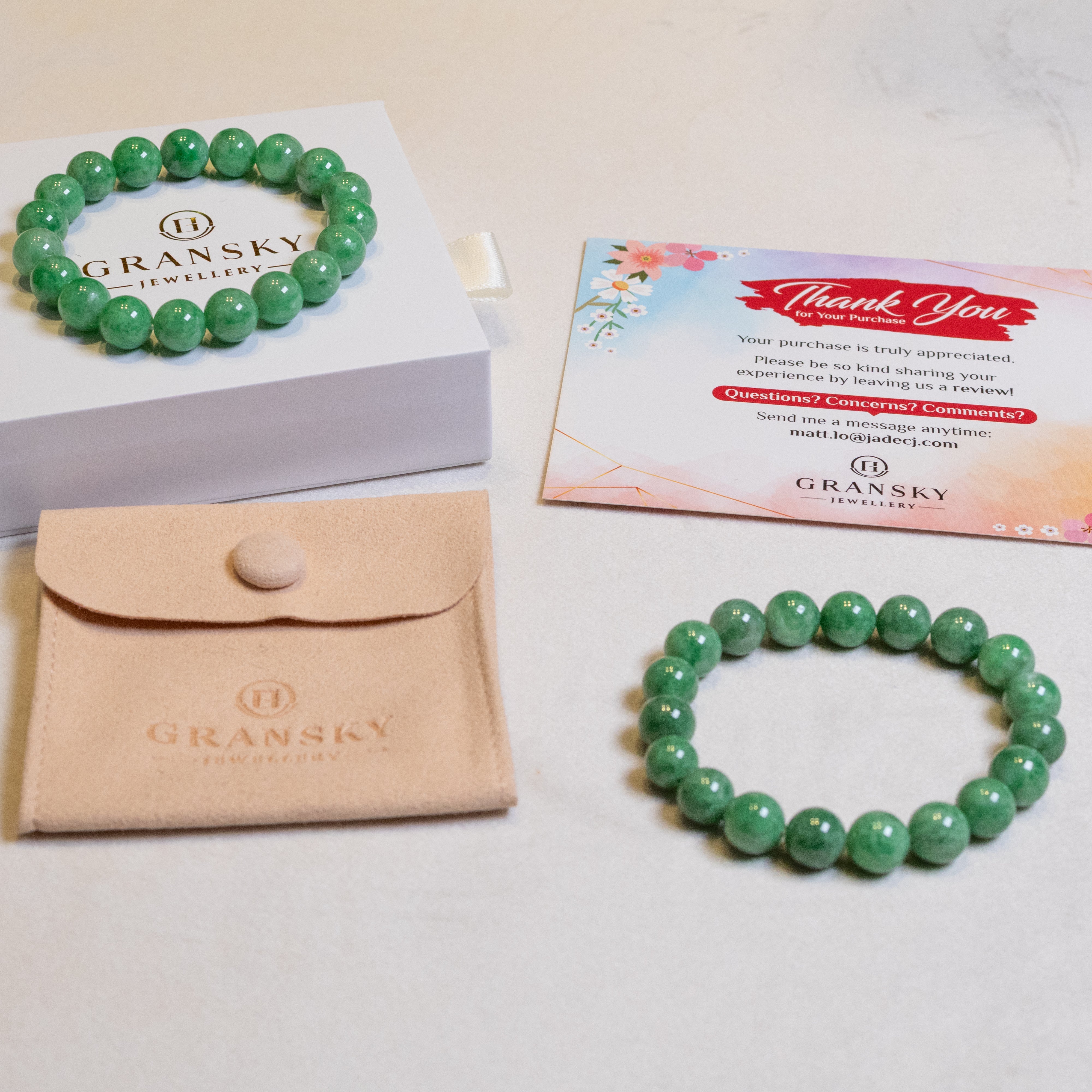 At Gransky, every piece of jade that is used in our jewelry is guaranteed to be created from natural jade rough and of Hong Kong Jade & Stone Laboratory Ltd. (HKJSL) certifiable jadeite grade in type A. That is 100% natural and free from any form of chemical treatment.