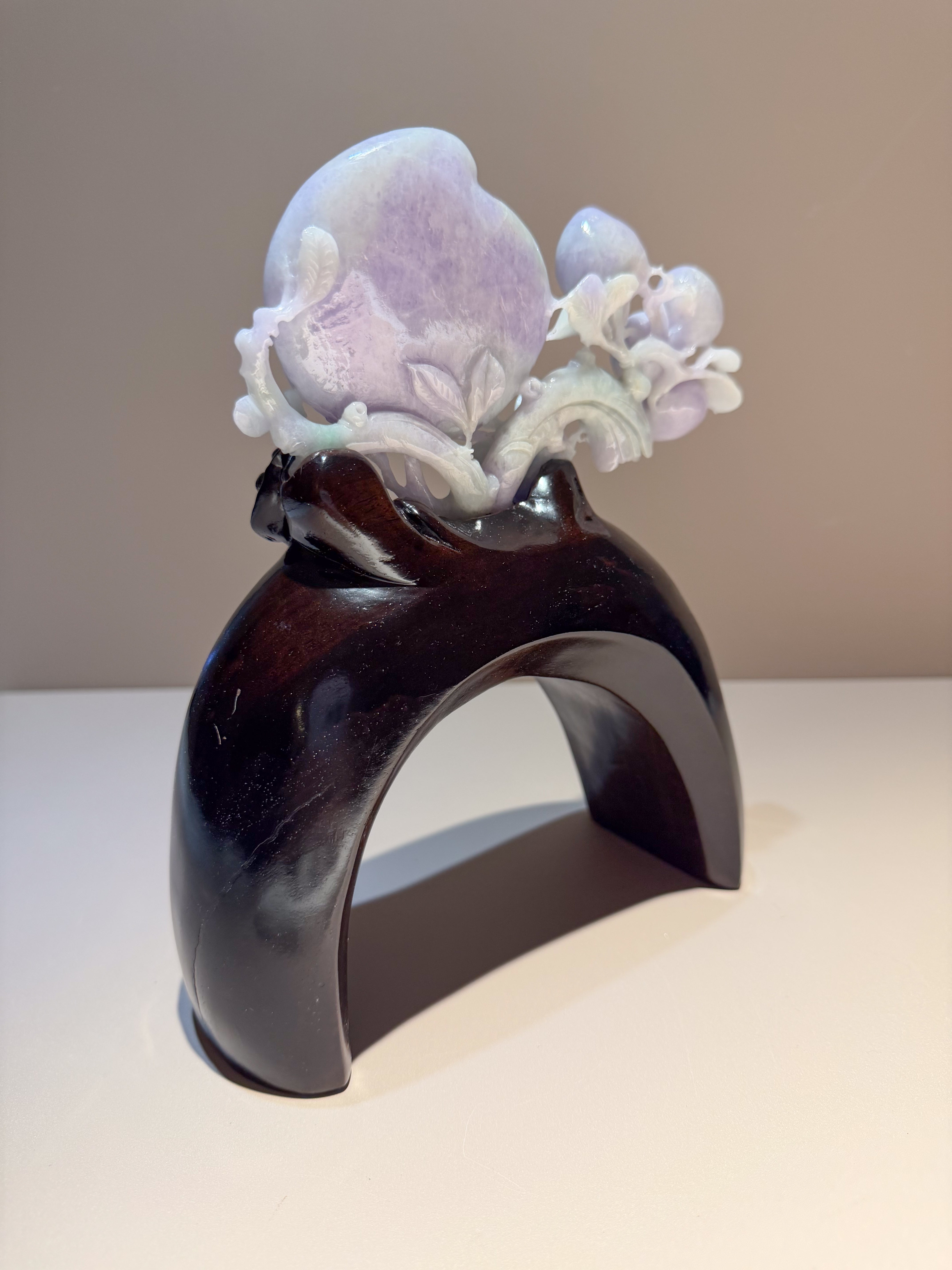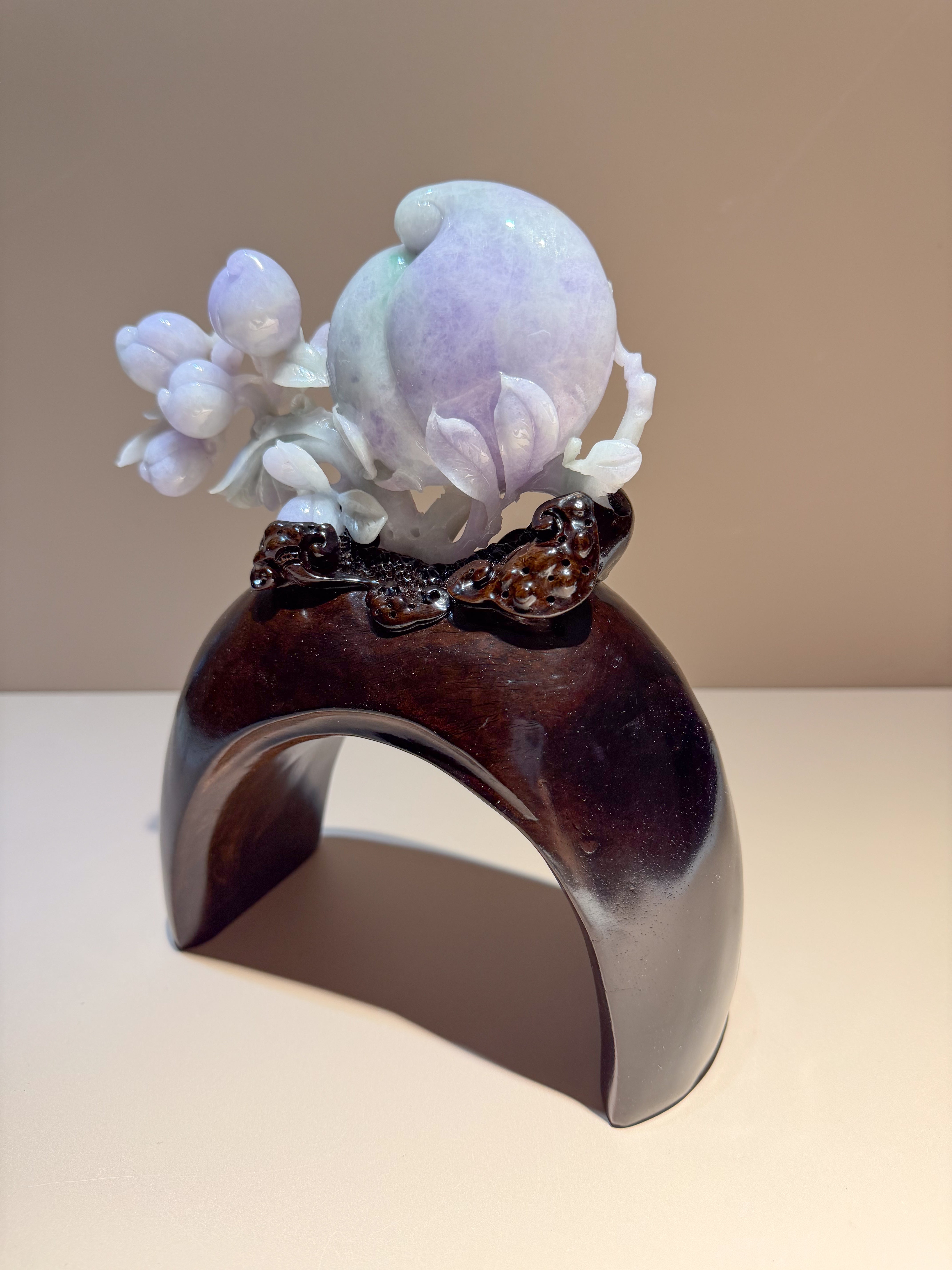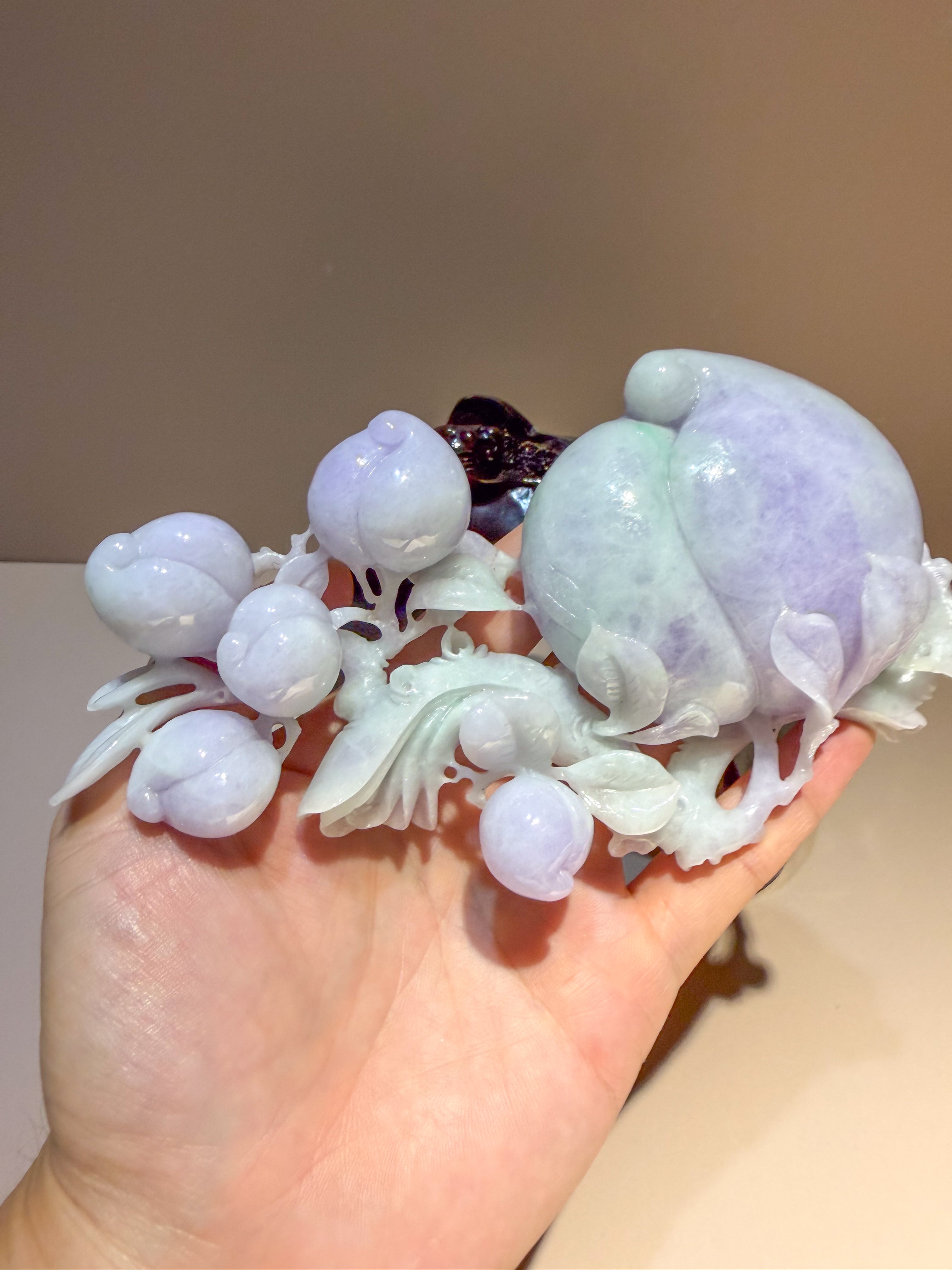 Purple and Green Jade Peach & Ruyi Carving with Wooden Base - Natural Burmese Jadeite Sculpture for Home & Office