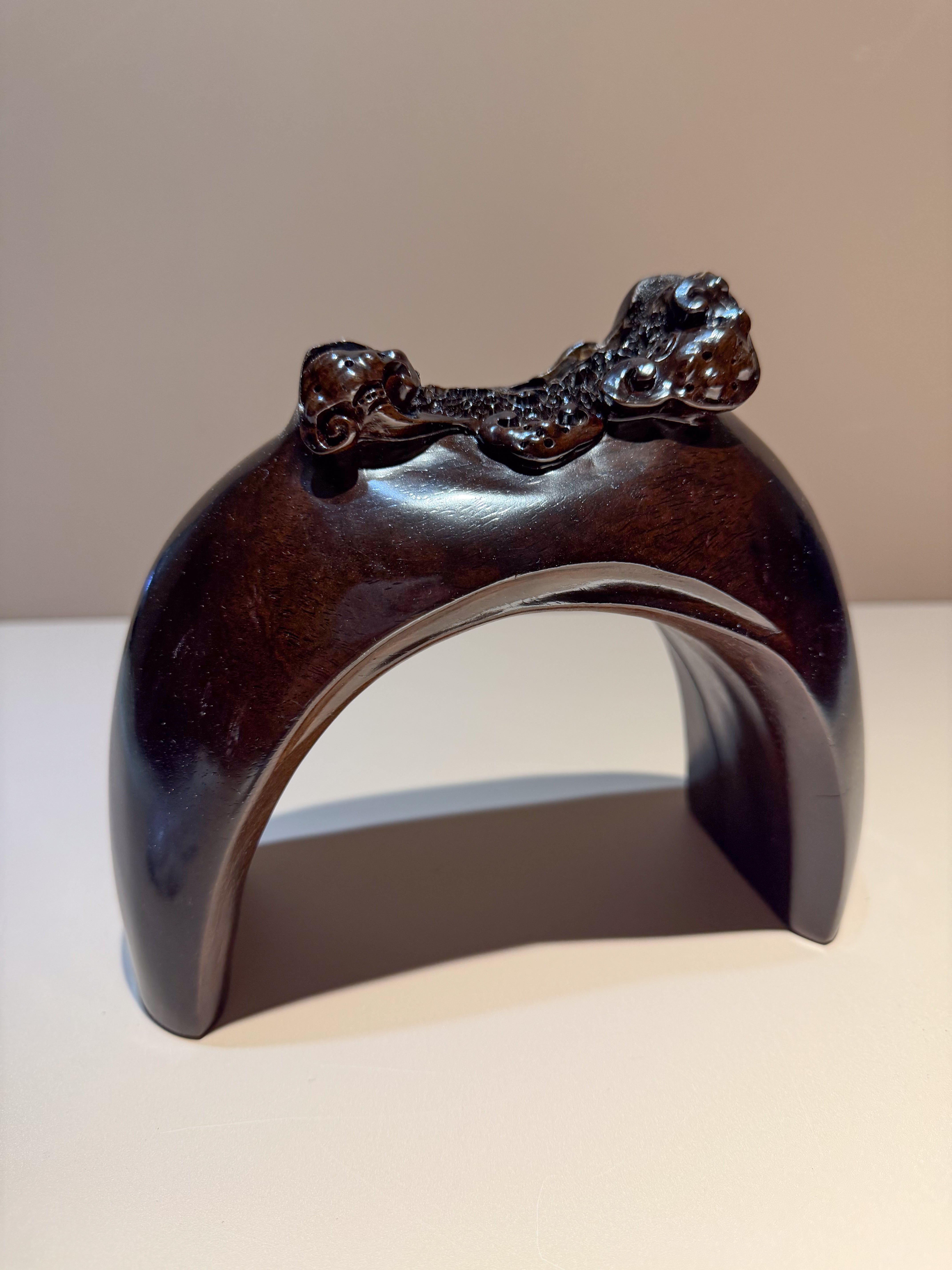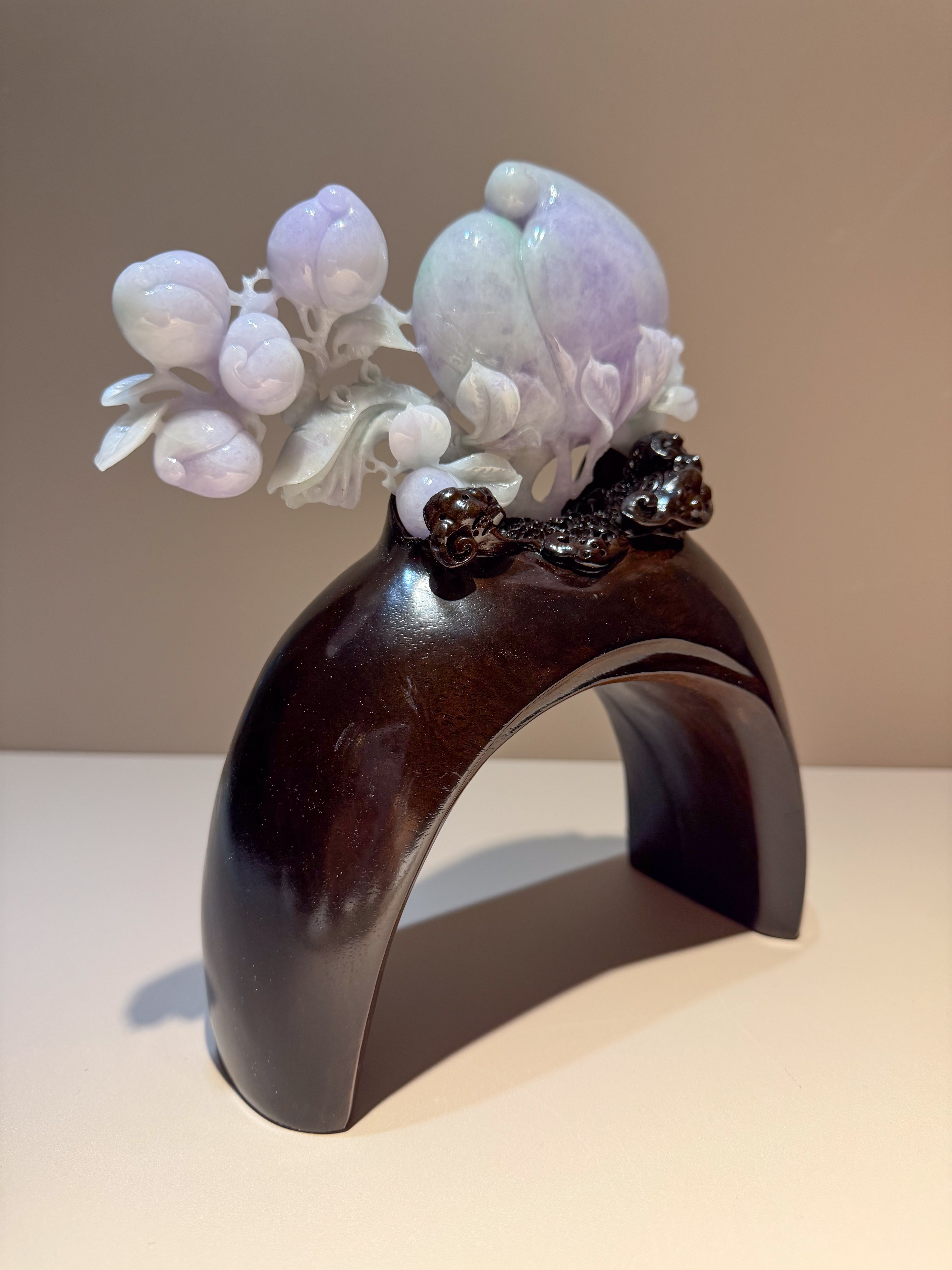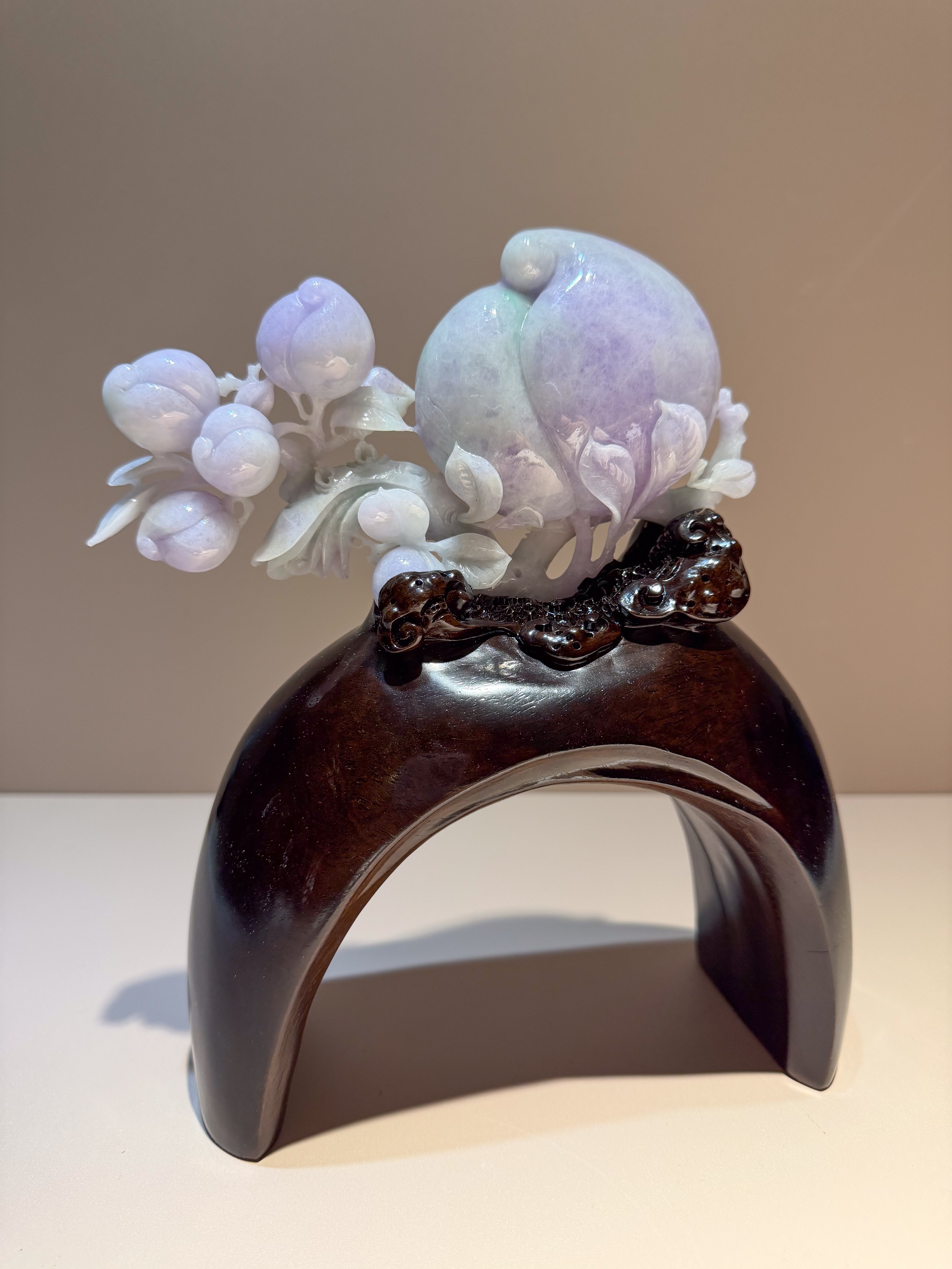 Purple and Green Jade Peach & Ruyi Carving with Wooden Base - Natural Burmese Jadeite Sculpture for Home & Office