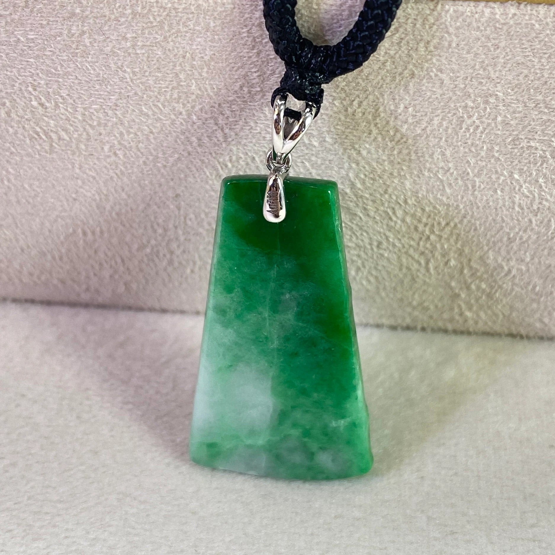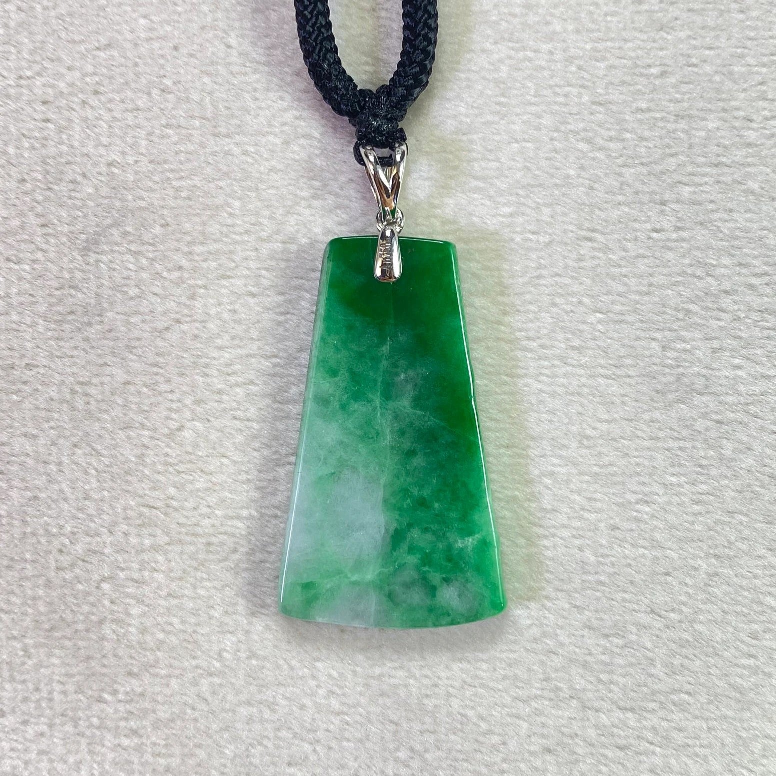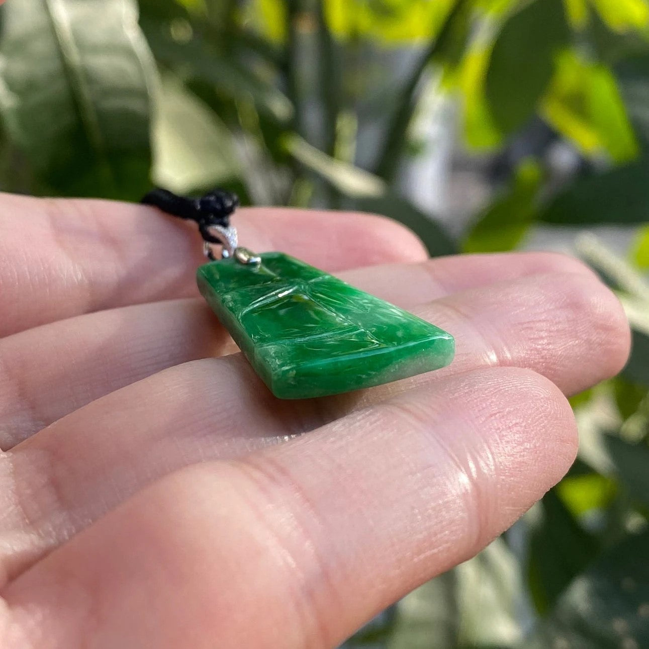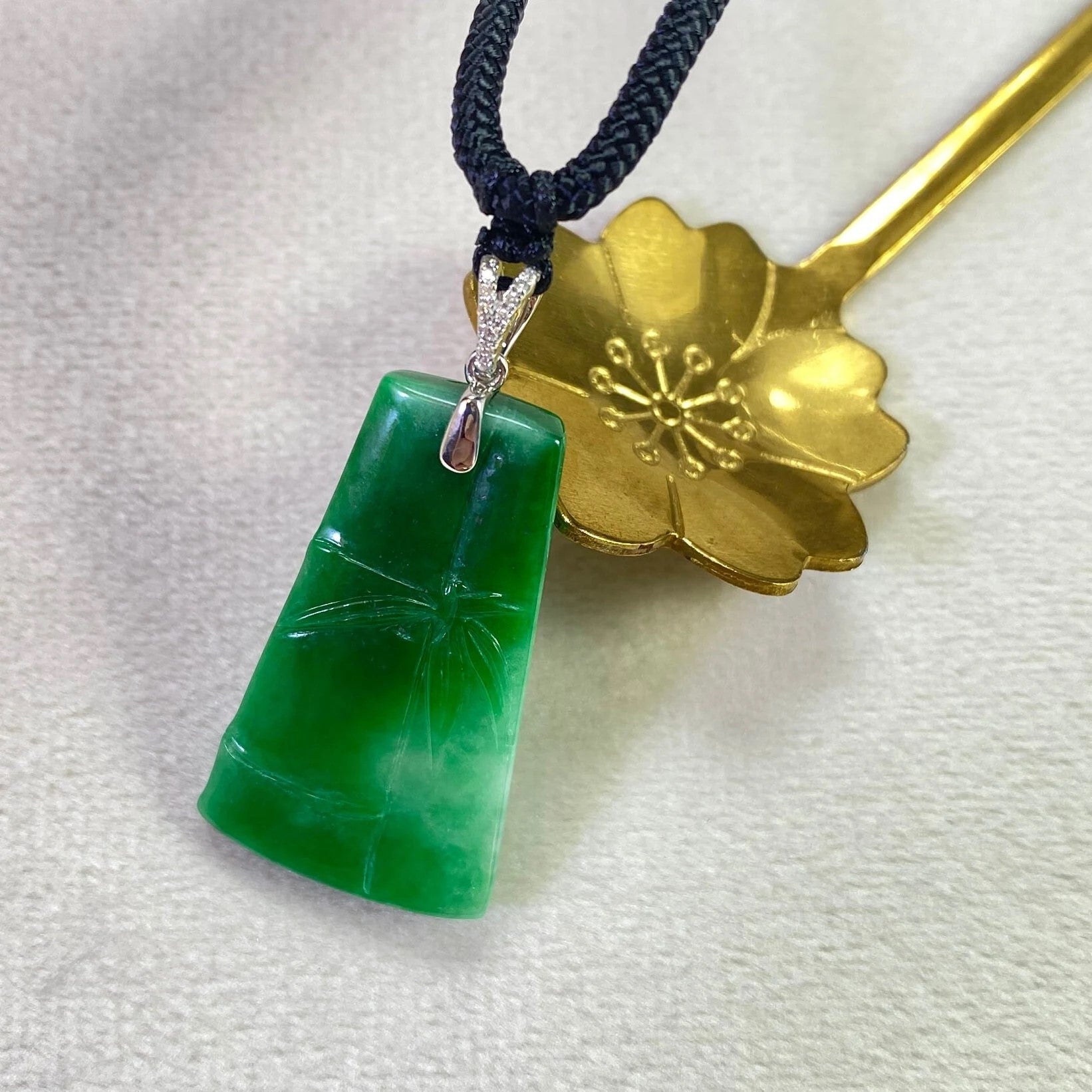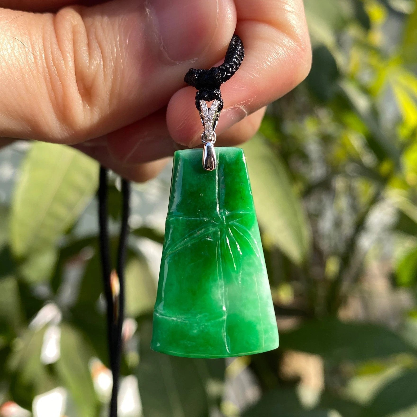 ✅This vibrant green jade pendant showcases a hand-carved bamboo design, symbolizing resilience and strength. Made from high-quality natural jade, it features an 18k white gold bail adorned with natural diamonds. Connected to a black adjustable string, this captivating accessory radiates vitality and positive energy. Each detail reflects exceptional craftsmanship, transforming it into a striking piece of jewelry that beautifully embodies elegance and nature's spirit. A perfect addition to any collection.