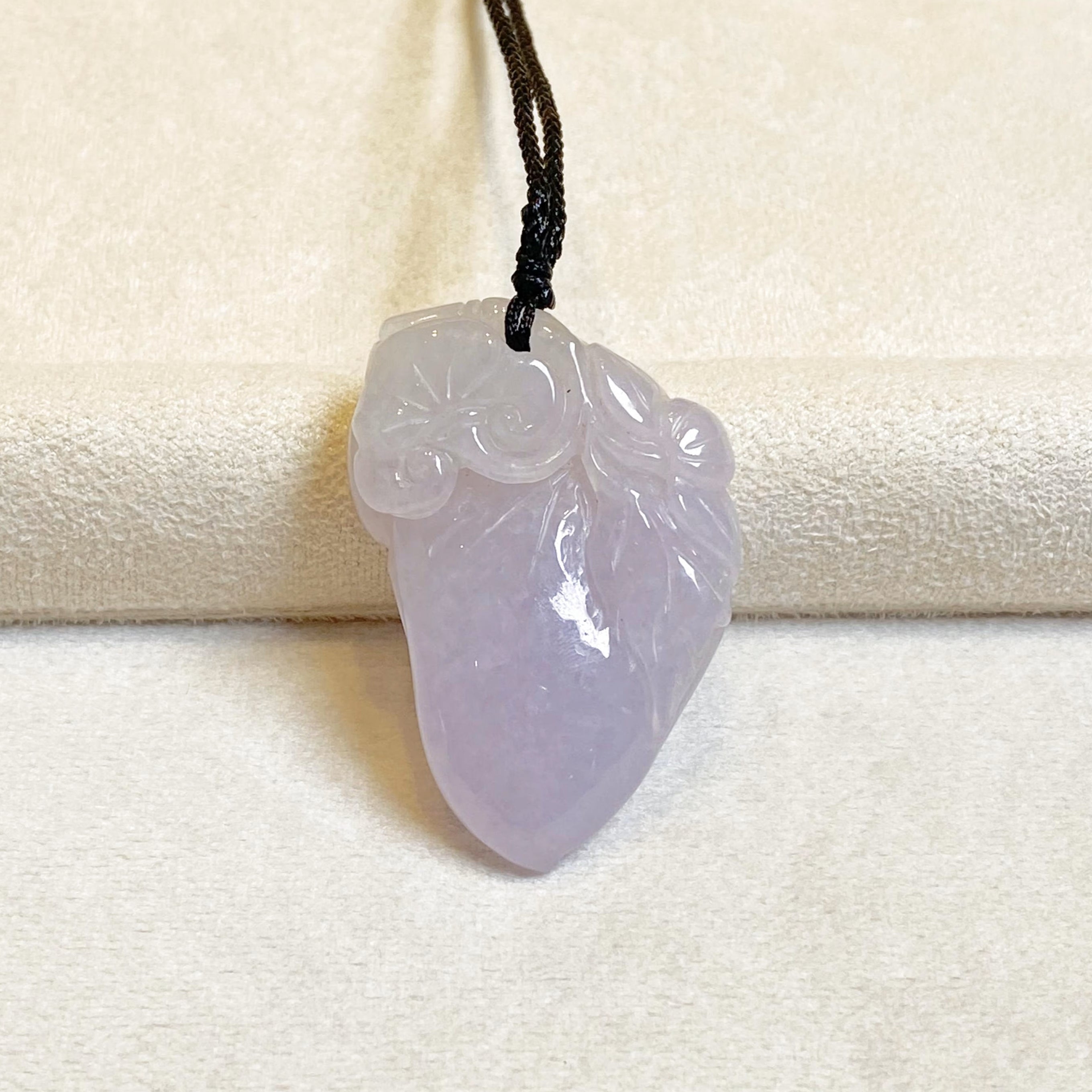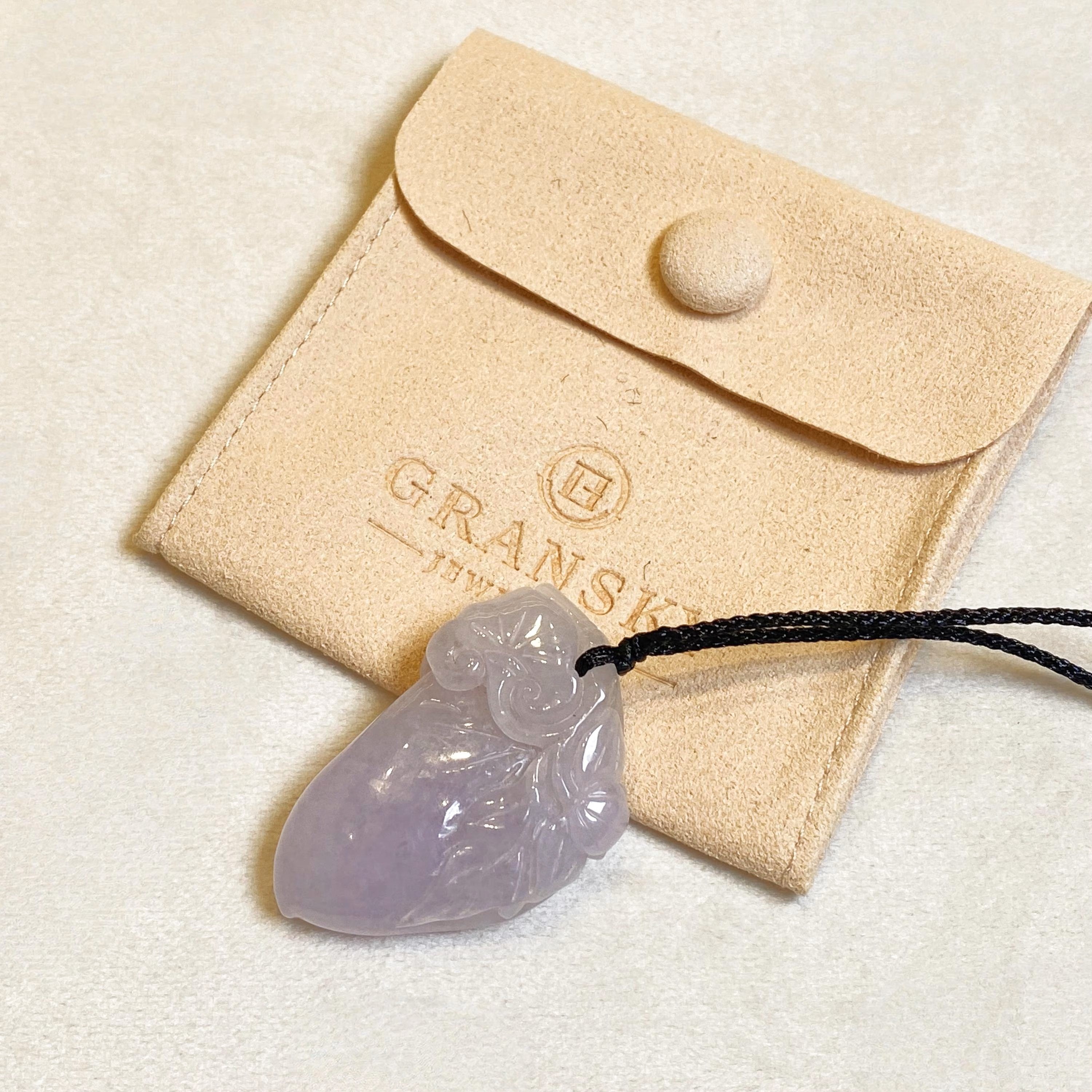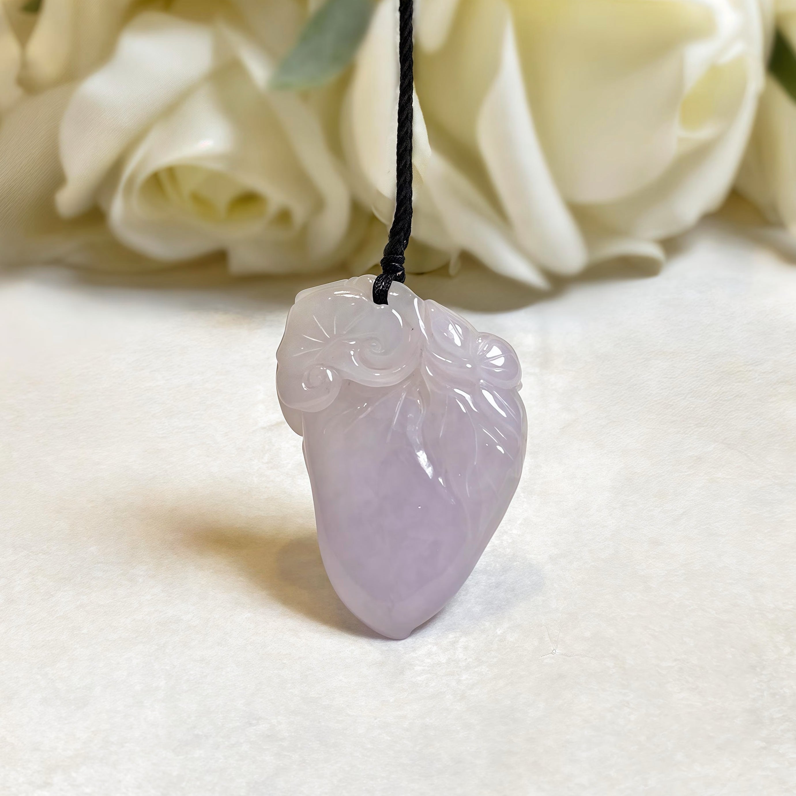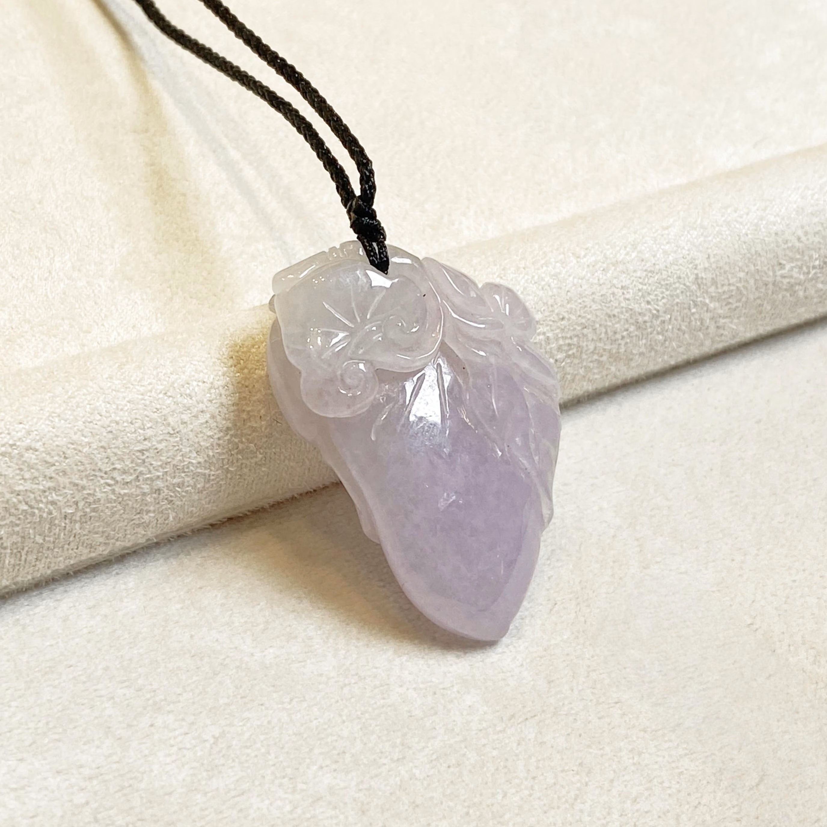 ✅This enchanting crystal like purple peach-shaped jadeite pendant embodies timeless grace with its hand-carved, organic silhouette. Suspended from a sleek, adjustable black cord, the pendant features a lustrous, polished surface that transitions seamlessly throughout the jade pendant. The natural even purple color hues and intricate carving ensure each piece is one-of-a-kind, celebrating the artistry of jade.