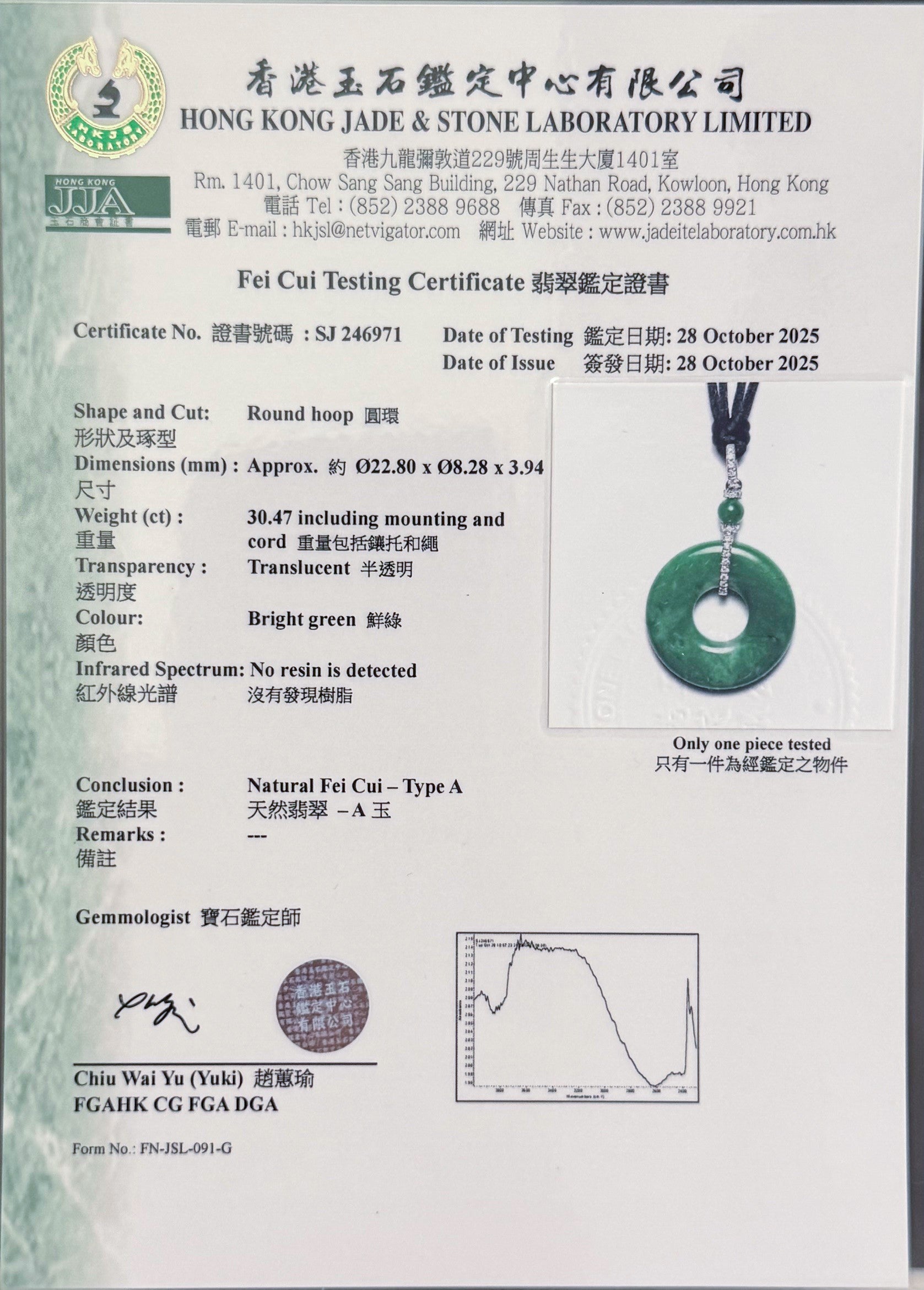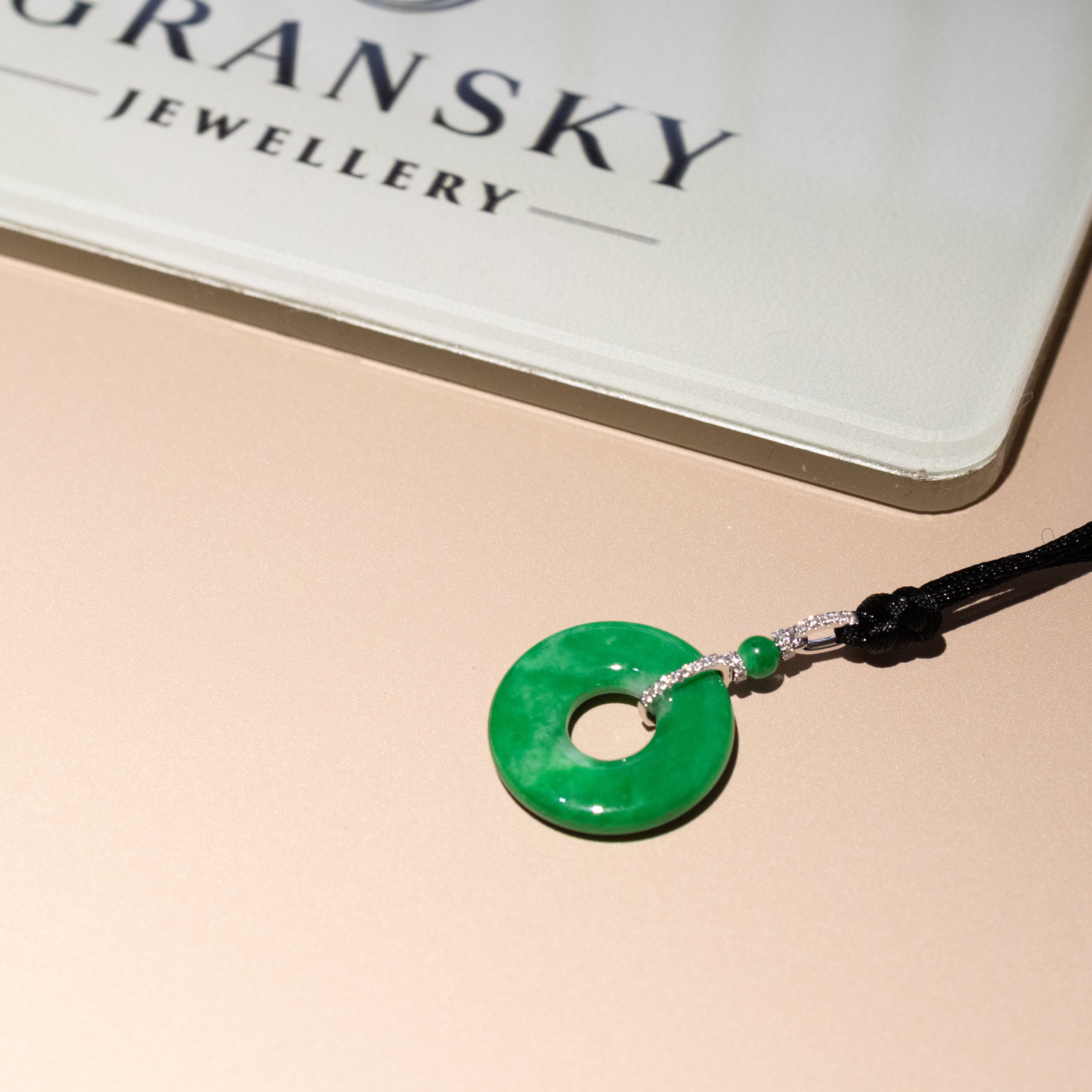 ✅This exquisite Imperial Green Jade Disc Pendant is a masterpiece of modern minimalistic elegance. The vibrant, lush green jade is meticulously carved into a smooth, round disc, suspended from a sleek 18K white gold bail adorned with dazzling diamonds. Adding a touch of refinement, a matching Imperial Green Jade bead hangs gracefully above the disc, enhancing its luxurious appeal. The pendant is paired with a black adjustable cord, ensuring a perfect fit for any wearer.