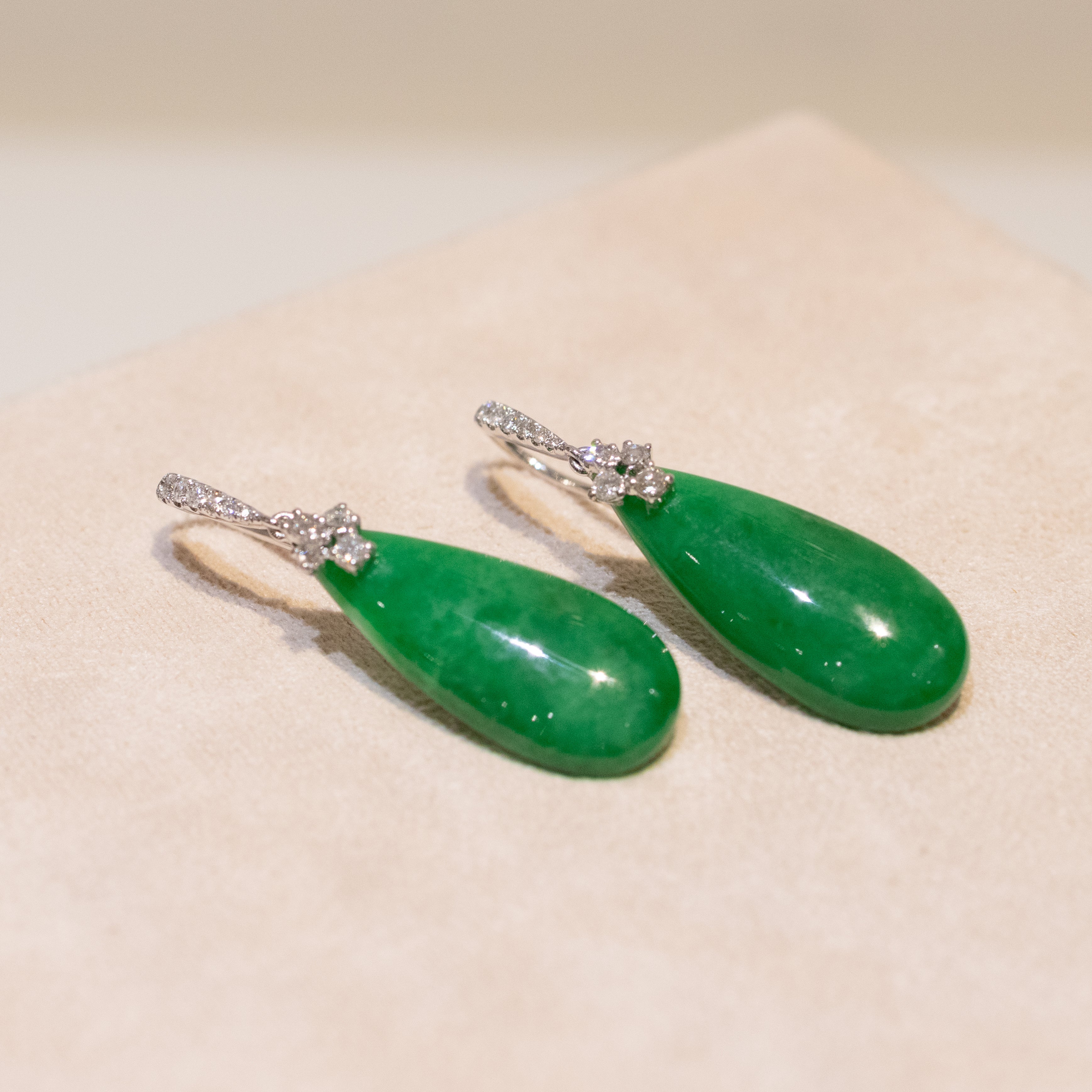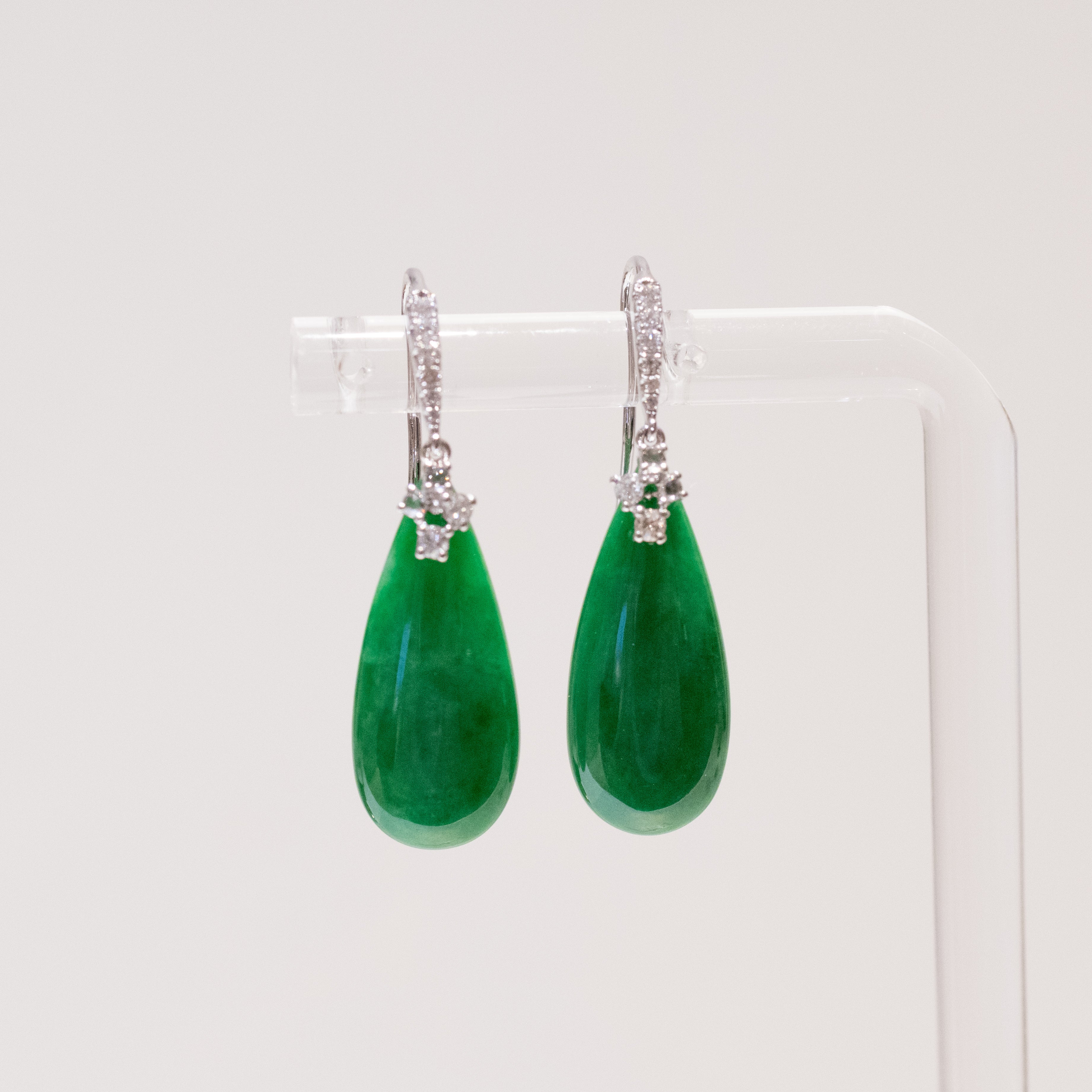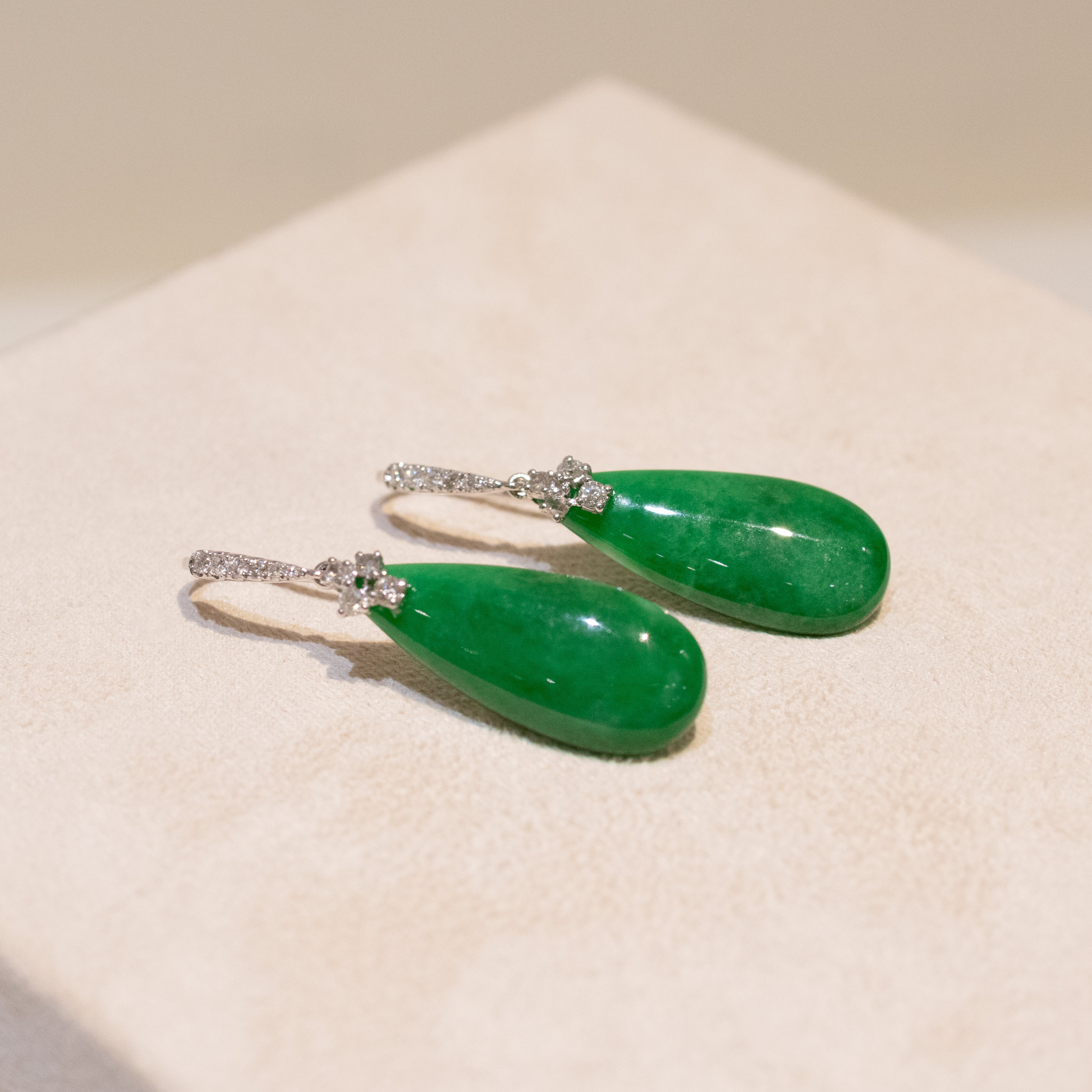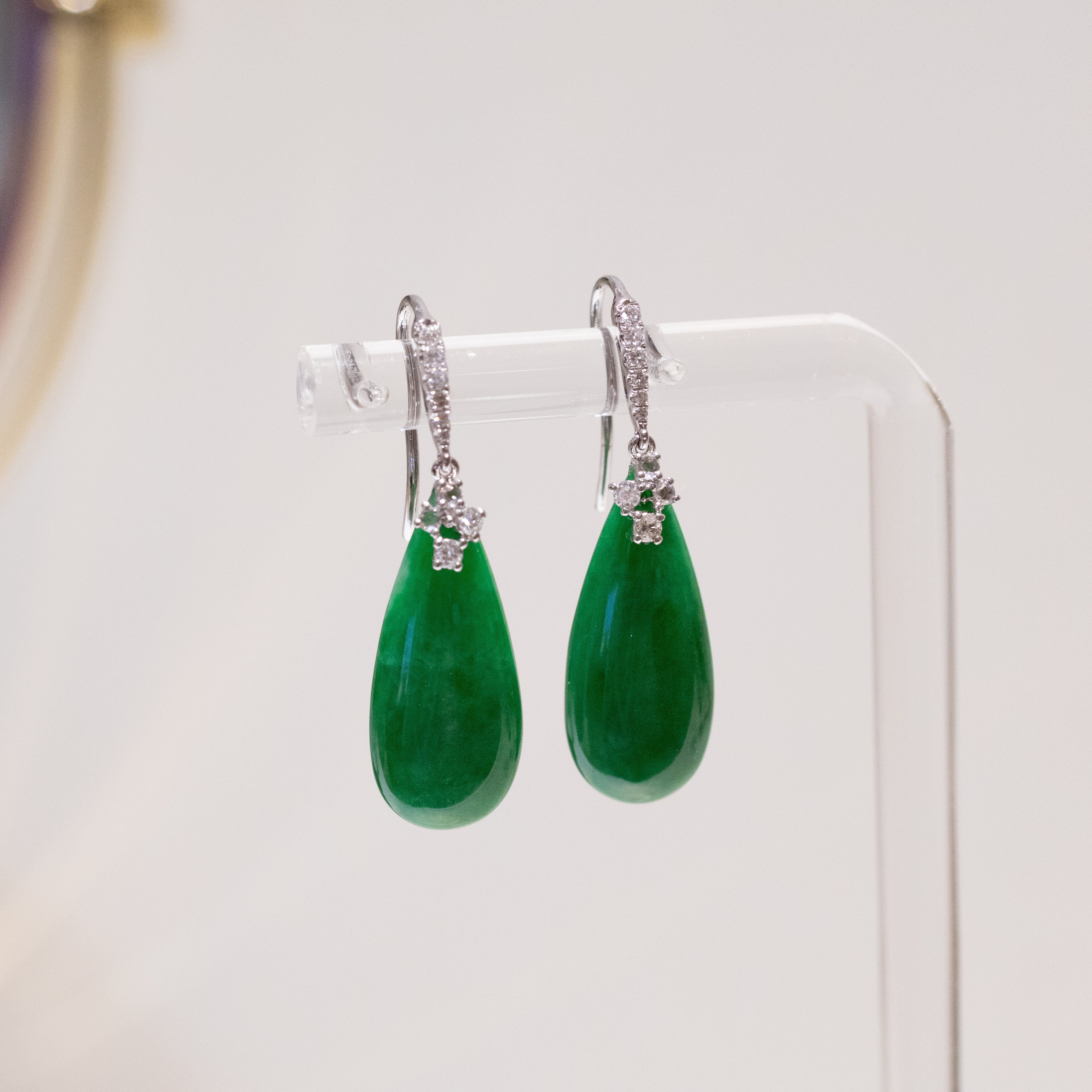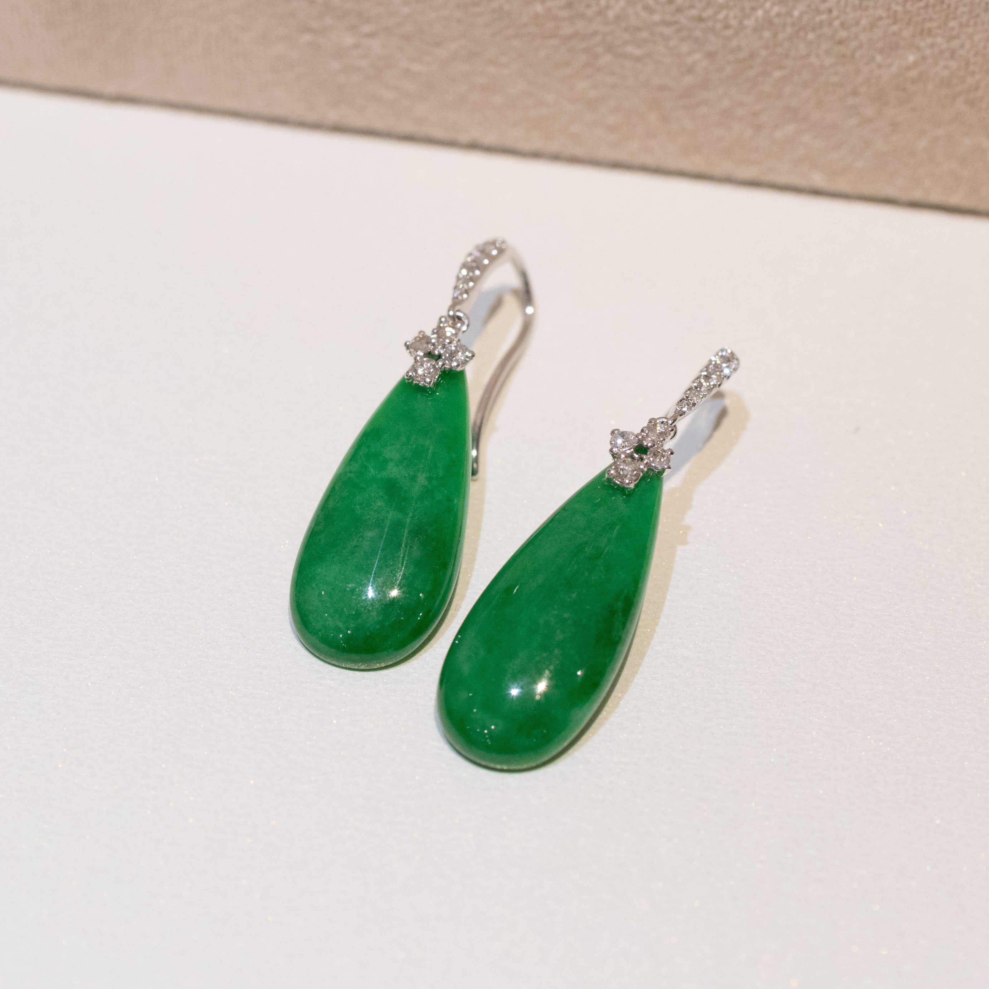 ✅These exquisite 18k white gold jade drop earrings showcase the serene beauty of natural green jade, masterfully crafted into elegant teardrop shapes. Each side is adorned with sparkling diamond accents, adding a touch of brilliance to the rich, intense imperial green hue of the jade. A set of lustrous, natural shiny diamonds set gracefully at the top enhances the earrings' sophisticated charm. The minimalist hook design ensures a seamless blend of modern elegance and timeless luxury, making these earrings a versatile addition to any jewelry collection. Perfect for both everyday wear and special occasions, they are an ideal gift for those who cherish refined, nature-inspired style.