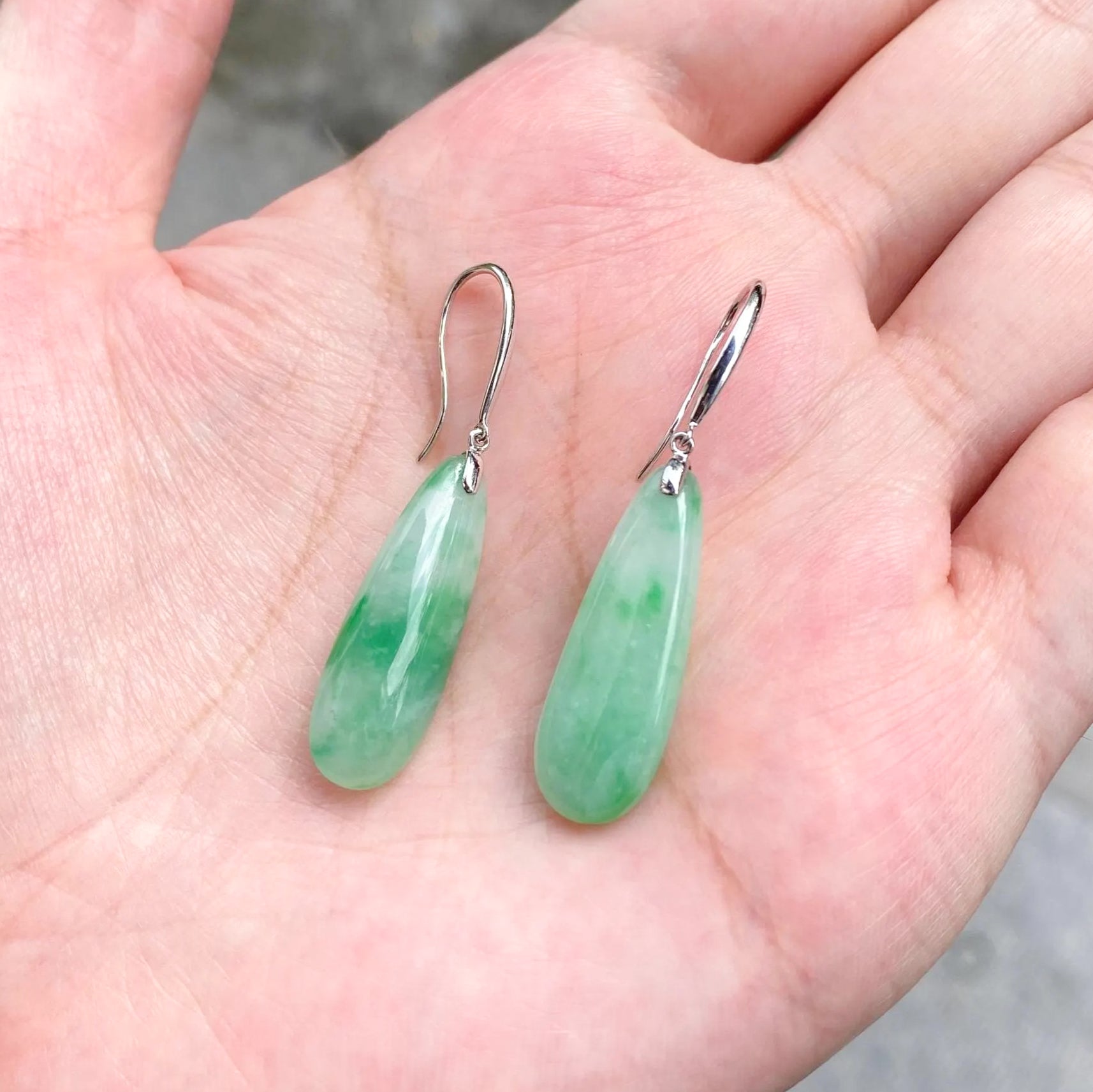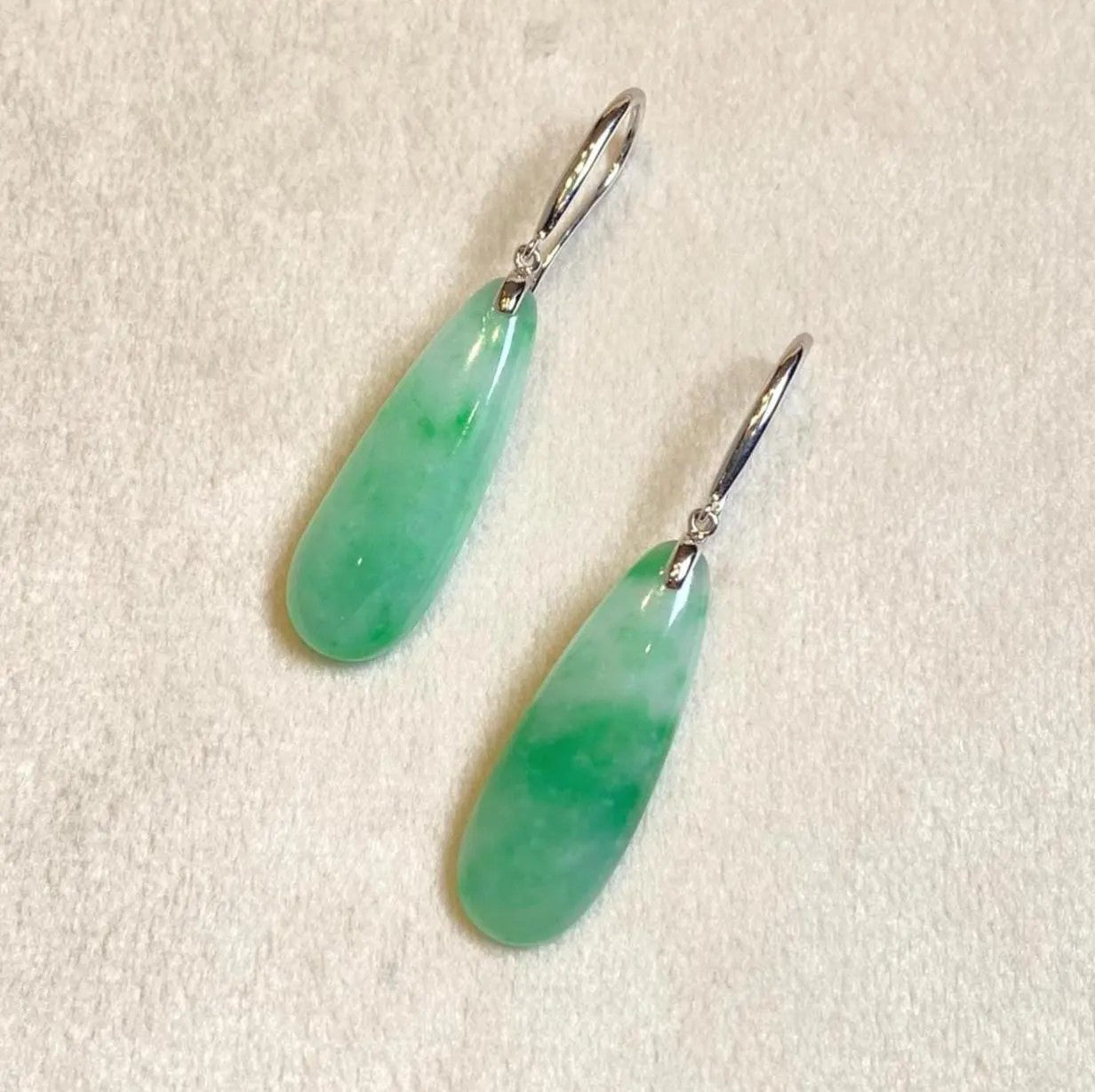 These apple green pear-shaped drop jade earrings, crafted in 18k white gold, combine elegance and sophistication with a minimalist hook design that highlights the vibrant, rich green hue of the gemstones. The timeless pear-shaped cut and luxurious gold setting create a versatile piece perfect for both casual and formal occasions, making it an ideal gift or a stunning addition to any jewelry collection for those who appreciate bold yet refined style.