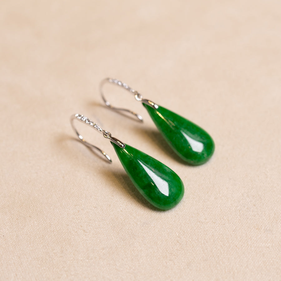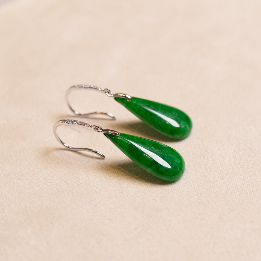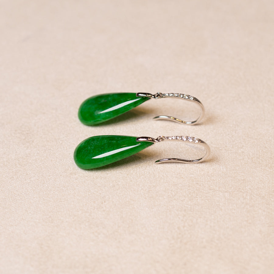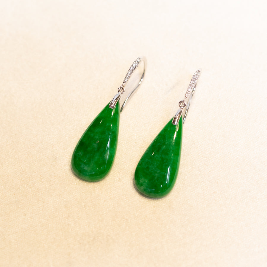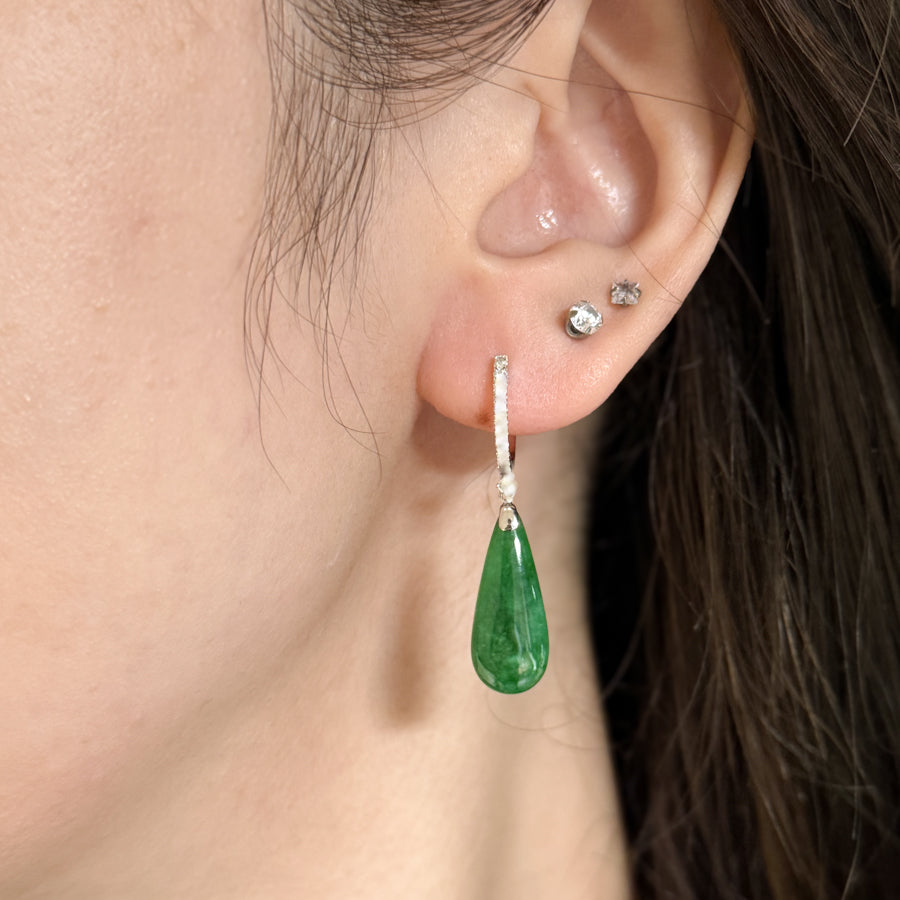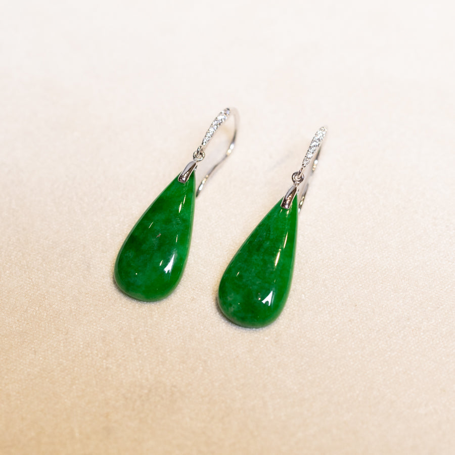 Natural Type A Jadeite Pear Shape Earrings in 18k White Gold and Diamonds.