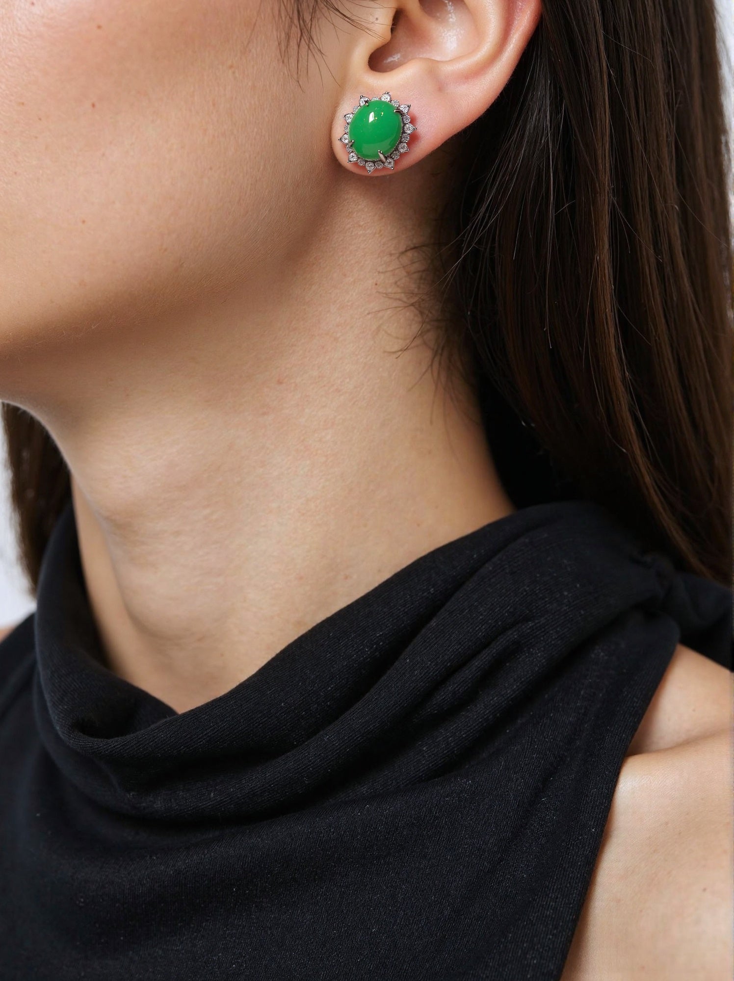 ✅Our Apple Green Jadeite Stud Earrings, meticulously crafted from natural Type A Burmese jadeite, bring a touch of timeless elegance to any occasion. Each cabochon-shaped jade, with its captivating apple green hue, sits beautifully in 18k white gold, surrounded by sparkling round-cut natural diamonds for added brilliance. These earrings, designed for the discerning woman, embody sophistication and charm while reflecting nature’s finest beauty. Perfect for formal events or casual outings, they serve as more than just accessories—they’re a celebration of individuality and style. Whether treating yourself or gifting a loved one, these exquisite treasures promise to leave a lasting impression and become cherished keepsakes.