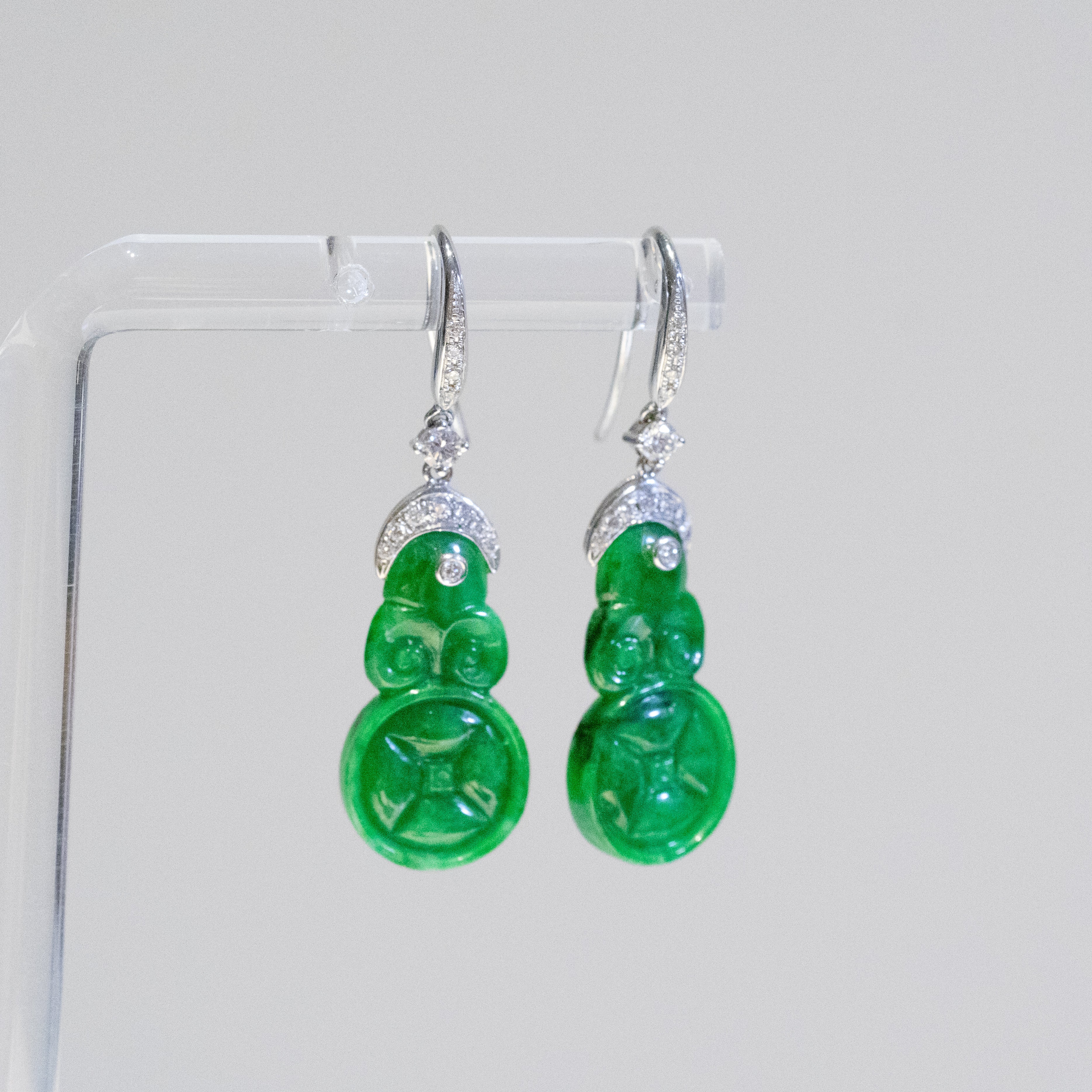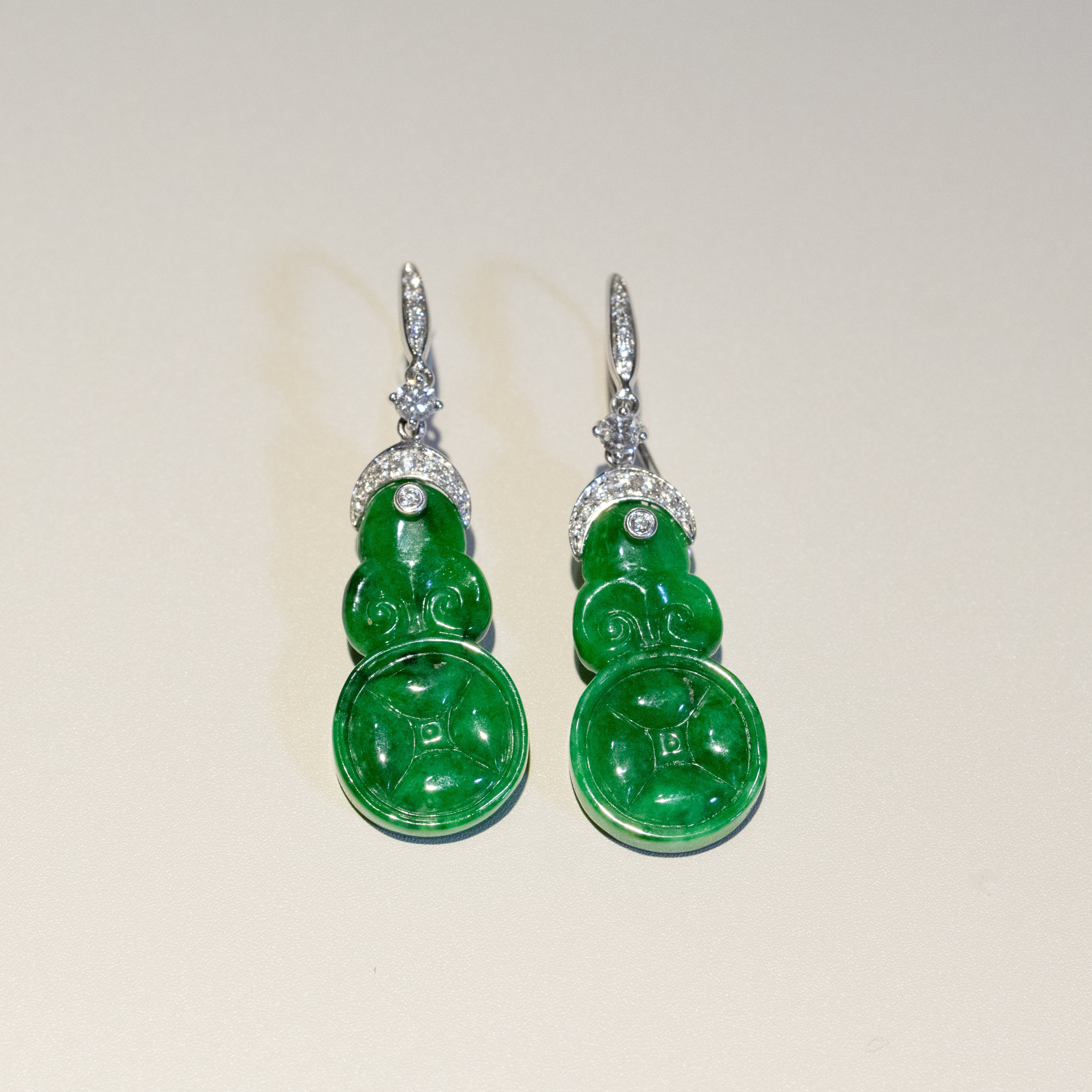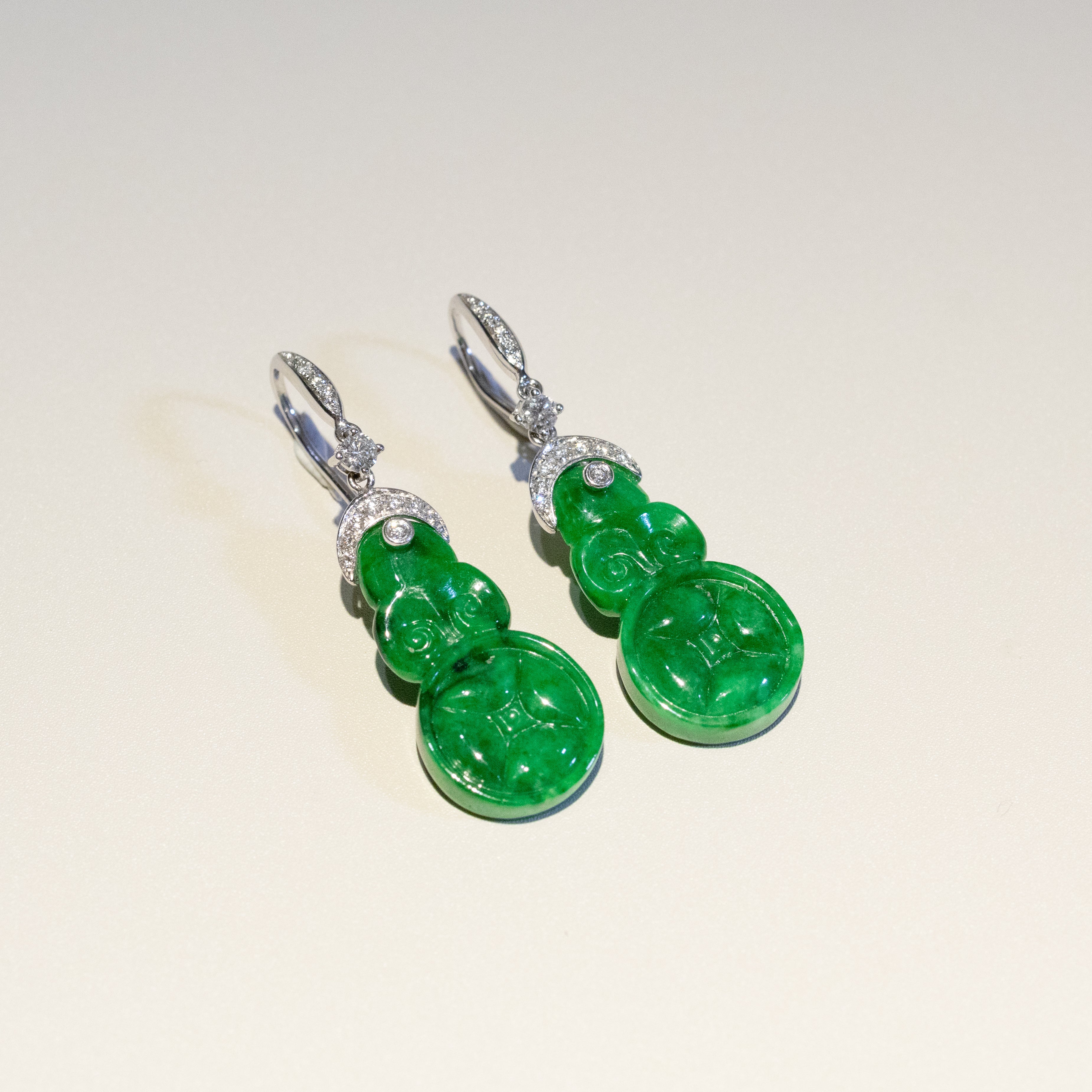 Each jade piece displays a vibrant imperial green tone — the most prized color in jadeite — with a smooth, luminous polish that highlights the stone’s natural beauty. The jade is elegantly set in 18K solid white gold and accented with sparkling diamonds, creating a refined balance between traditional craftsmanship and modern luxury.