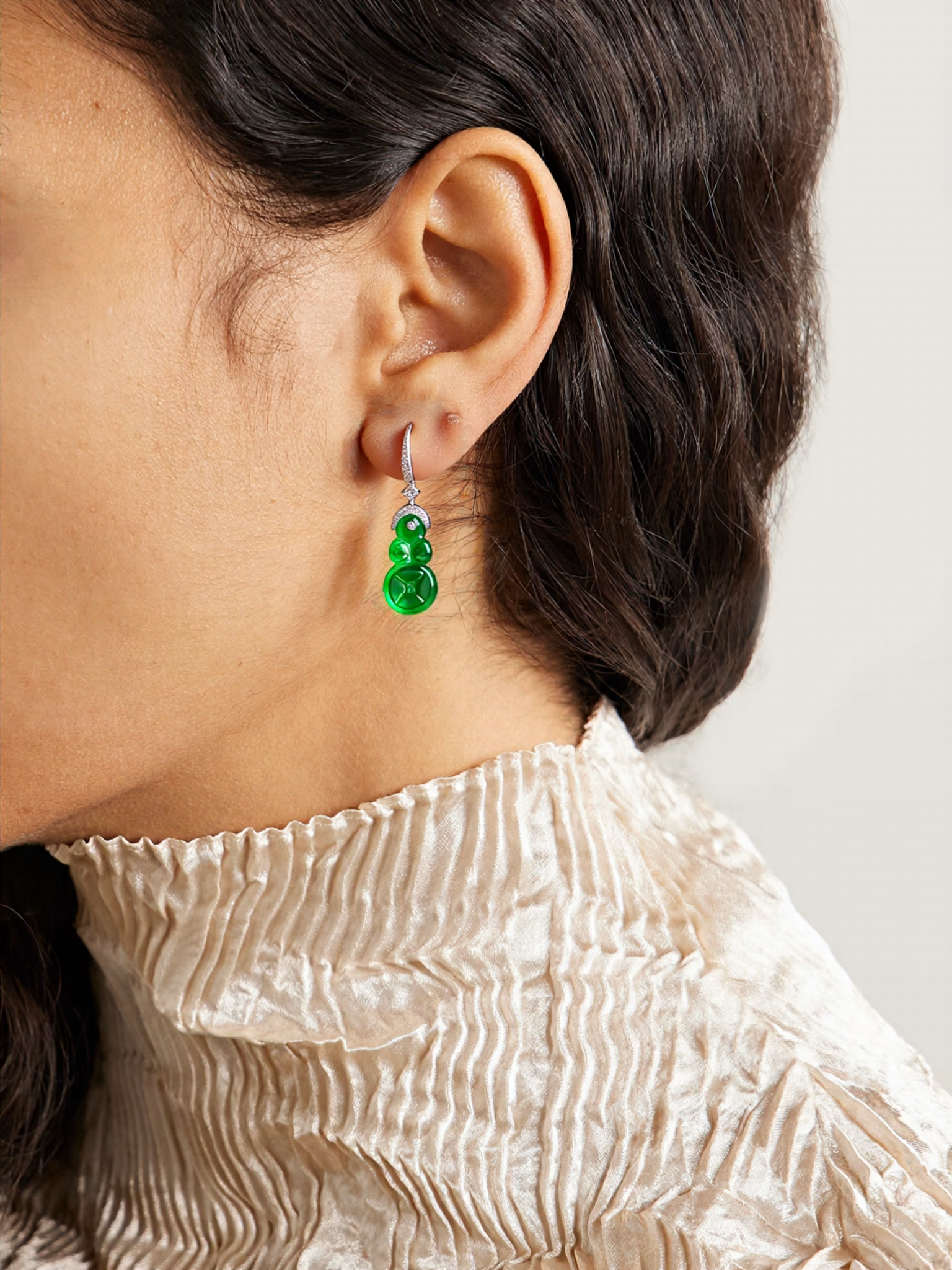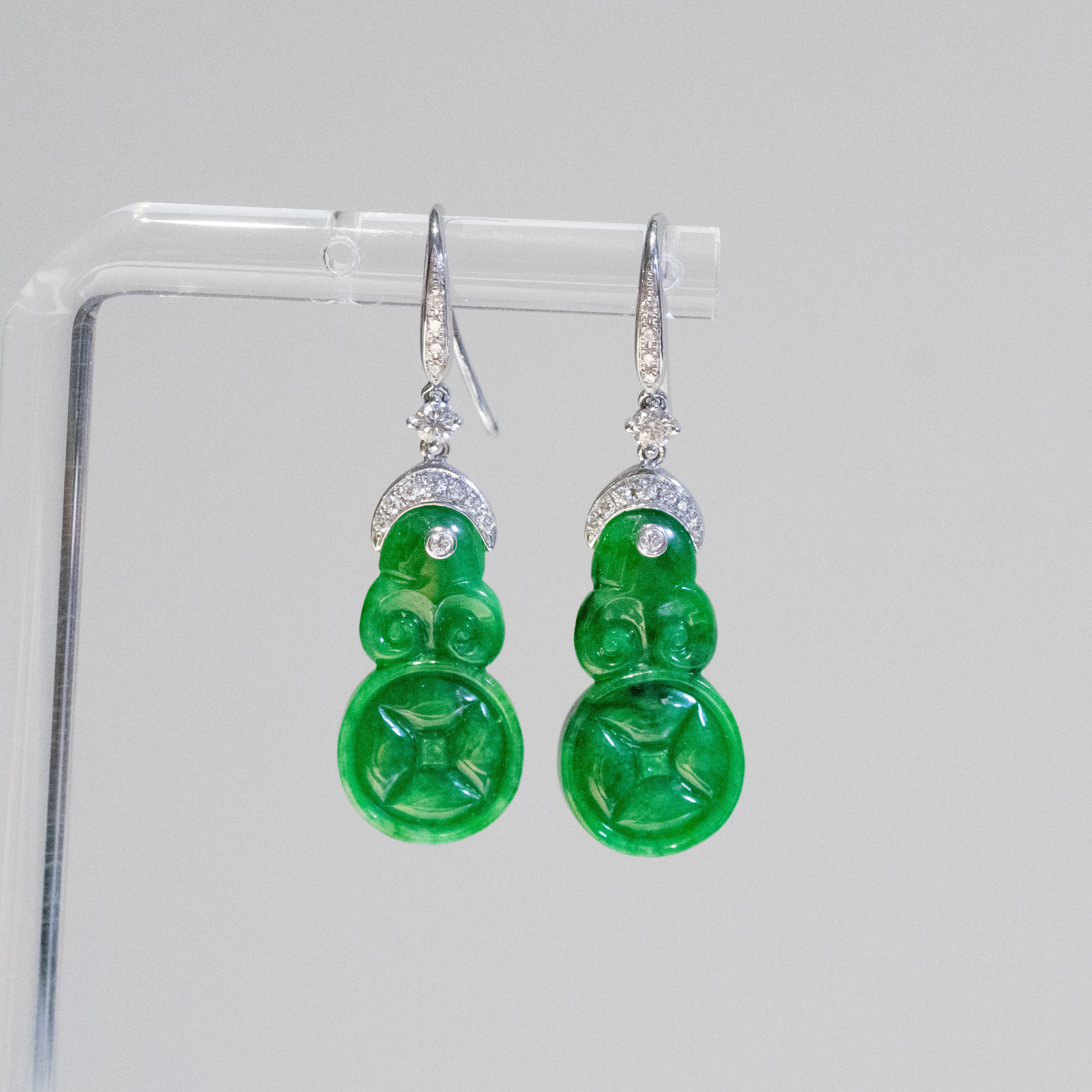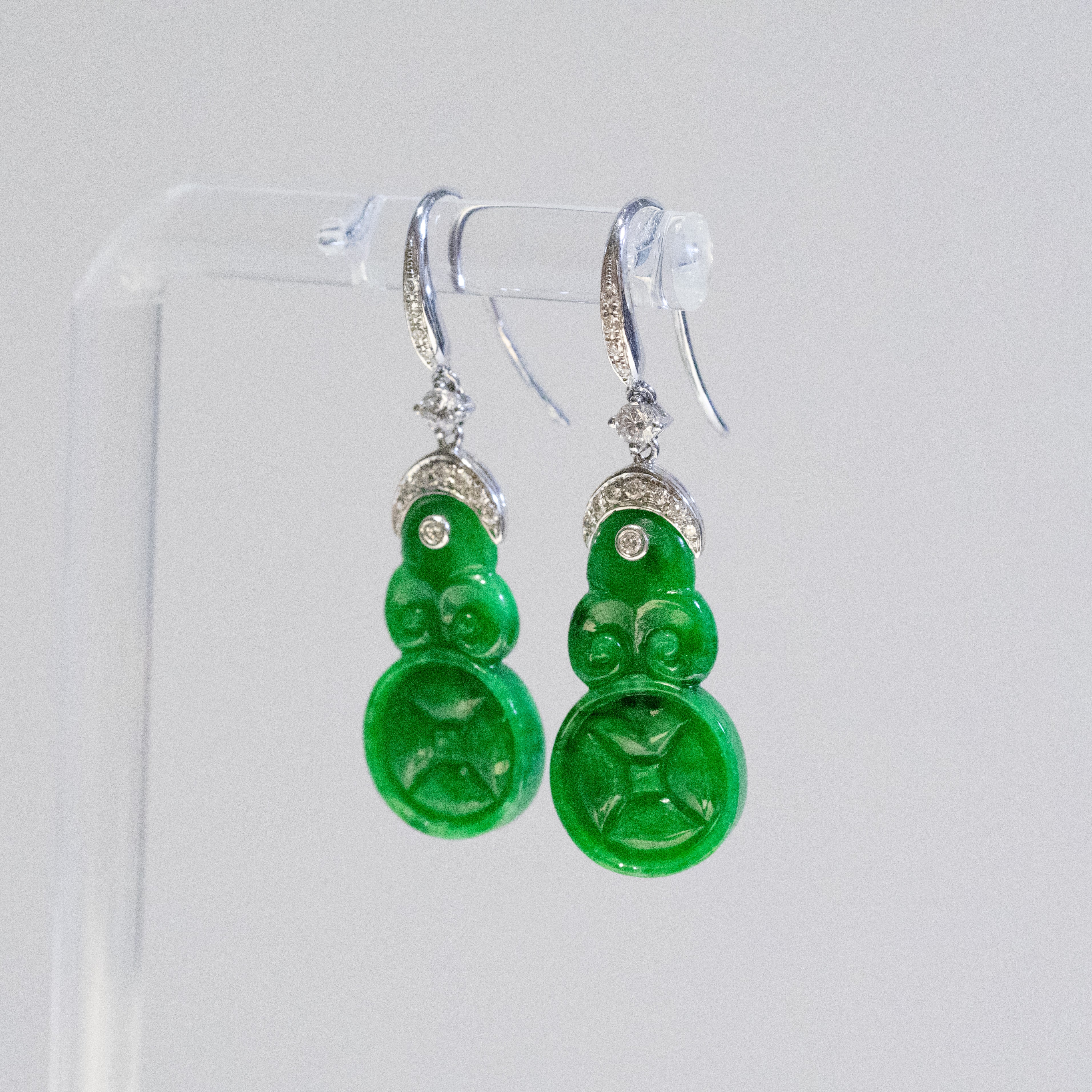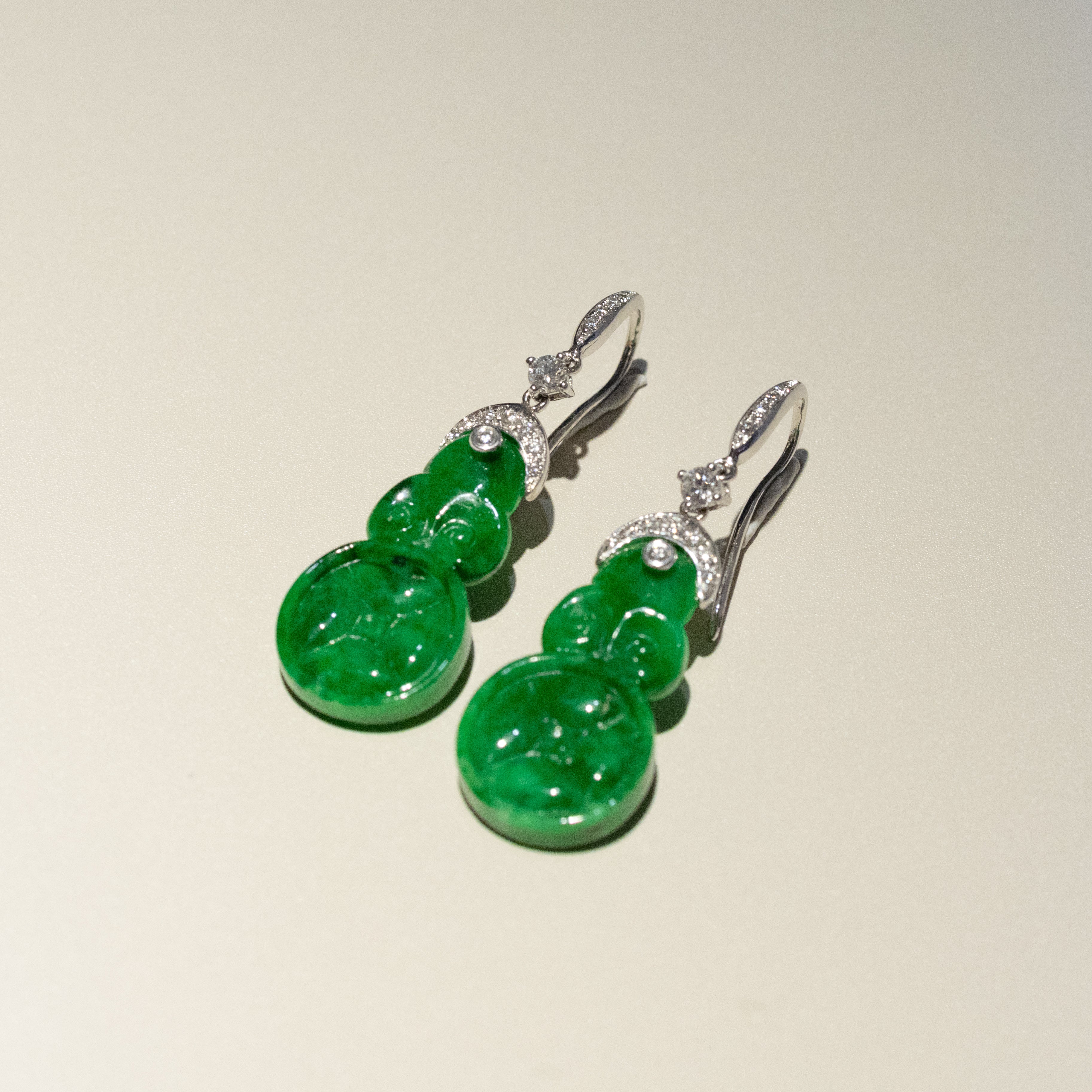 Each jade piece displays a vibrant imperial green tone — the most prized color in jadeite — with a smooth, luminous polish that highlights the stone’s natural beauty. The jade is elegantly set in 18K solid white gold and accented with sparkling diamonds, creating a refined balance between traditional craftsmanship and modern luxury.