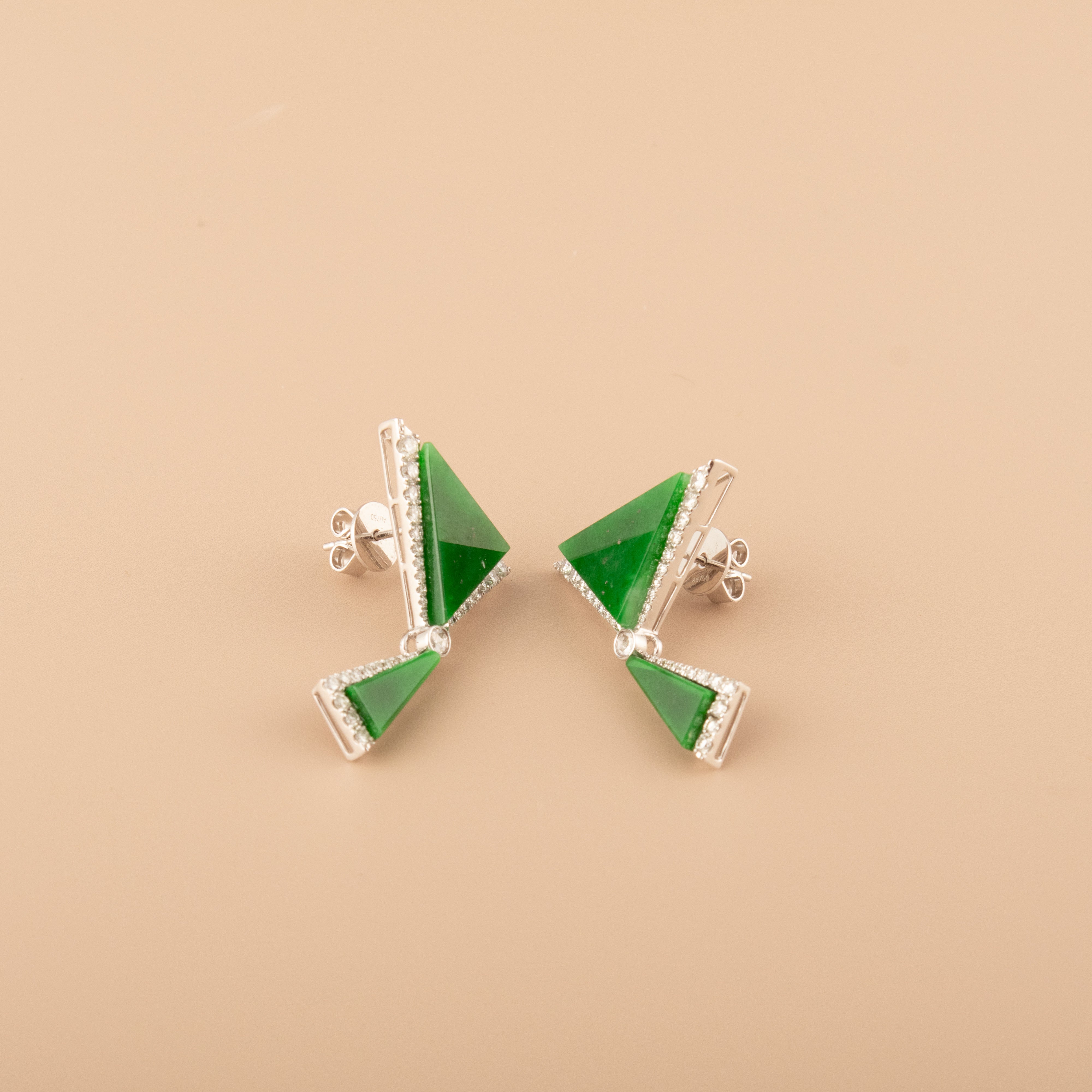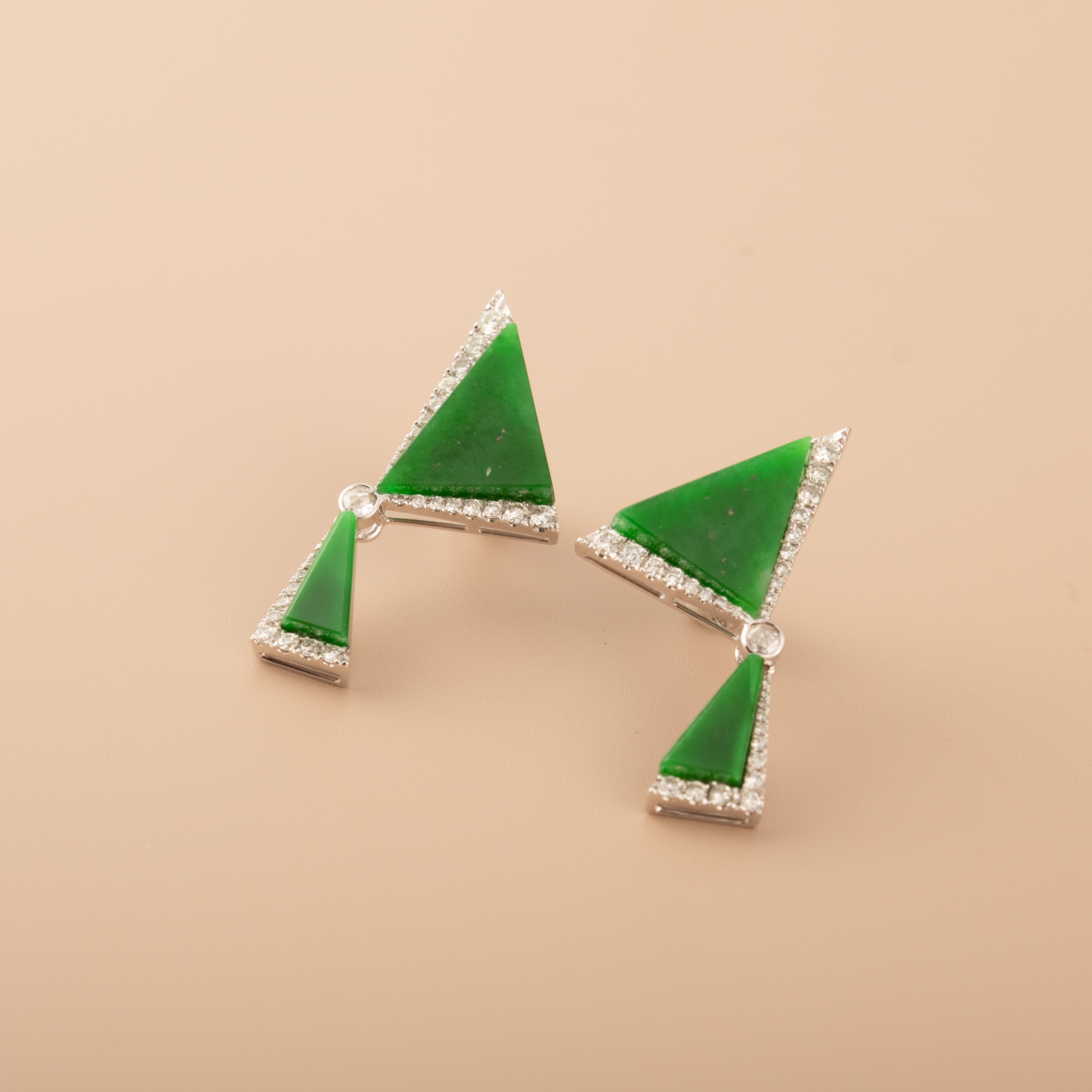 These exquisite earrings feature 18k white gold adorned with sparkling diamonds. Each earring is elegantly designed with two triangular jade pieces, creating a striking contrast and a contemporary look. Perfect for any occasion, they embody both sophistication and unique style.