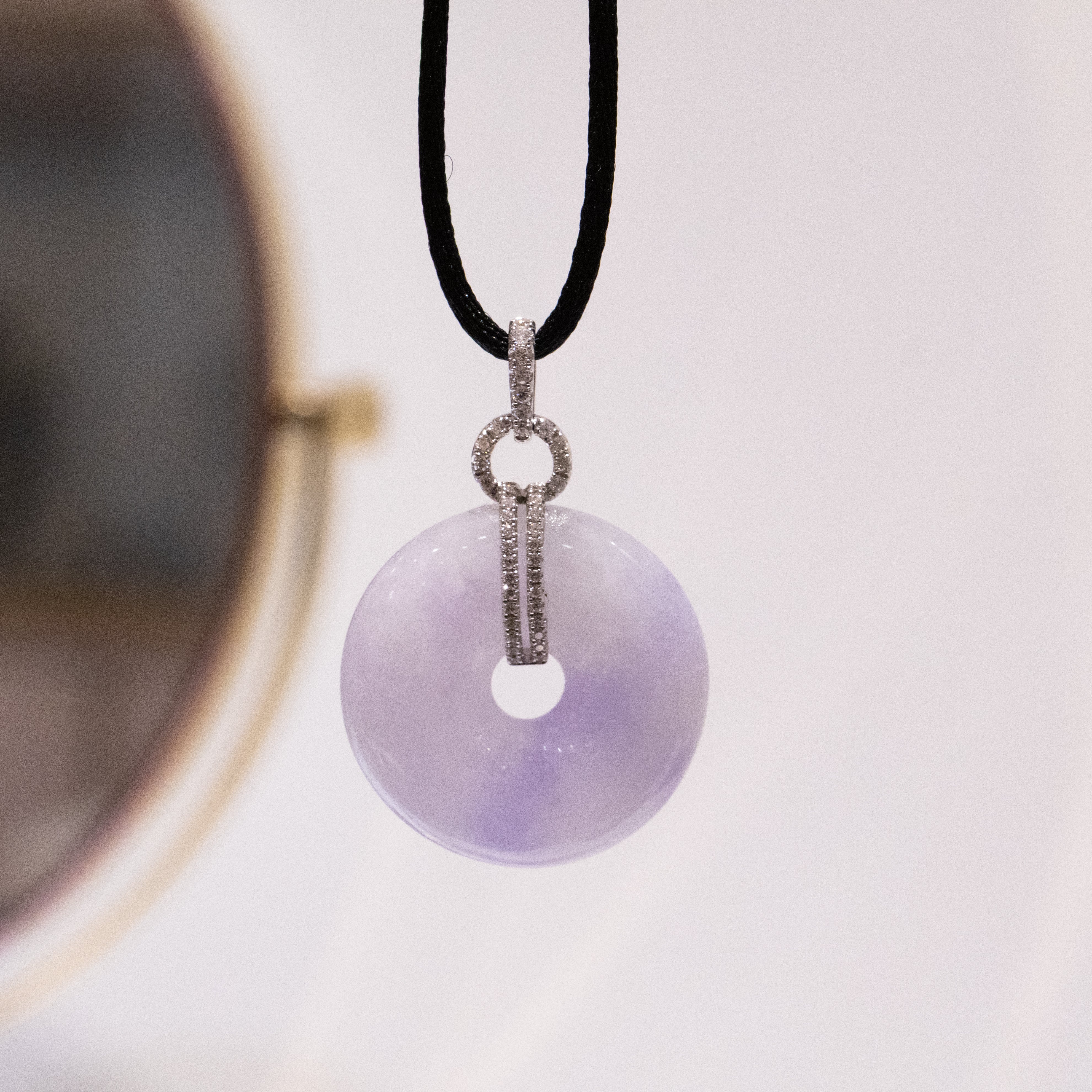 ✅This exquisite Purple Jade Donut Pendant Necklace blends timeless elegance with modern sophistication. Crafted from vibrant, rich purple jade, the pendant is expertly carved into a smooth, donut-shaped disc, measuring 24mm in width and 5.5mm in thickness. It is gracefully suspended from an 18K white gold bail, encrusted with sparkling diamonds that enhance its opulent charm. With a total length of 35mm including the bail, this pendant comes with a black adjustable cord for a customizable, comfortable fit. For an elevated look, an optional 18K white gold necklace can be paired with the jade pendant.