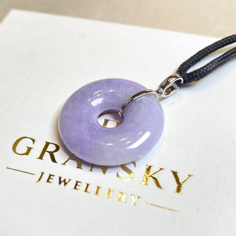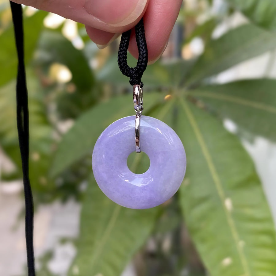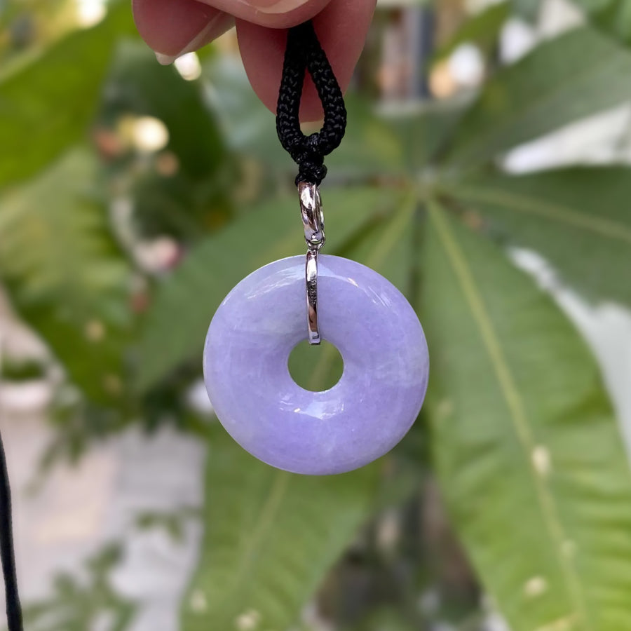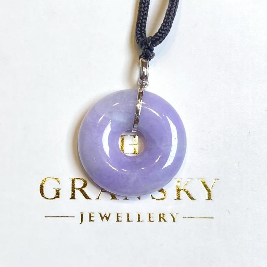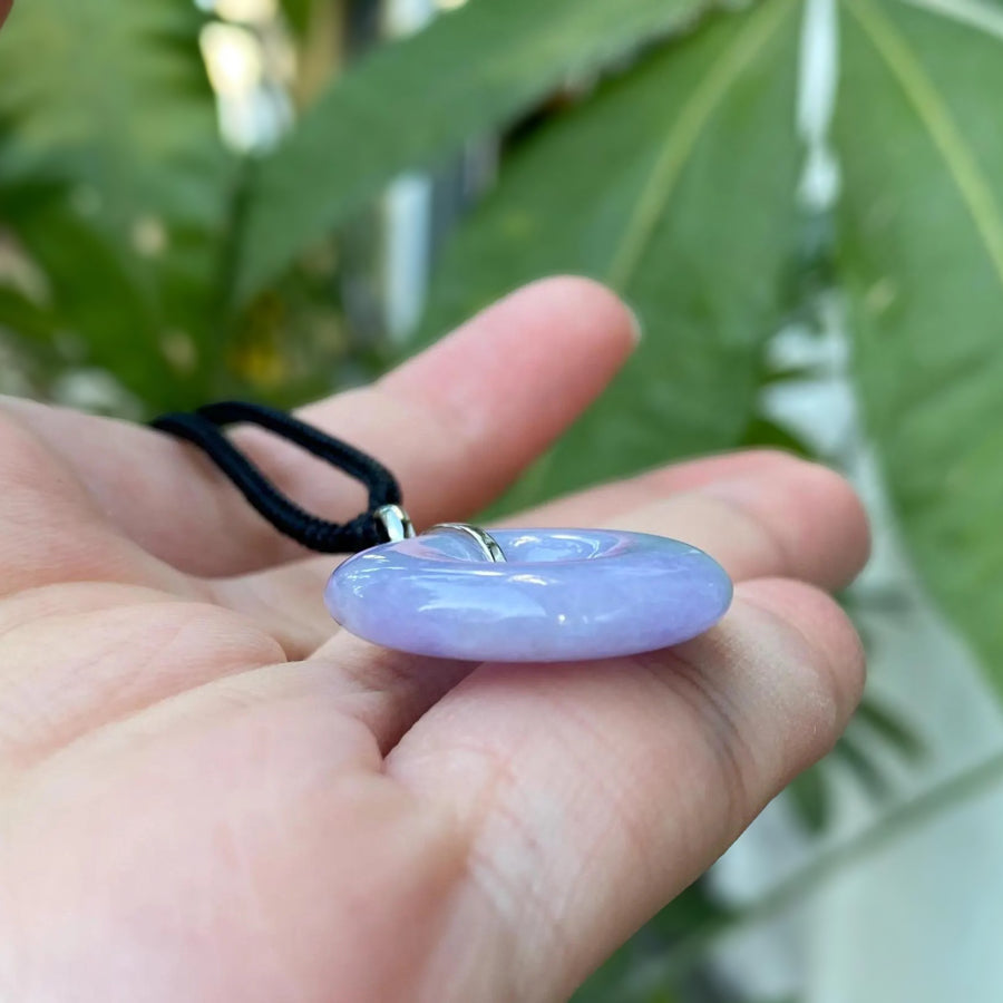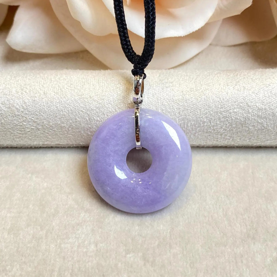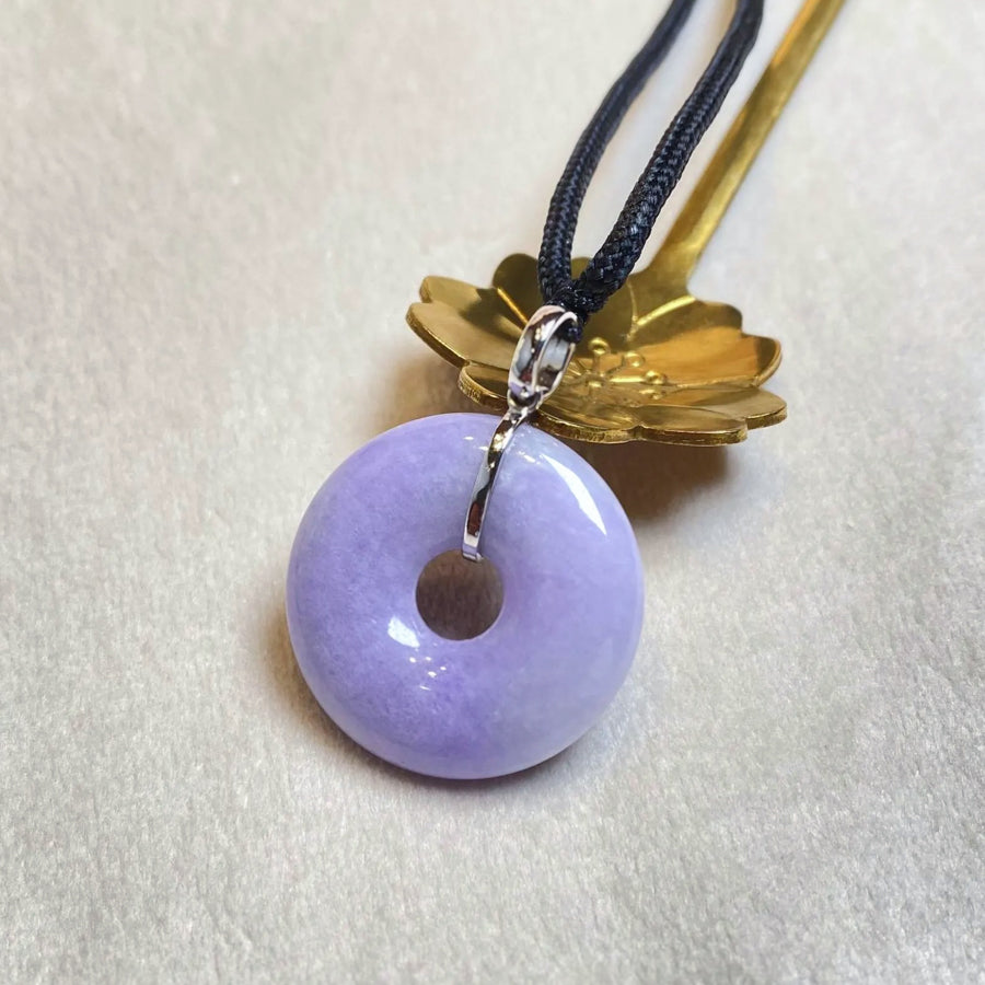 ✅This stunning purple donut jade pendant features natural untreated Type-A Burmese jadeite. It showcases vibrant color intensity and distribution, highlighting the beauty of the gemstone. Handcrafted with care, this pendant is set in an 18k white gold bail, ensuring exceptional craftsmanship and individuality. This captivating piece beautifully embodies elegance and the rich spirit of nature, making it a perfect addition to any jewelry collection.