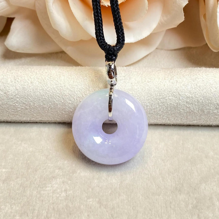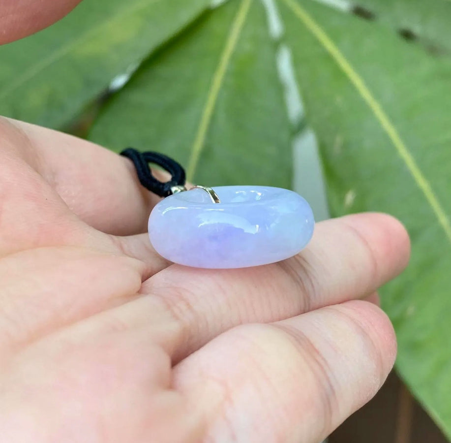 ✅This stunning purple donut jade pendant features natural untreated Type-A Burmese jadeite. It showcases vibrant color intensity and distribution, highlighting the beauty of the gemstone. Handcrafted with care, this pendant is set in an 18k white gold bail, ensuring exceptional craftsmanship and individuality. This captivating piece beautifully embodies elegance and the rich spirit of nature, making it a perfect addition to any jewelry collection.