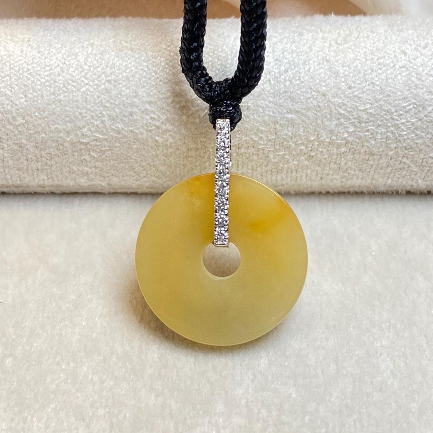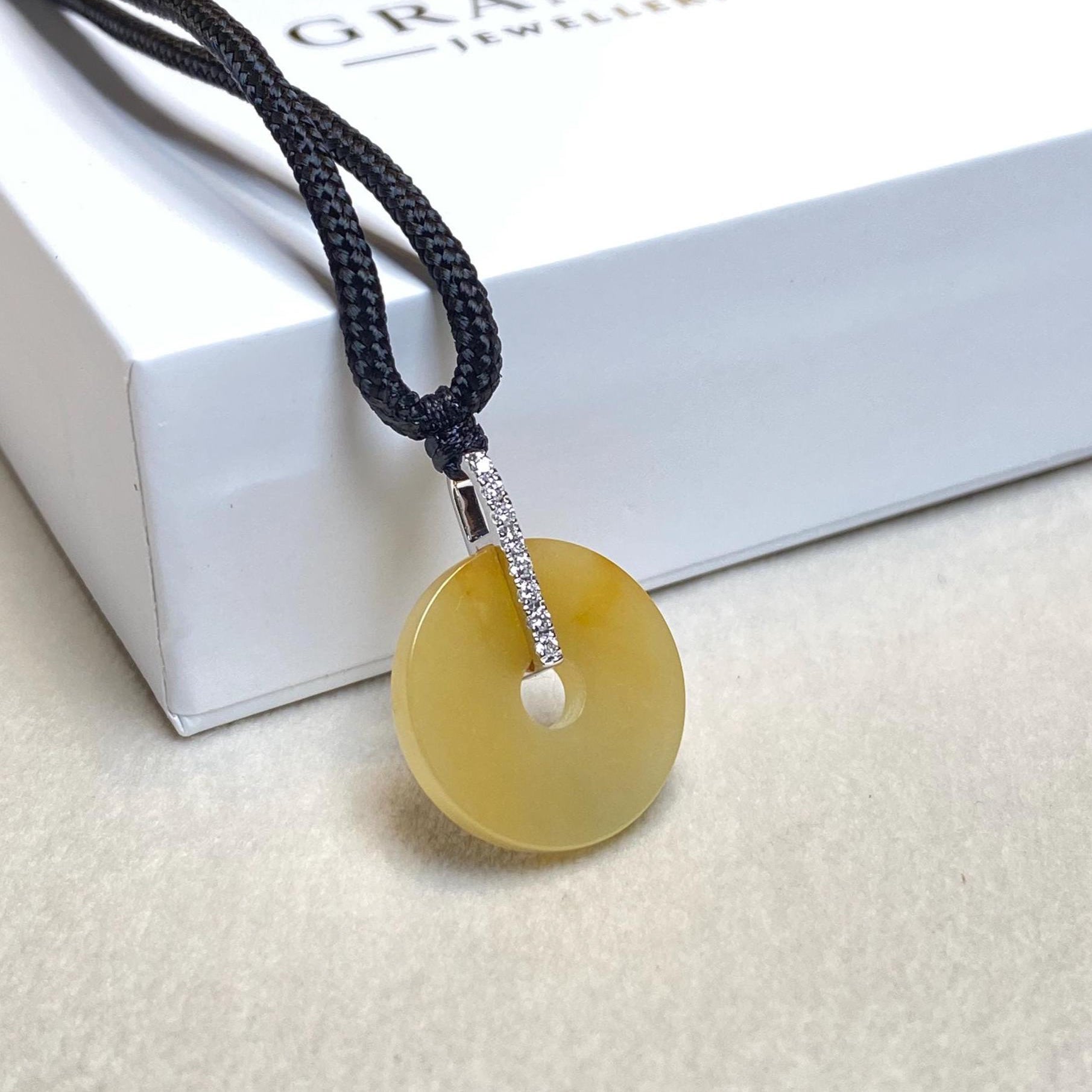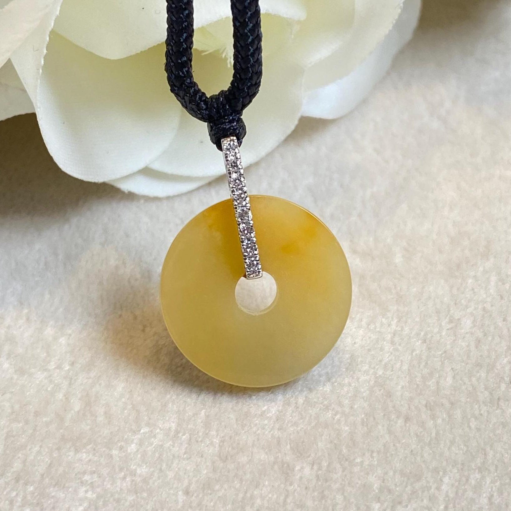 ✅This exquisite Orange/Brown Jade Donut Pendant Necklace blends timeless elegance with modern sophistication. Crafted from vibrant, rich purple jade, the pendant is expertly carved into a smooth, donut-shaped disc, measuring 17.5mm in width and 3mm in thickness. It is gracefully suspended from an 18K white gold bail, encrusted with sparkling diamonds that enhance its opulent charm. With a total length of 23.1mm including the bail, this pendant comes with a black adjustable cord for a customizable, comfortable fit. For an elevated look, an optional 18K white gold necklace can be paired with the jade pendant.