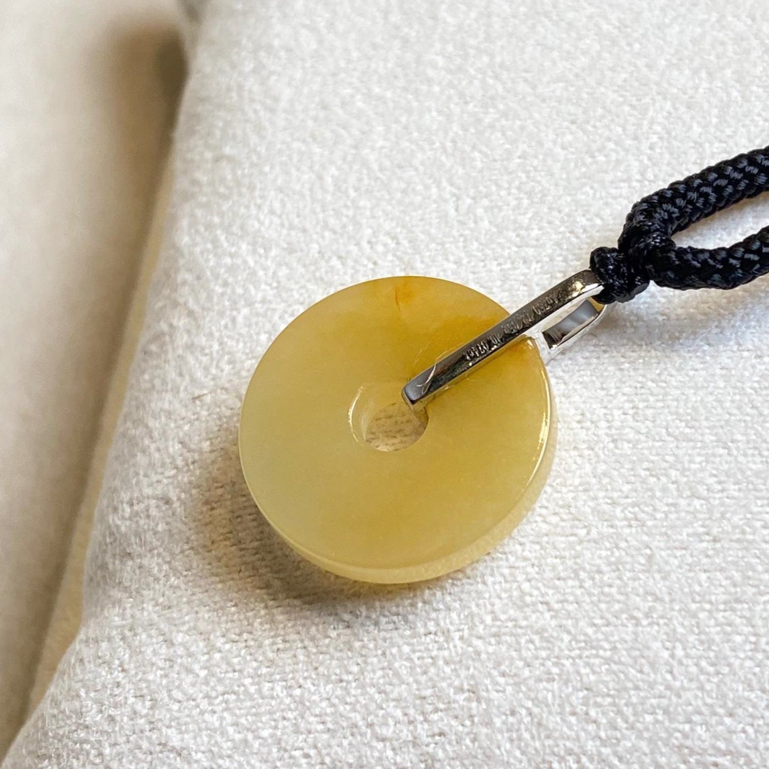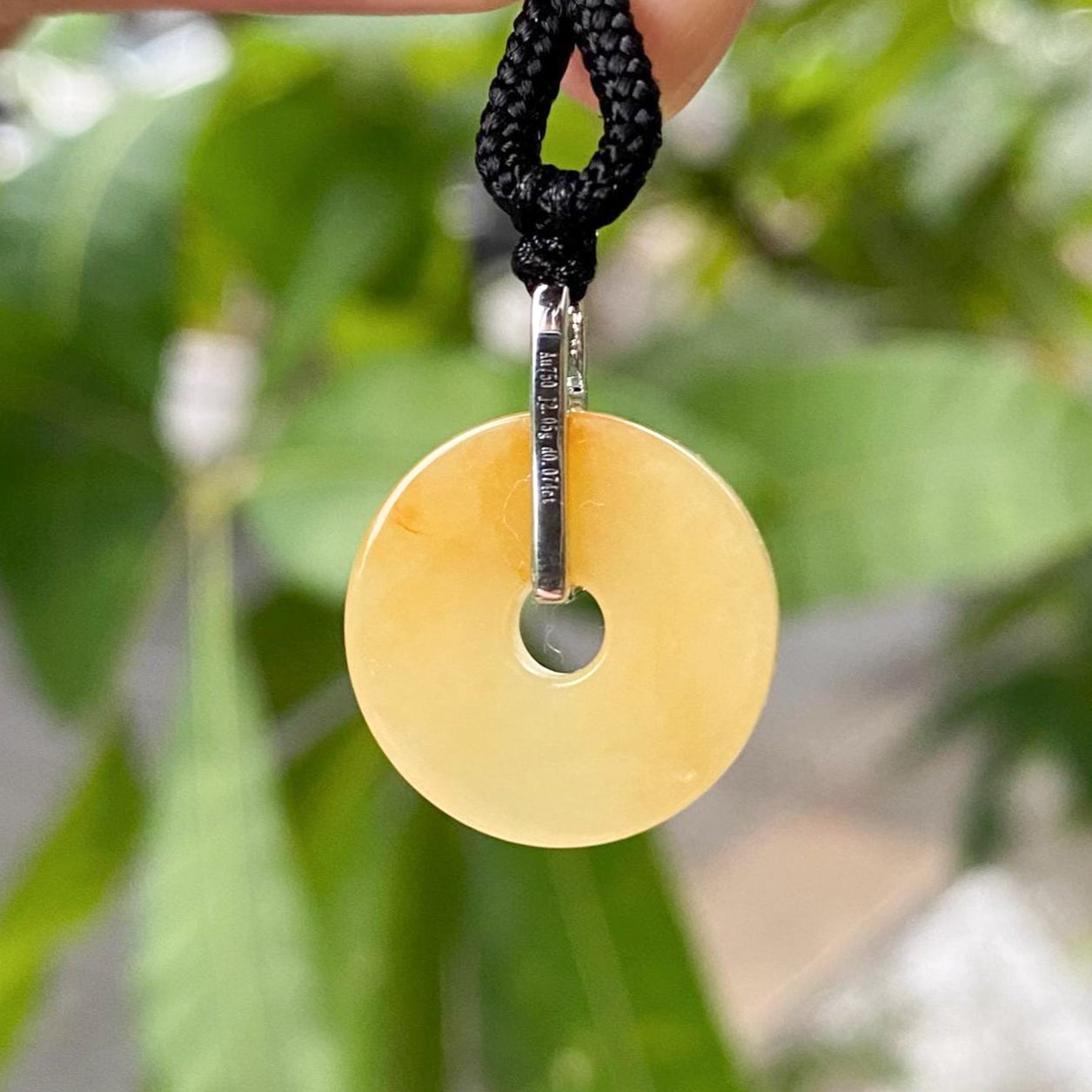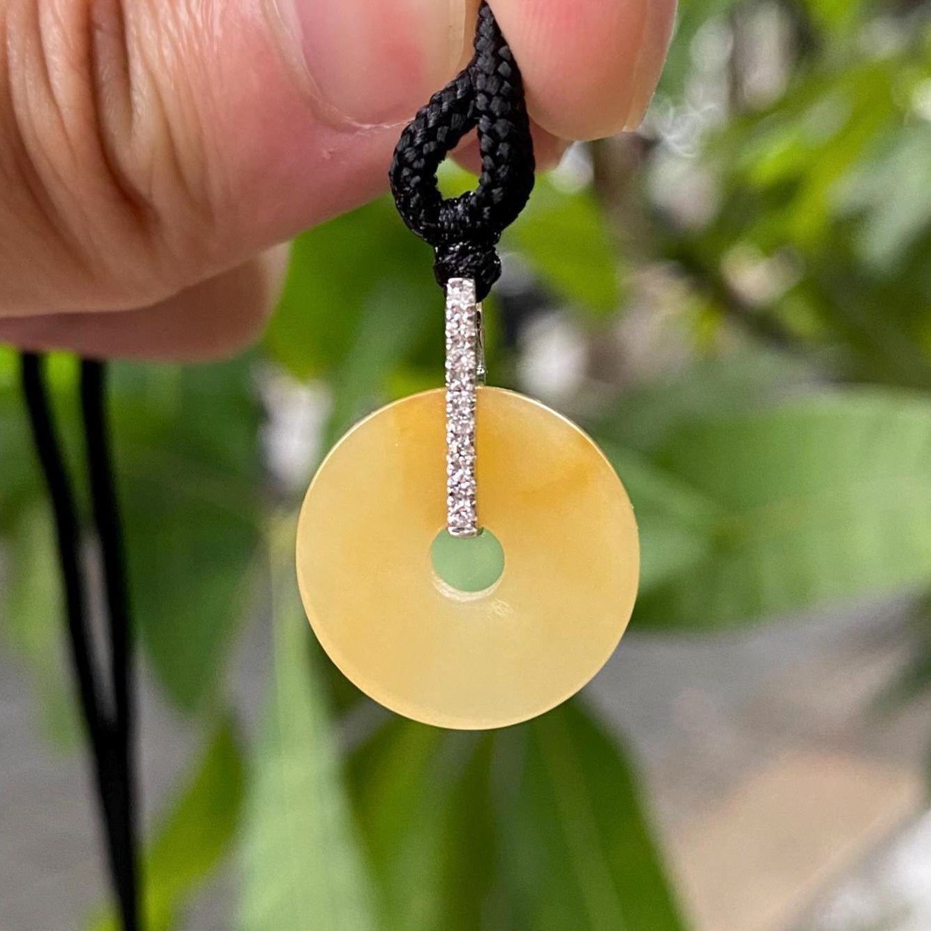 ✅This exquisite Orange/Brown Jade Donut Pendant Necklace blends timeless elegance with modern sophistication. Crafted from vibrant, rich purple jade, the pendant is expertly carved into a smooth, donut-shaped disc, measuring 17.5mm in width and 3mm in thickness. It is gracefully suspended from an 18K white gold bail, encrusted with sparkling diamonds that enhance its opulent charm. With a total length of 23.1mm including the bail, this pendant comes with a black adjustable cord for a customizable, comfortable fit. For an elevated look, an optional 18K white gold necklace can be paired with the jade pendant.