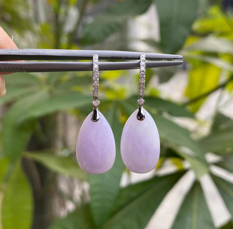 ✅A pair of exquisite teardrop-shaped earrings features natural, genuine purple jade set in 18k white gold, beautifully complemented by shimmering diamonds. The intense hue of the jade radiates sophistication, while the diamonds enhance the elegance of the design. These earrings make a bold statement of style, perfect for elevating your look at events or adding flair to casual outfits. Ideal as a treat for yourself or a special gift, they embody timeless elegance and are designed to be cherished.