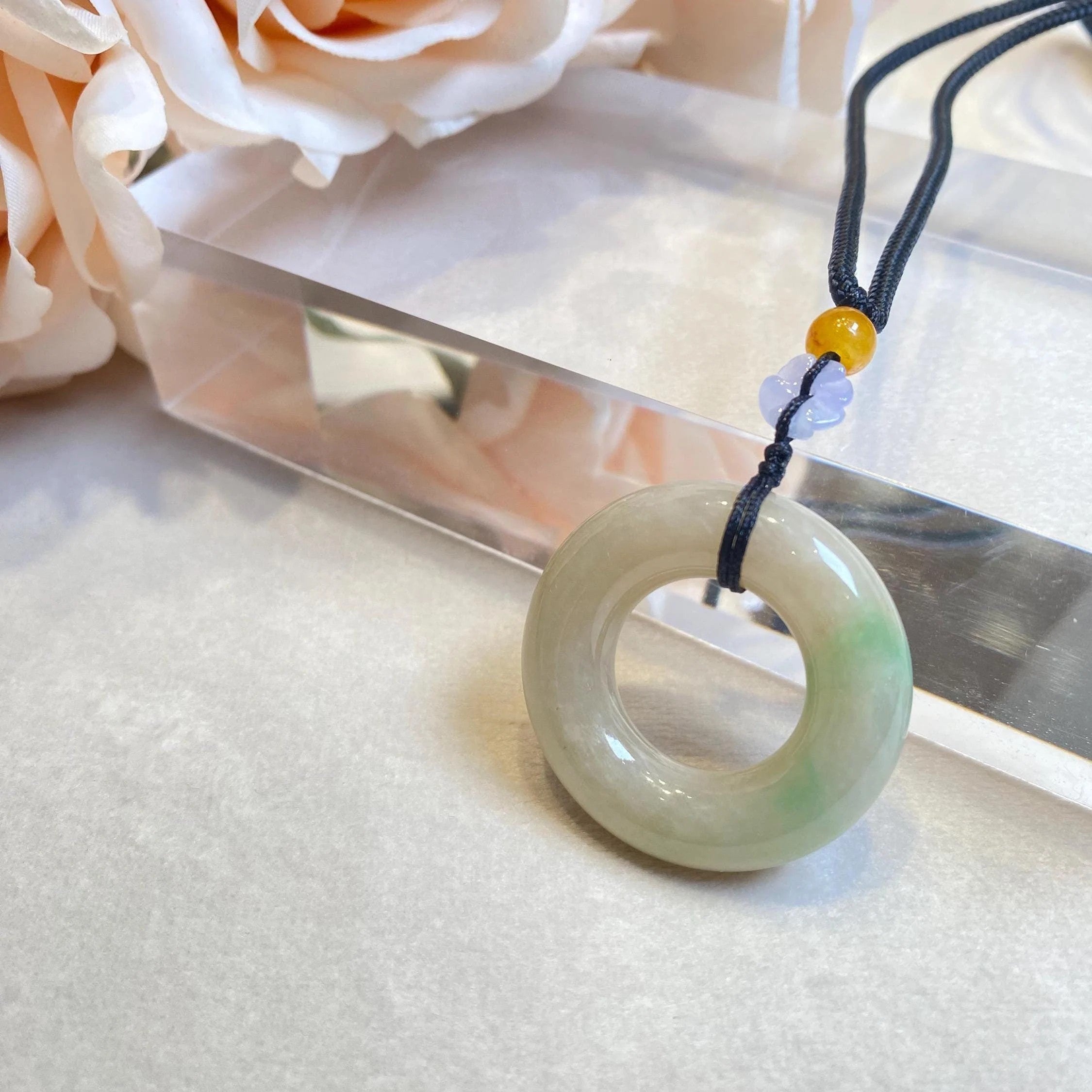 ✅This Natural Type A Jadeite Donut Pendant embodies timeless beauty and soothing energy. Made from genuine, untreated Burmese jadeite, the round disc pendant features a captivating blend of ocean green and earthy brown hues, exuding a serene and harmonious vibe. A loose orangy-brown jade bead adorns the top, elegantly strung on a black adjustable string for a customizable fit.