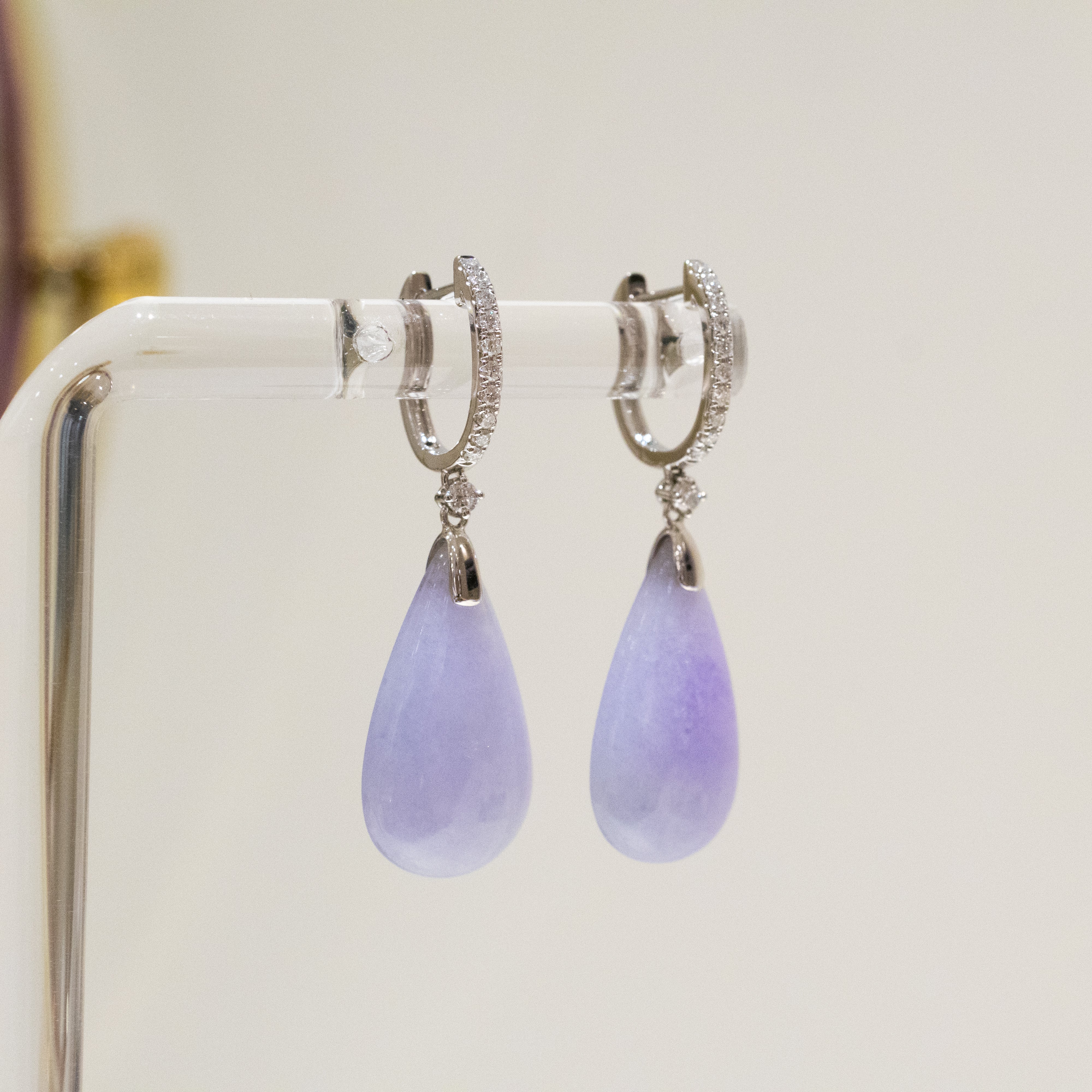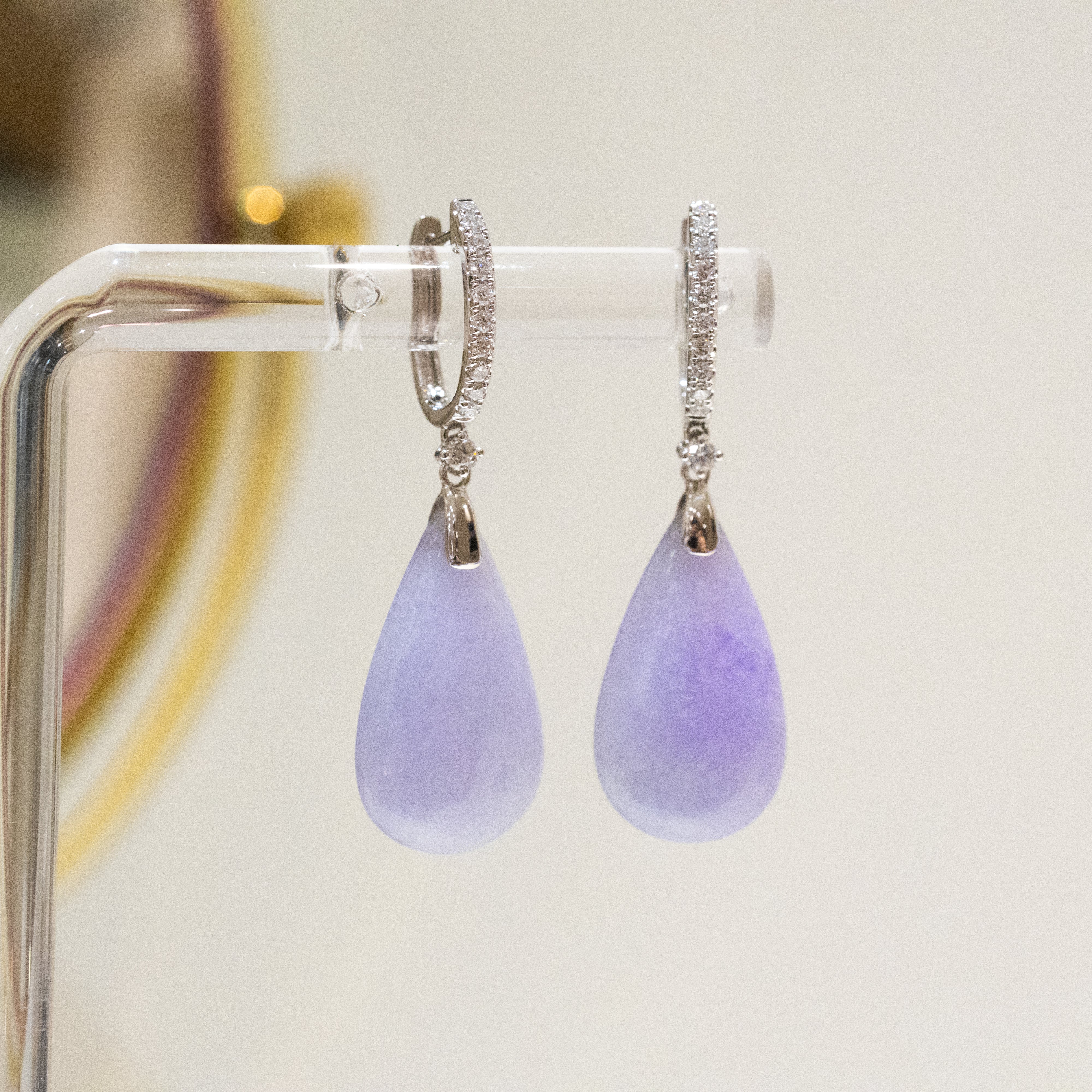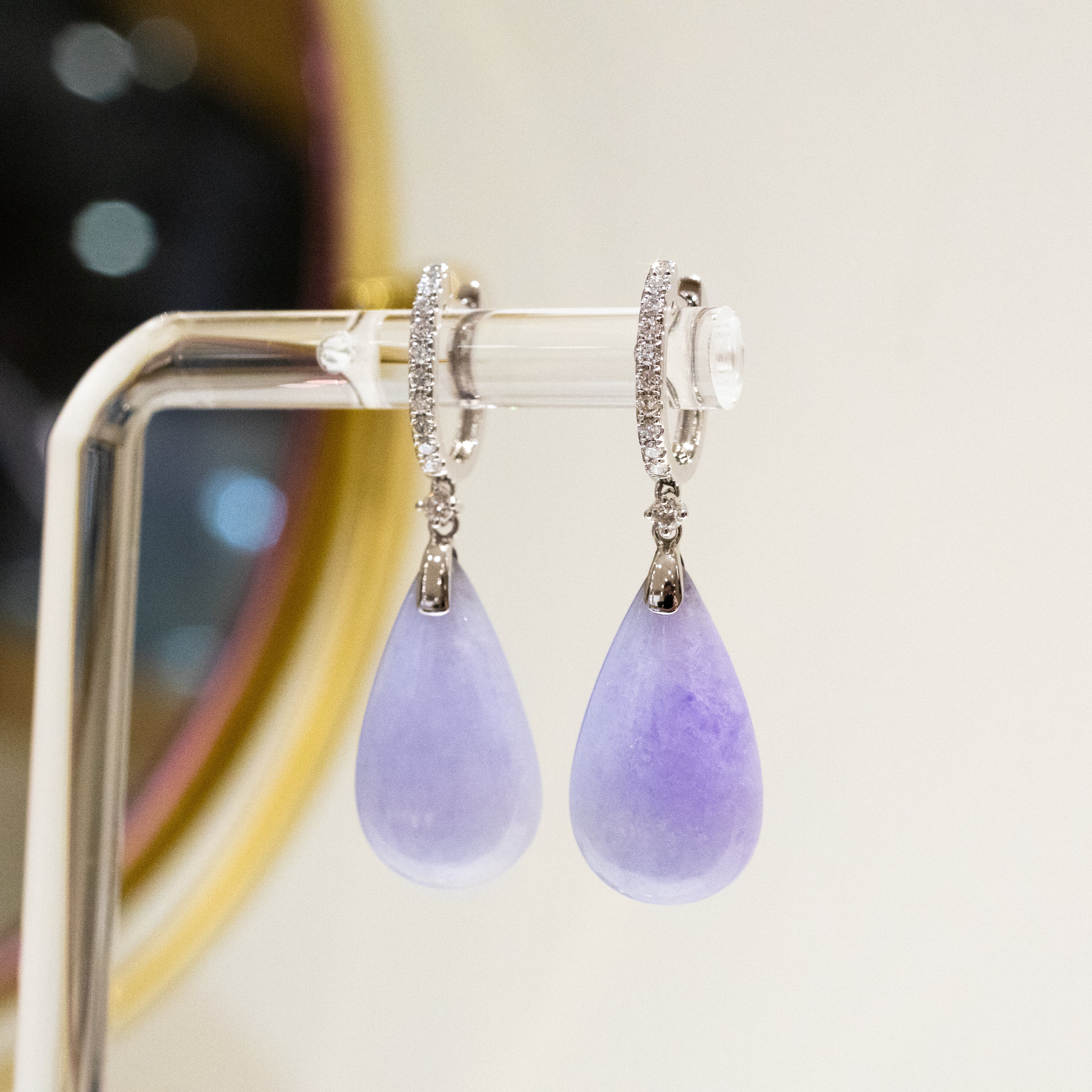 Purple Pear-Shaped Drop Jade Earrings in 18k White Gold Diamonds