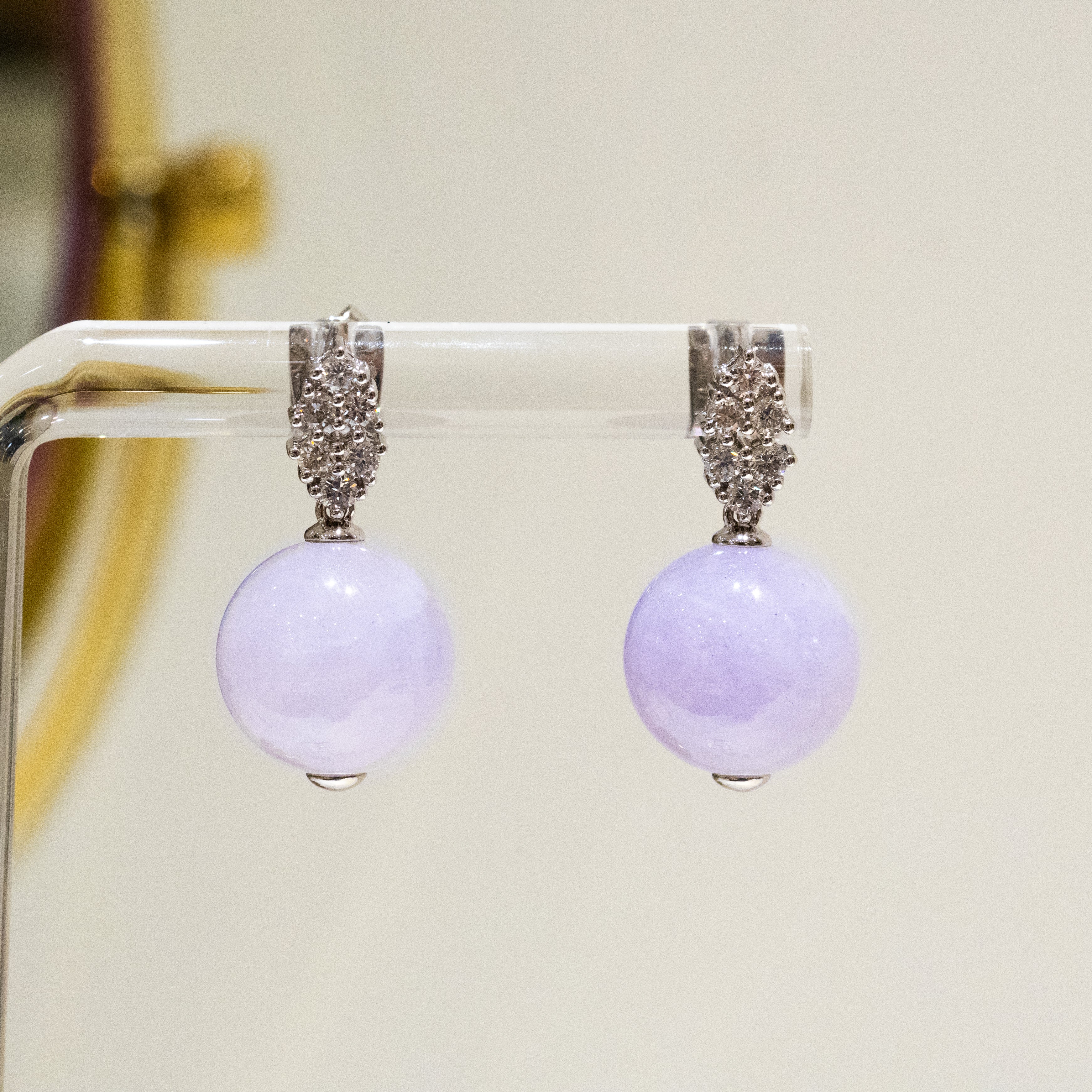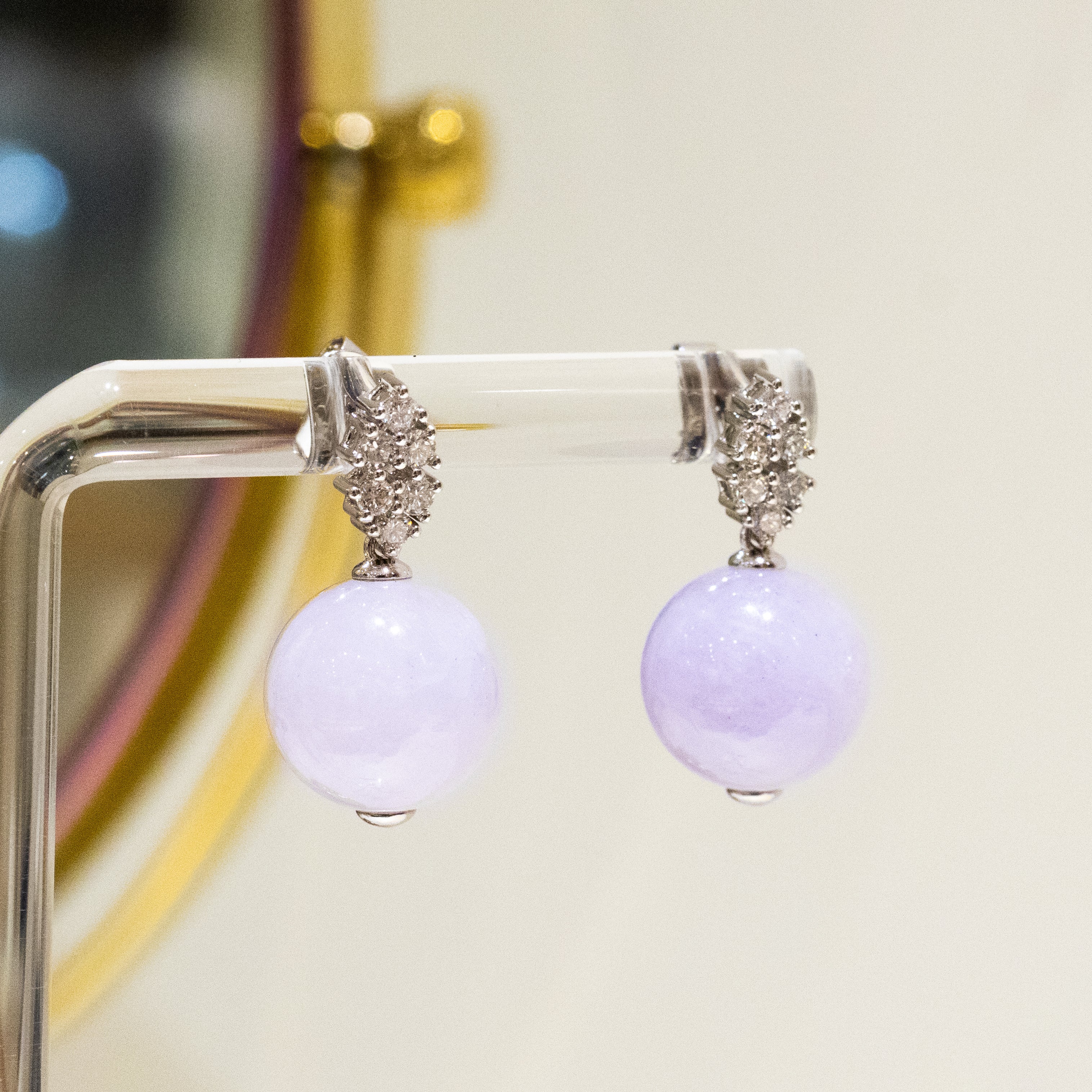 18k White Gold Diamonds Intense Purple Bead Jade Drop Earrings