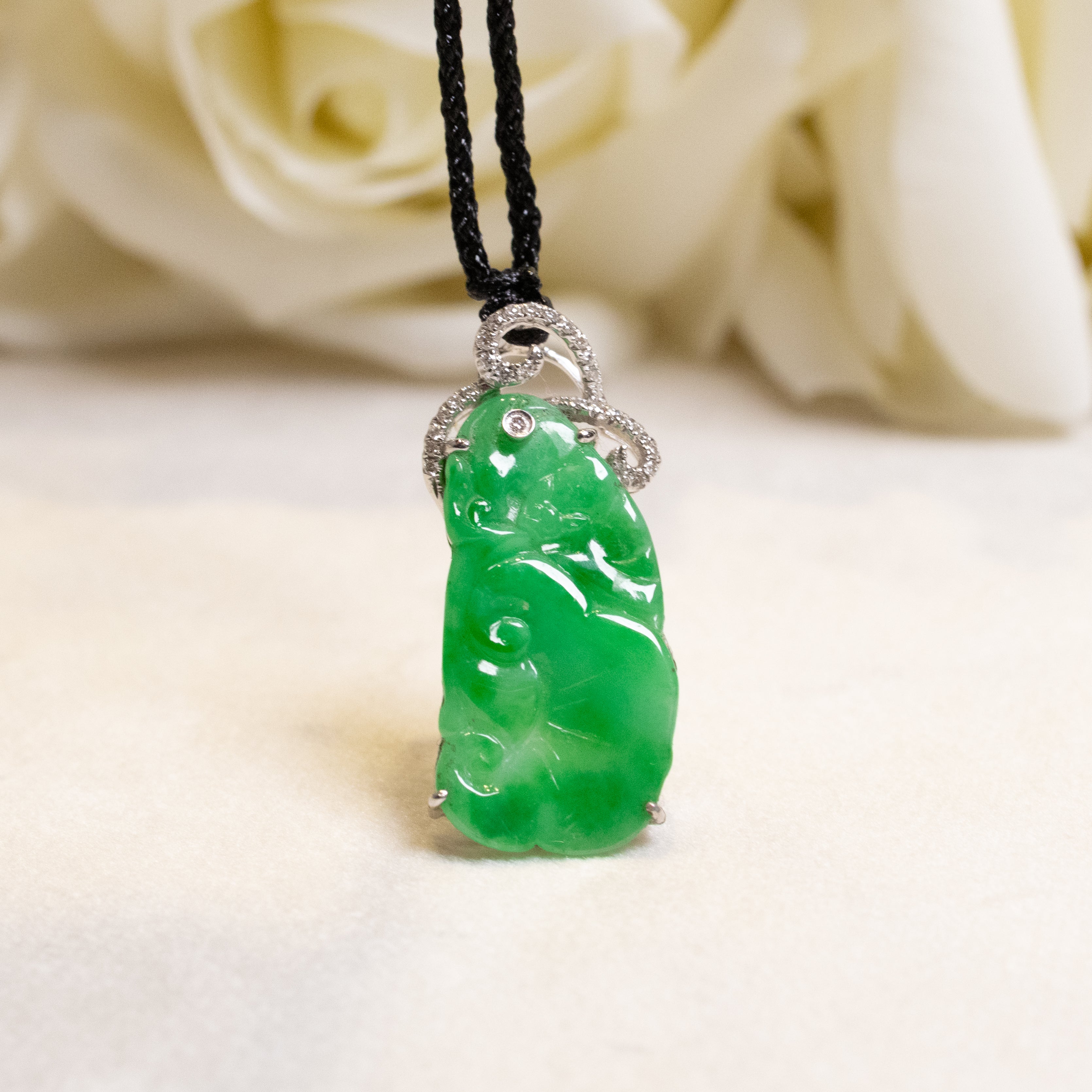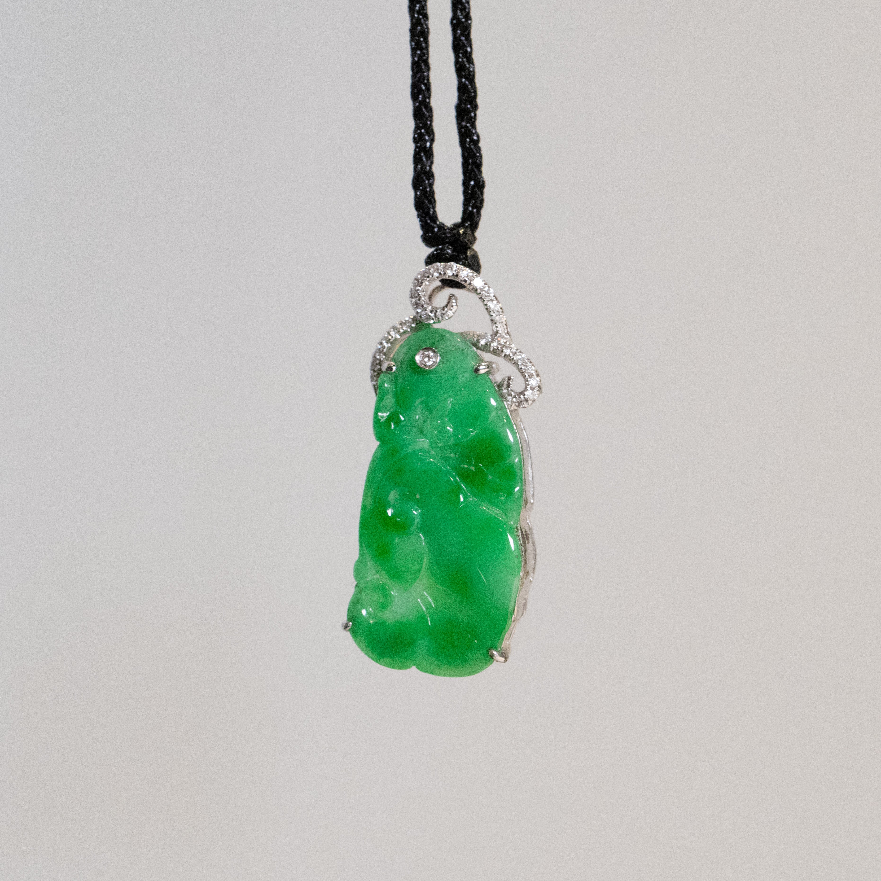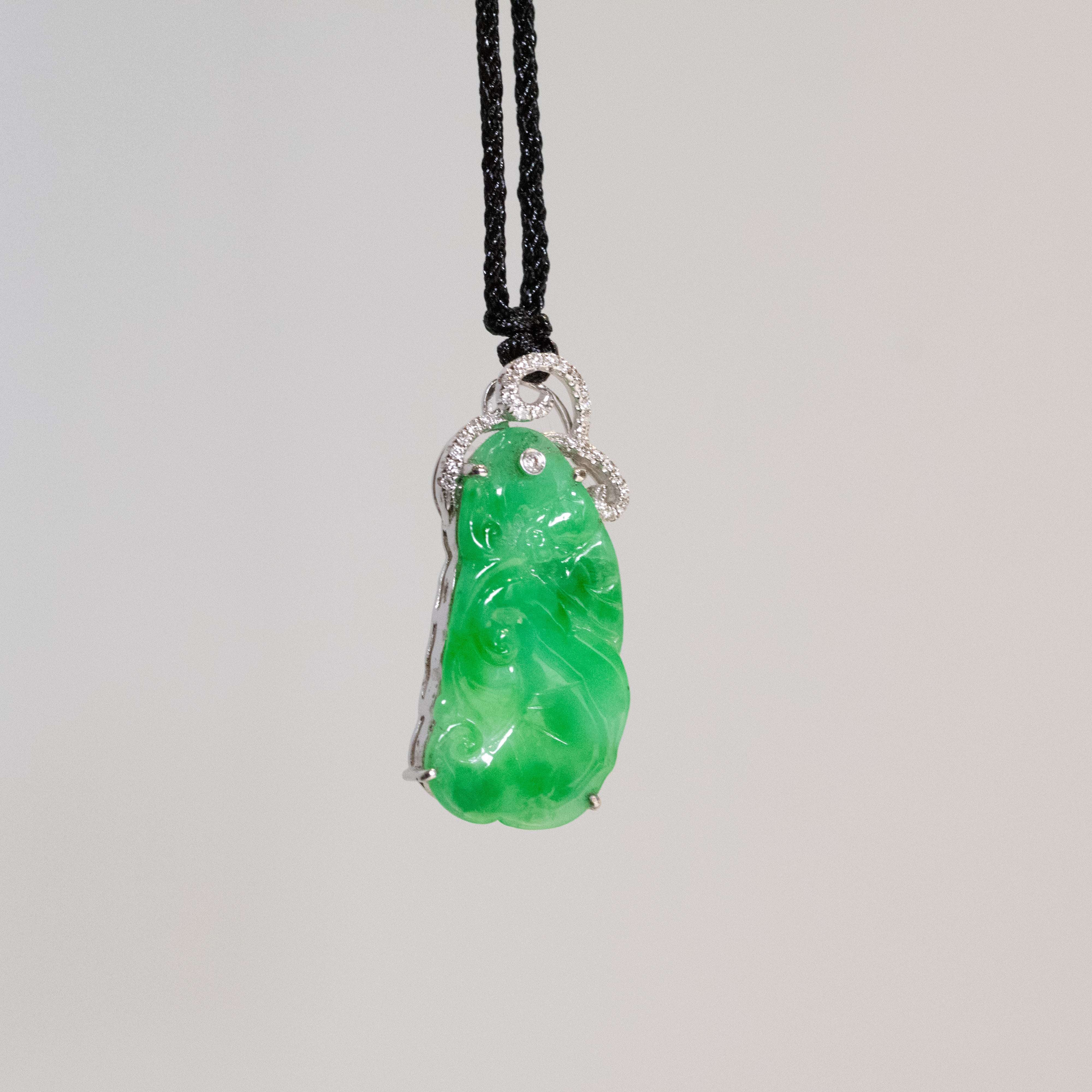 Handcrafted in Hong Kong, the pendant is set in luxurious 18K solid white gold and adorned with sparkling diamonds, adding a regal touch. The bail is elegantly designed in 18k solid gold.