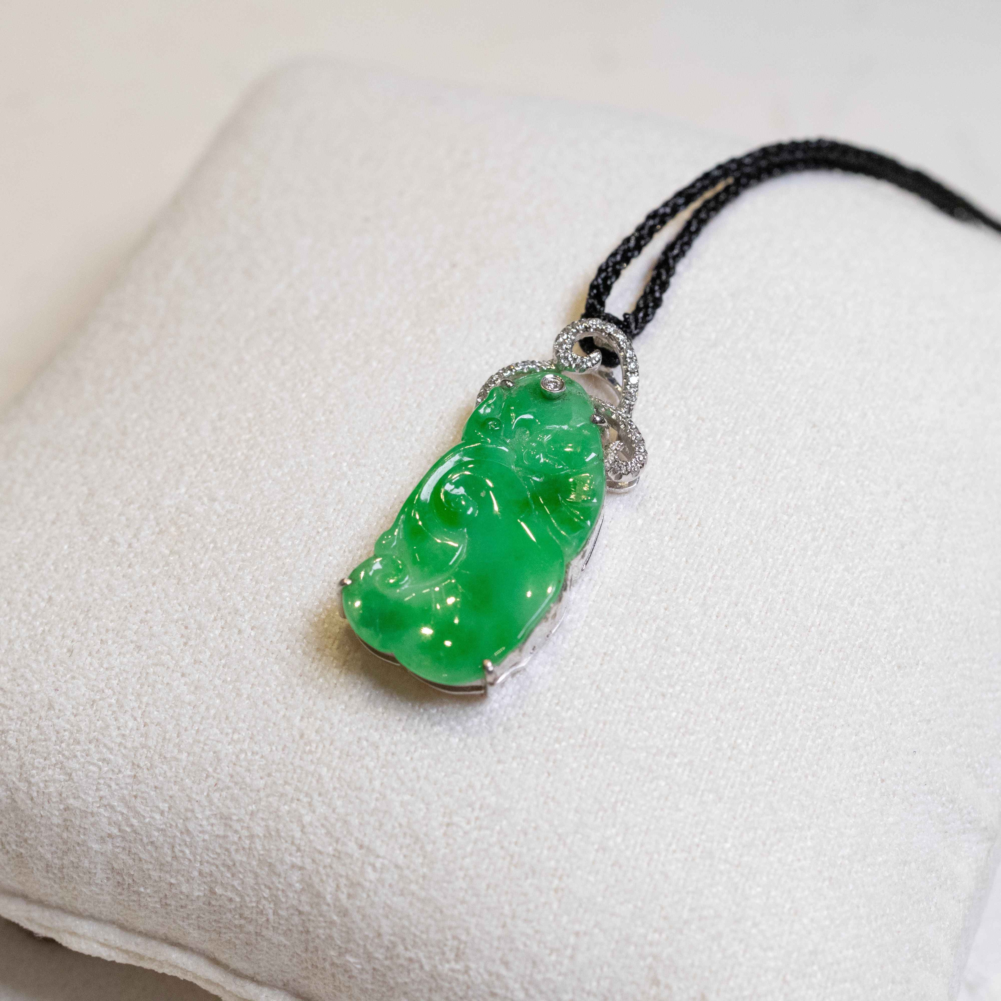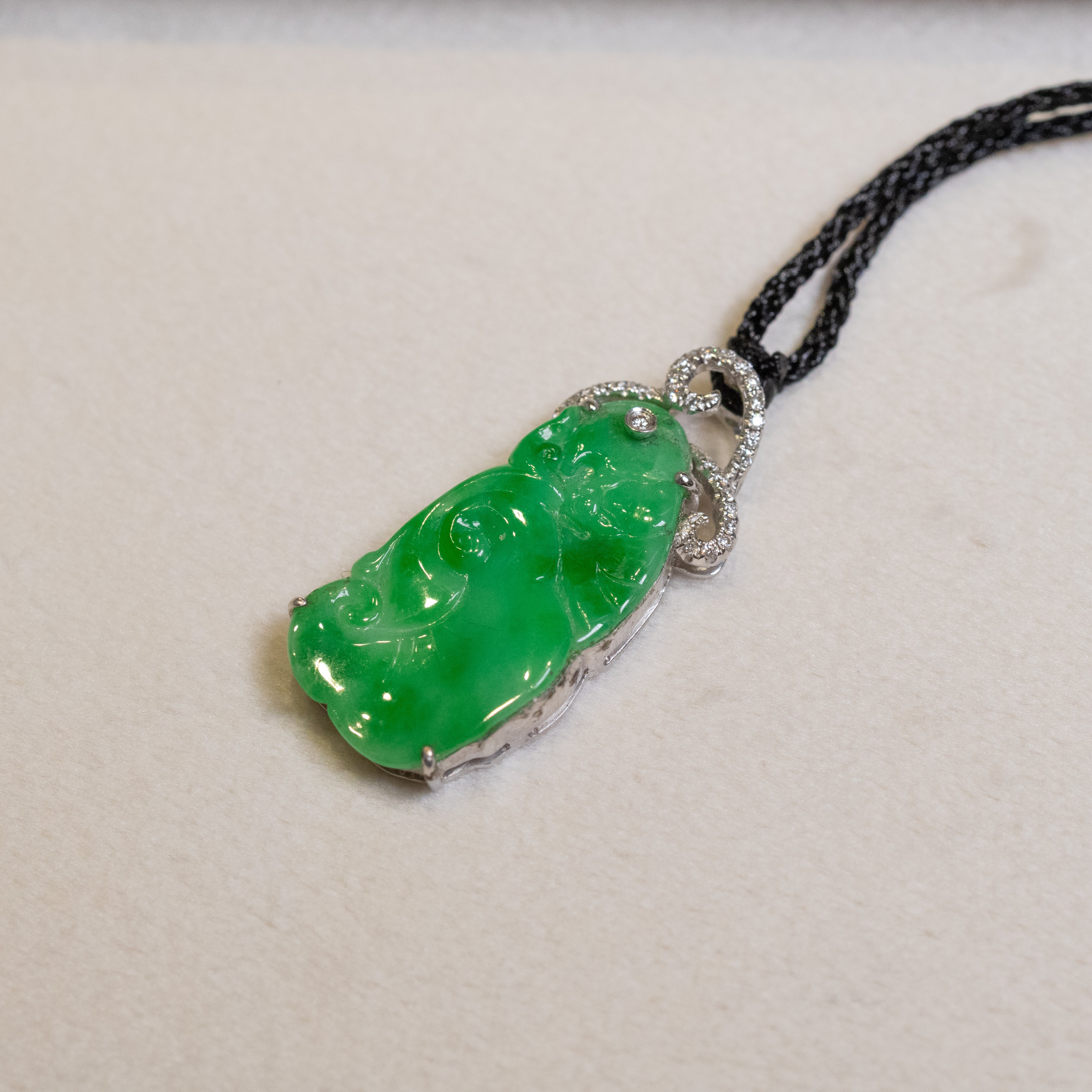Bright Green Carved Ruyi Jade Pendant 18K Gold & Diamonds – Natual Type-A Jadeite