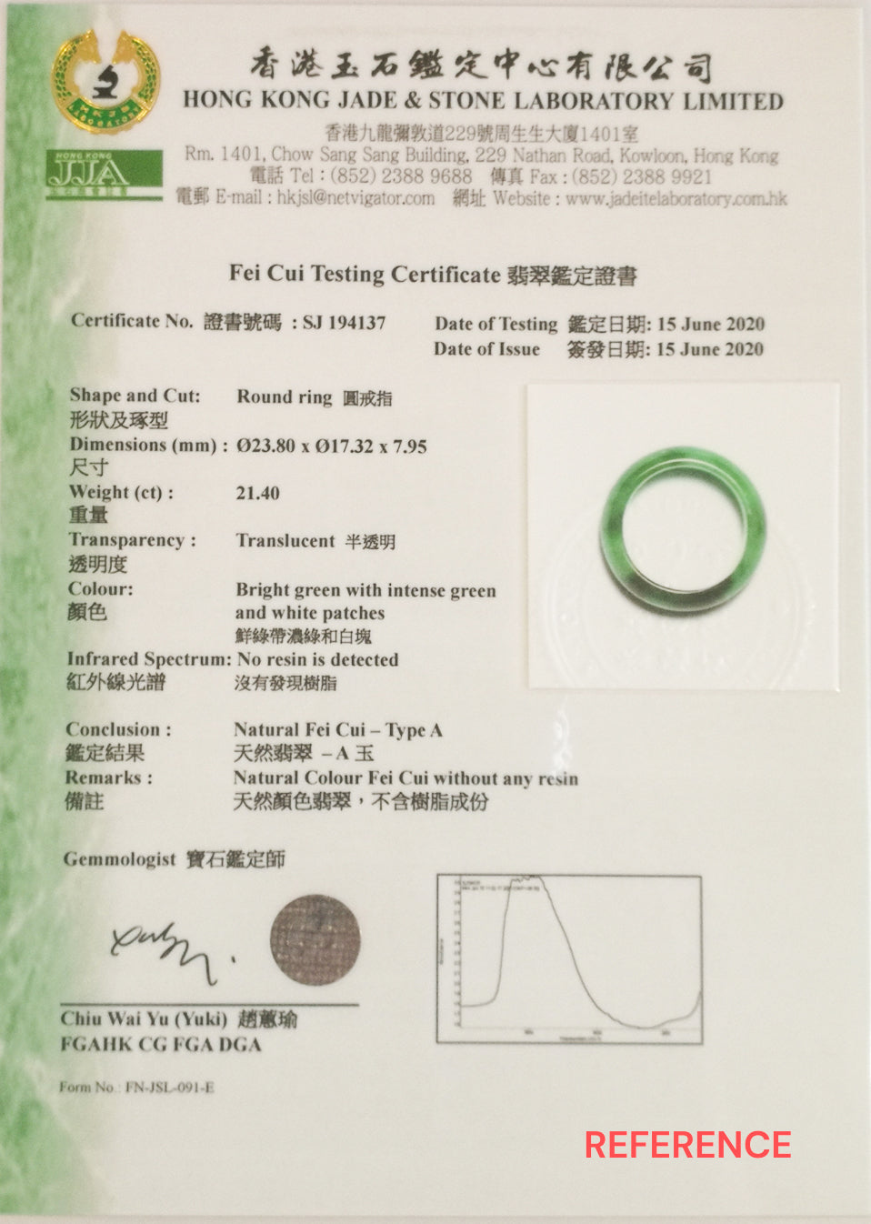 Ensure total confidence in your investment with an internationally recognized laboratory report from the Hong Kong Jade & Stone Laboratory (HKJSL).