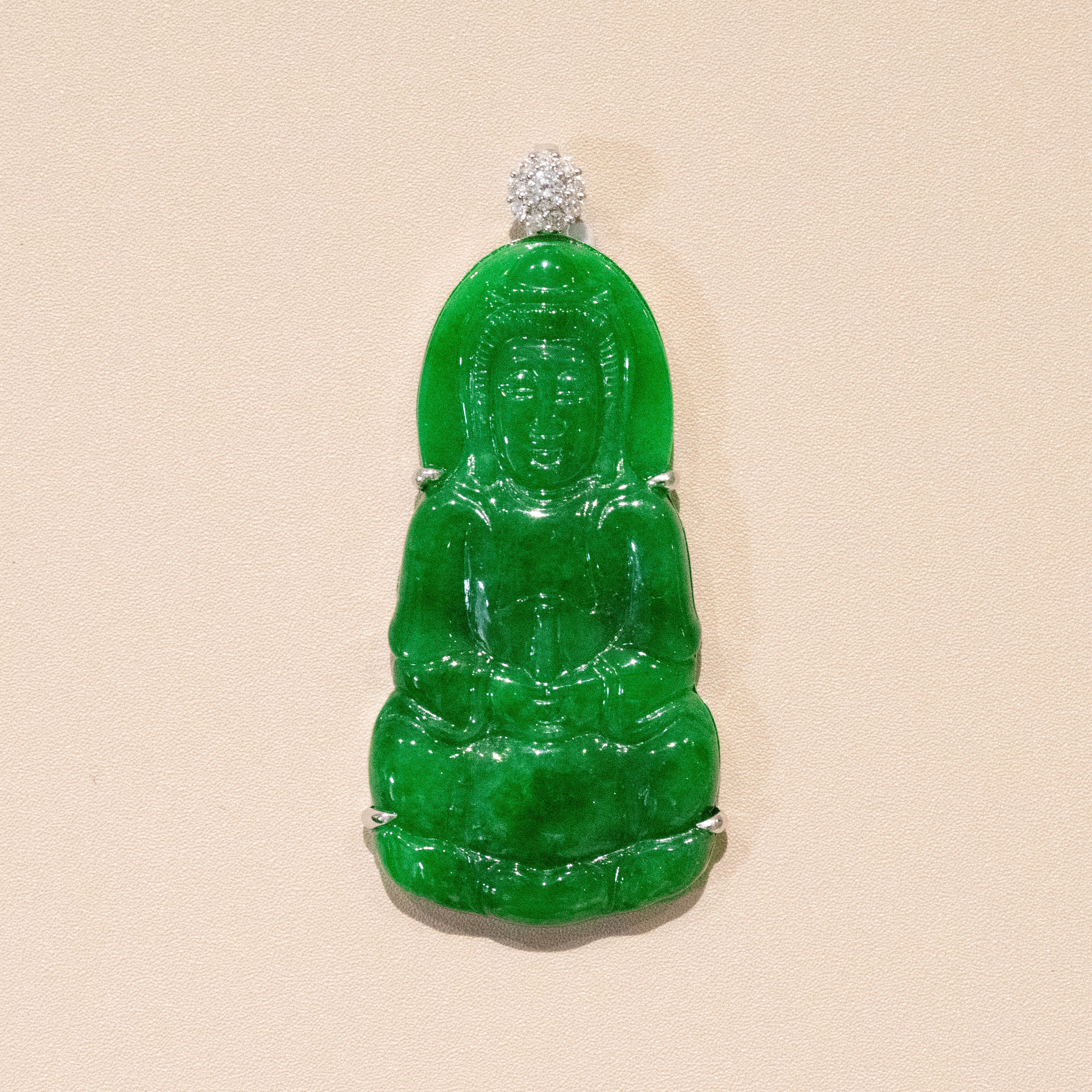 Gransky Handmade GuanYin Imperial Green Jade Pendant 18k White Gold and Diamonds