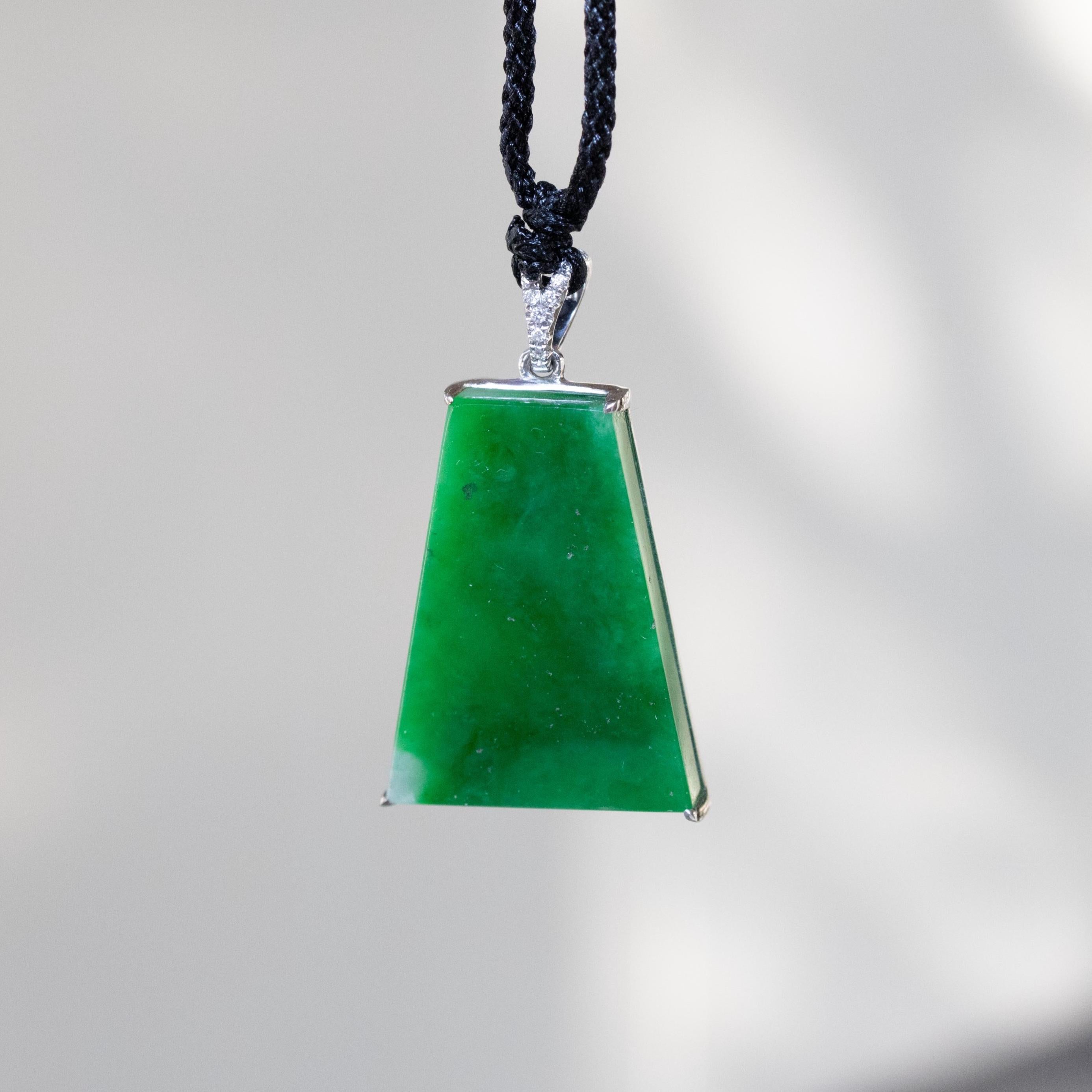✅Enhance your jewelry collection with this captivating pendant featuring a trapezoid-shaped jade block in an 18k white gold clasp. The elegant gold beautifully complements the jade's rich green hue. Sparkling diamond accents add a dazzling touch, creating a mesmerizing interplay of light. With its exquisite craftsmanship and timeless design, this pendant is a stunning statement piece that combines sophistication and natural beauty.