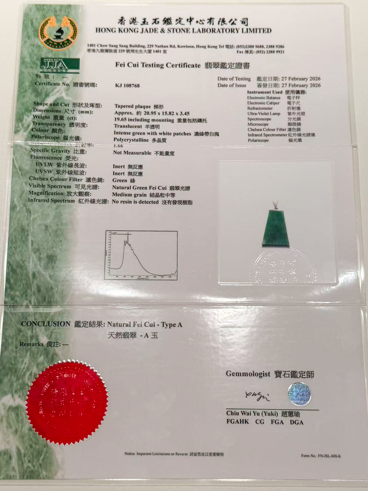 This product includes an independent third-party gemological certificate issued by Hong Kong Jade & Stone Laboratory Limited.