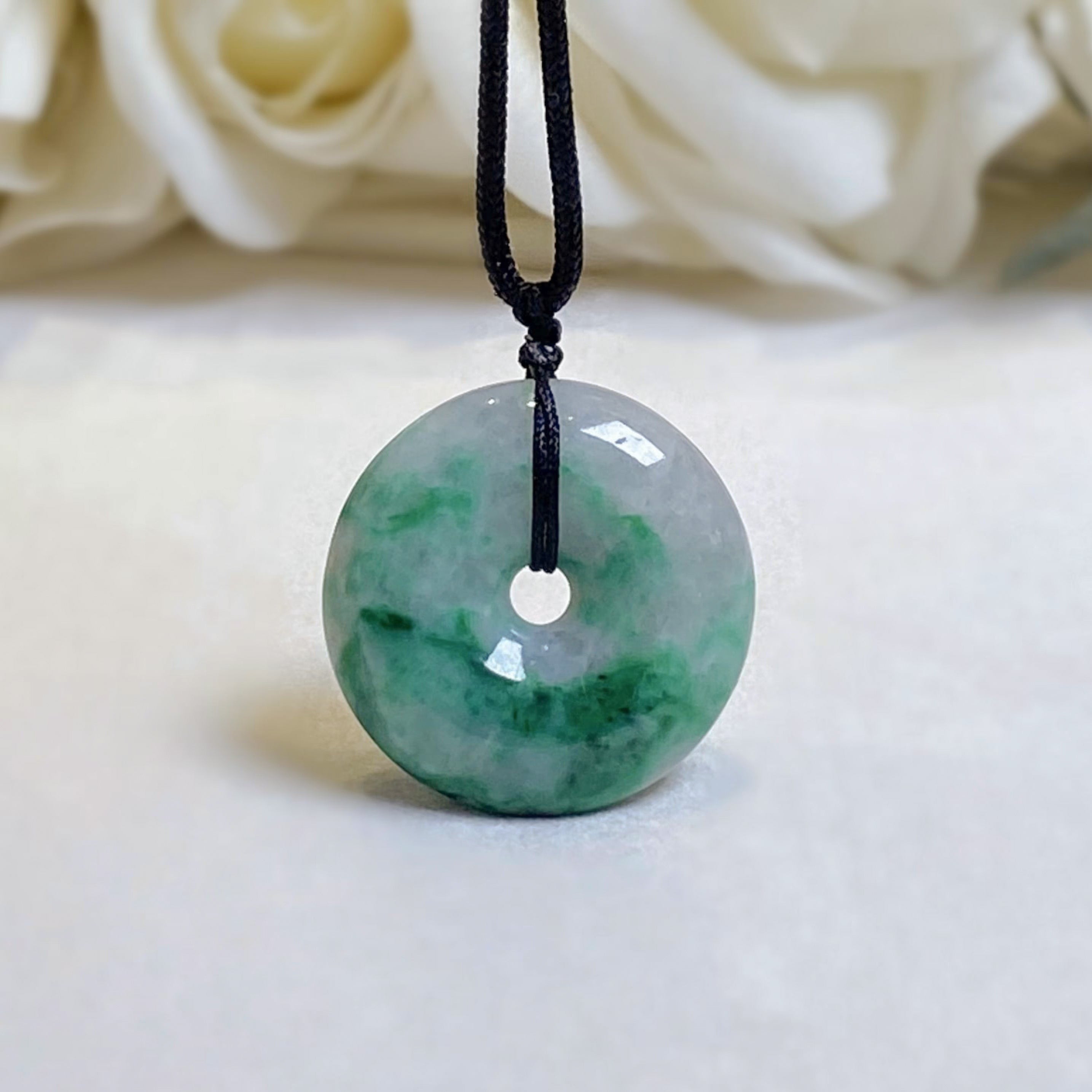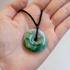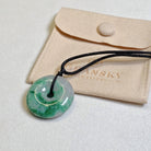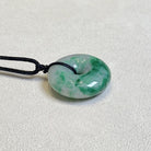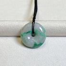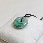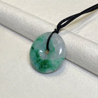 This dainty round disc shape jade pendant is crafted from natural, untreated Type-A Burmese jadeite, prized for its intense green hue. Meticulously hand-carved into the auspicious round shape symbol (representing peace and prosperity), the jade showcases mesmerizing color intensity and unique distribution, a testament to its genuine, earth-formed beauty. The piece hangs from a premium adjustable length silk cord.