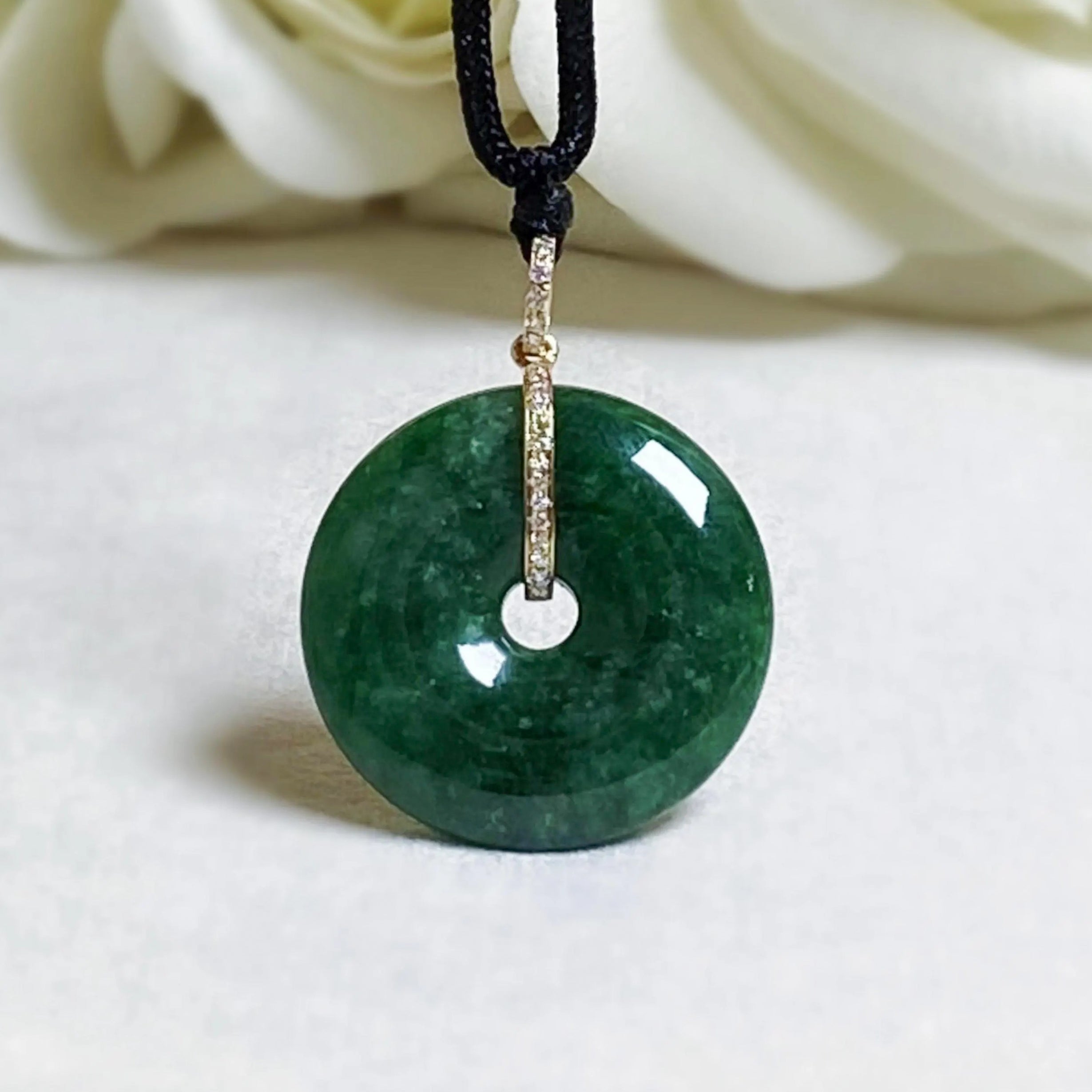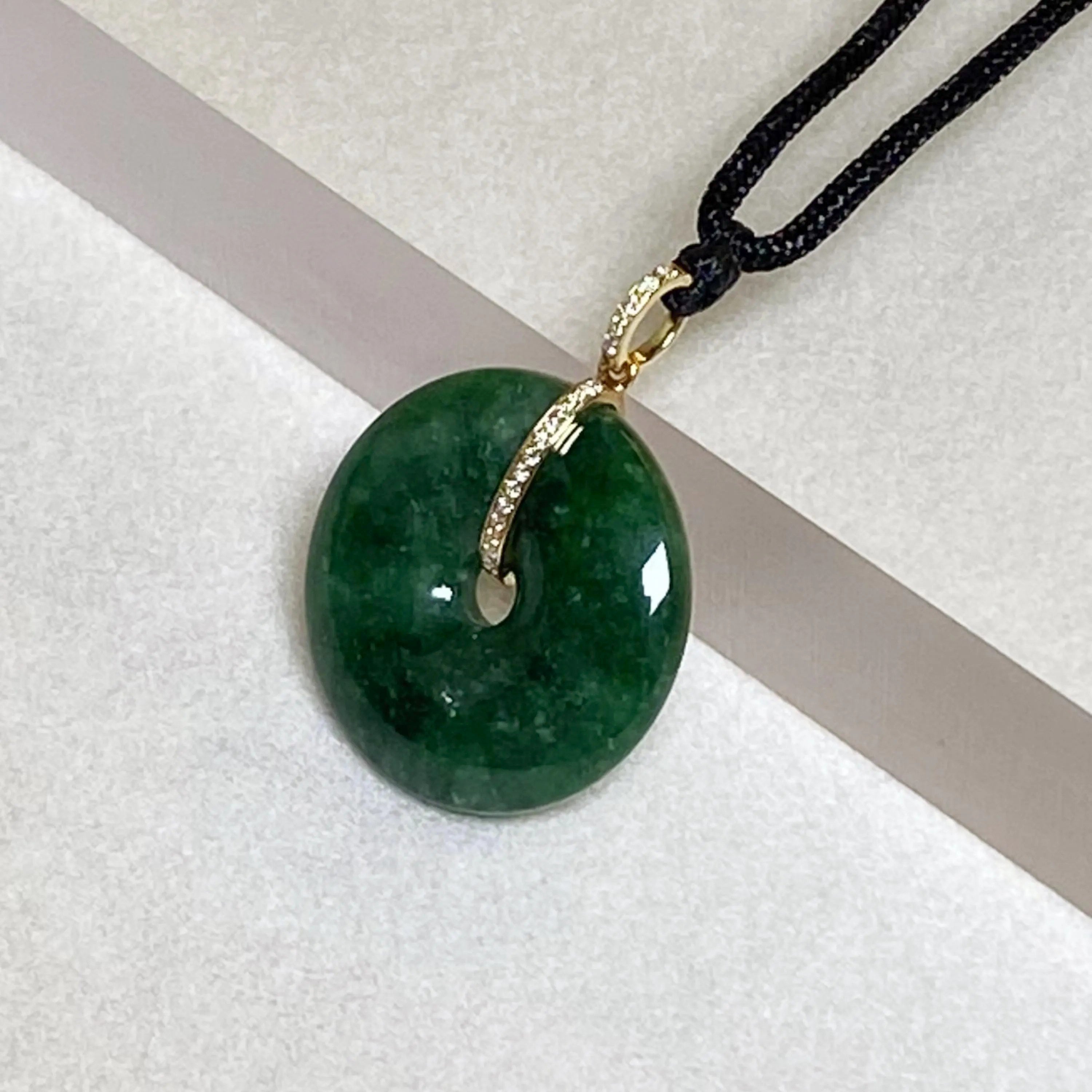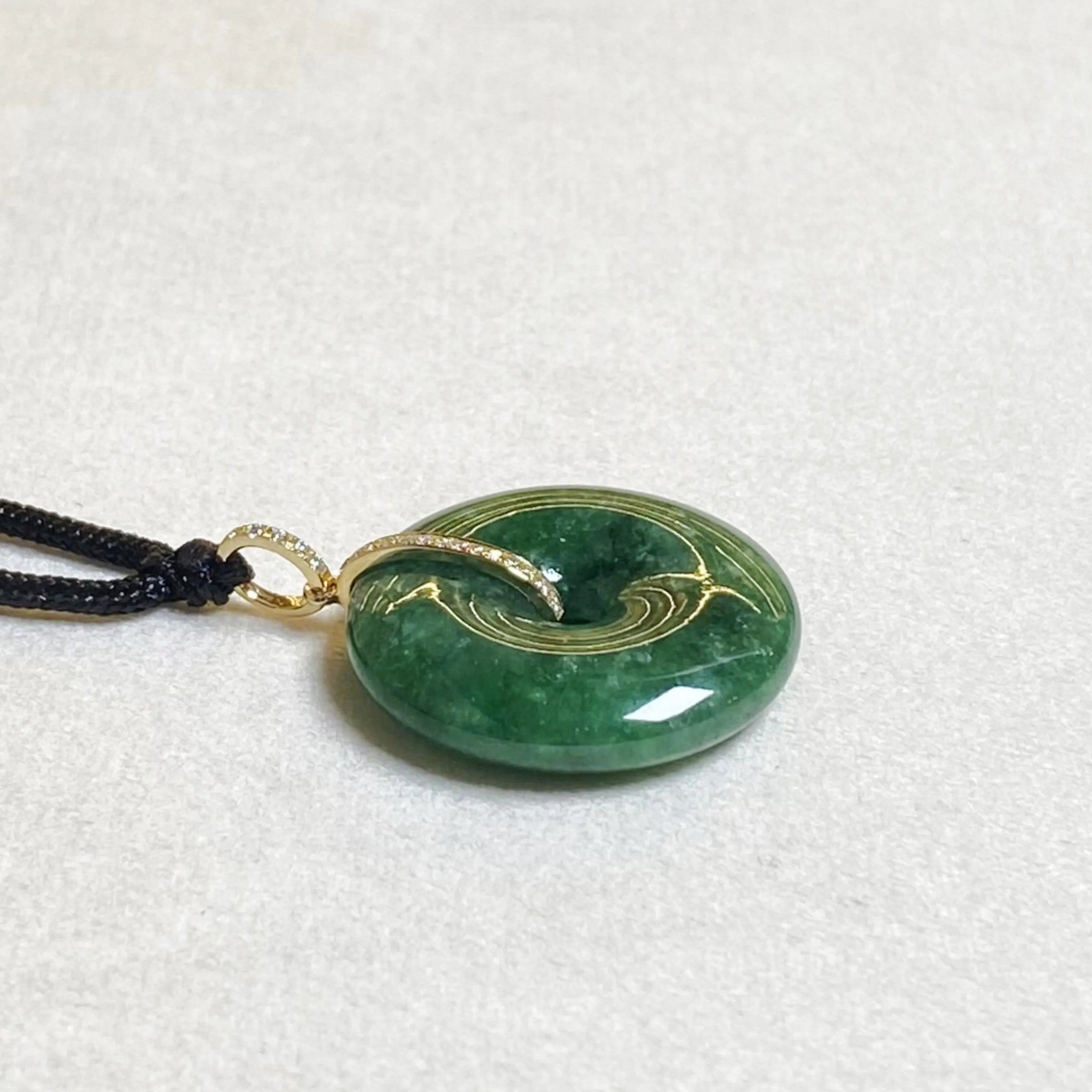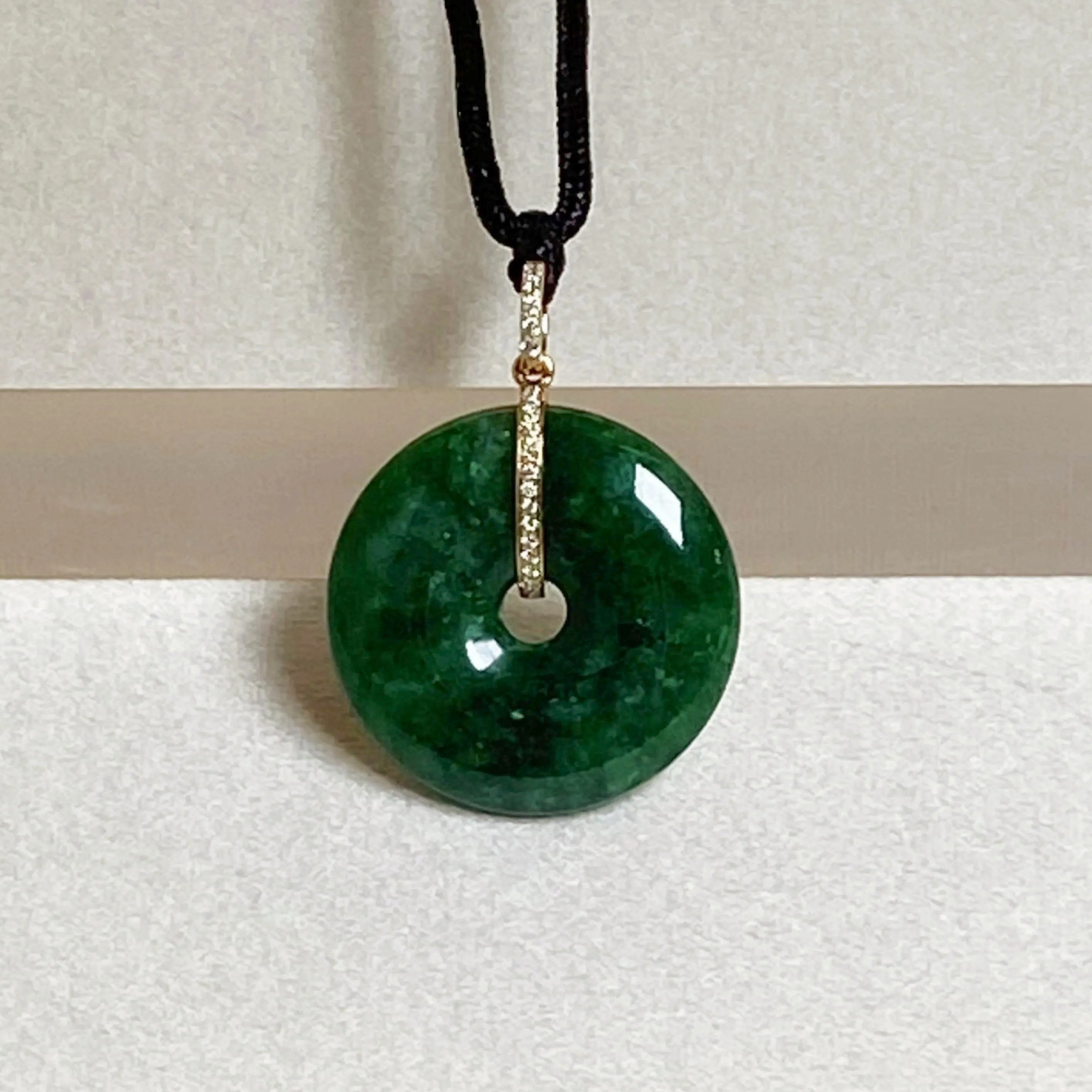 ✅This breathtaking round disc shape jade pendant is crafted from natural, untreated Type-A Burmese jadeite, prized for its intense imperial green hue. Meticulously hand-carved into the auspicious round shape symbol (representing peace and prosperity), the jade showcases mesmerizing color intensity and organic veining, a testament to its genuine, earth-formed beauty. The piece hangs from a premium adjustable silk cord and set in 18k solid yellow gold bail and diamonds.