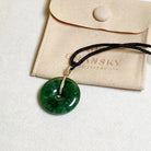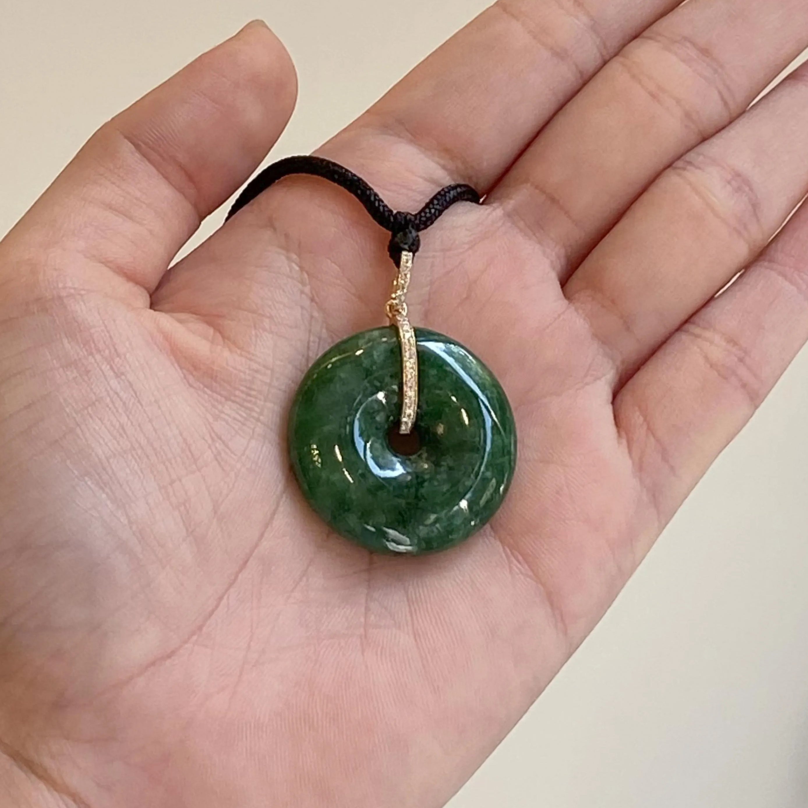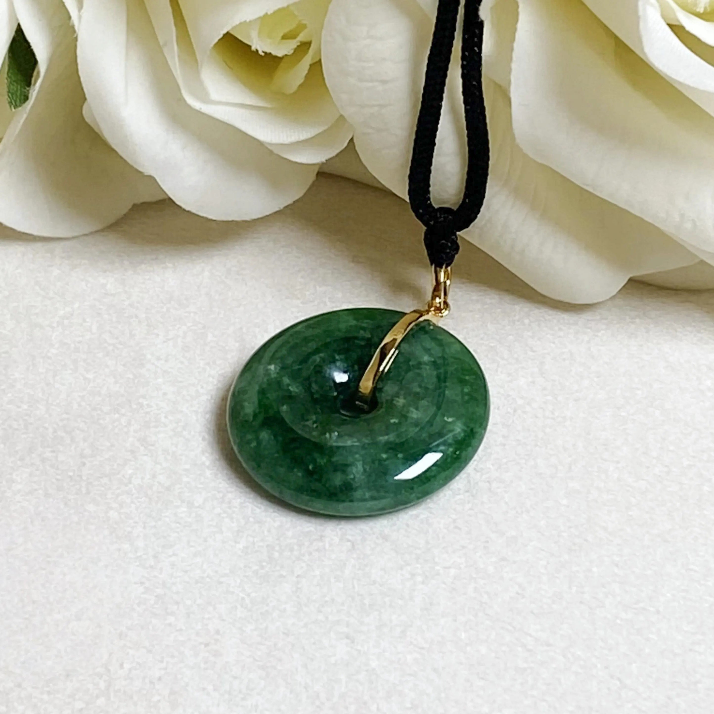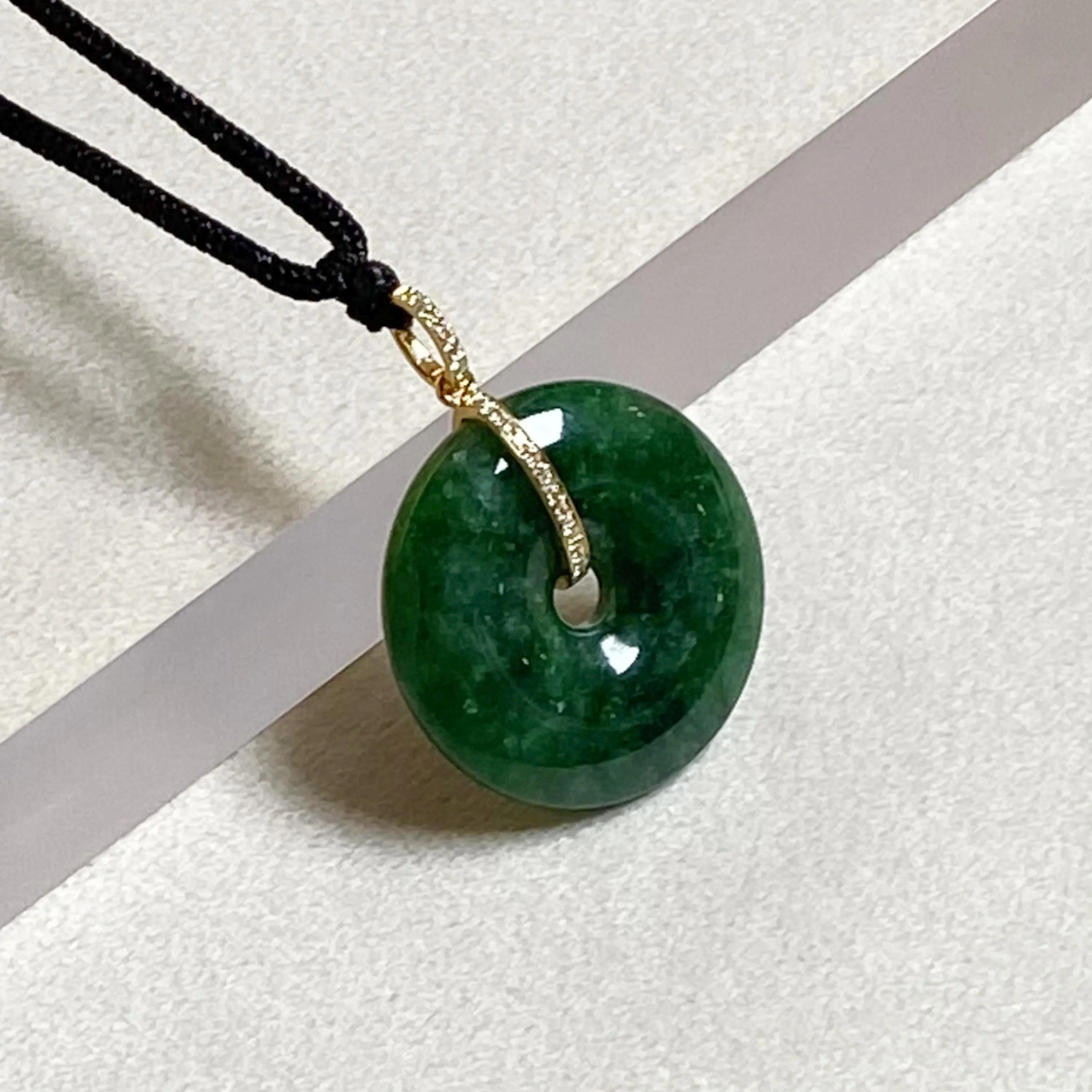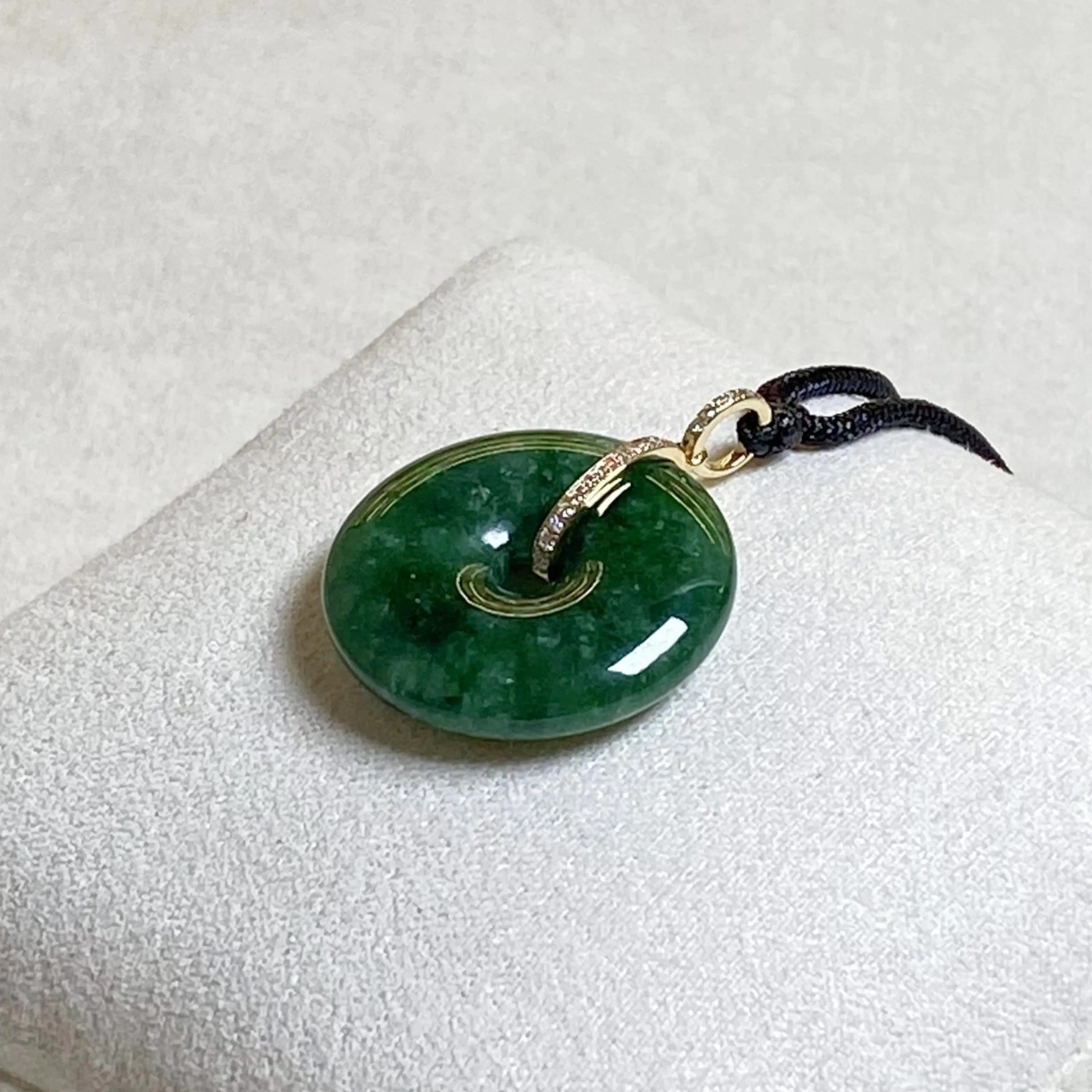 ✅This breathtaking round disc shape jade pendant is crafted from natural, untreated Type-A Burmese jadeite, prized for its intense imperial green hue. Meticulously hand-carved into the auspicious round shape symbol (representing peace and prosperity), the jade showcases mesmerizing color intensity and organic veining, a testament to its genuine, earth-formed beauty. The piece hangs from a premium adjustable silk cord and set in 18k solid yellow gold bail and diamonds.