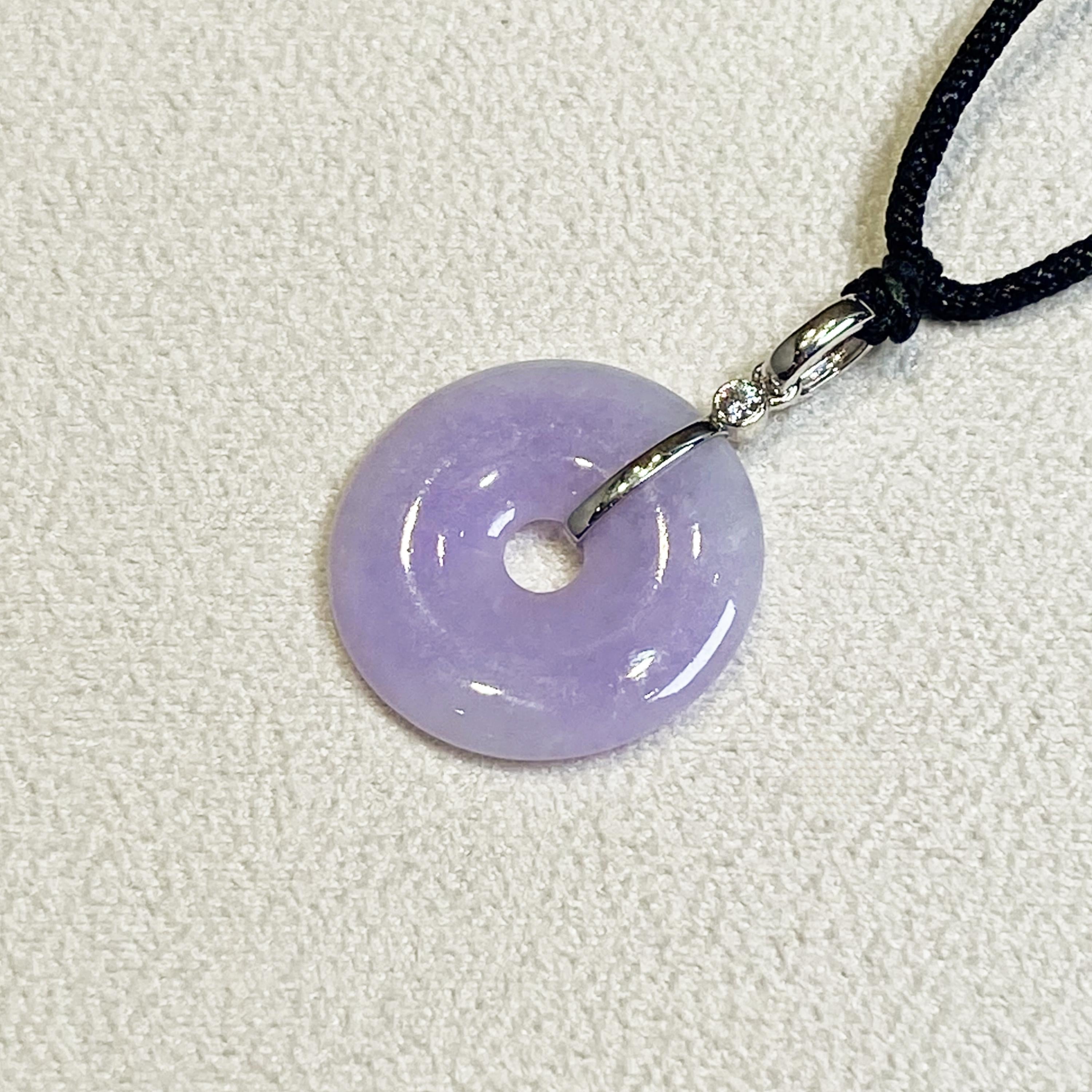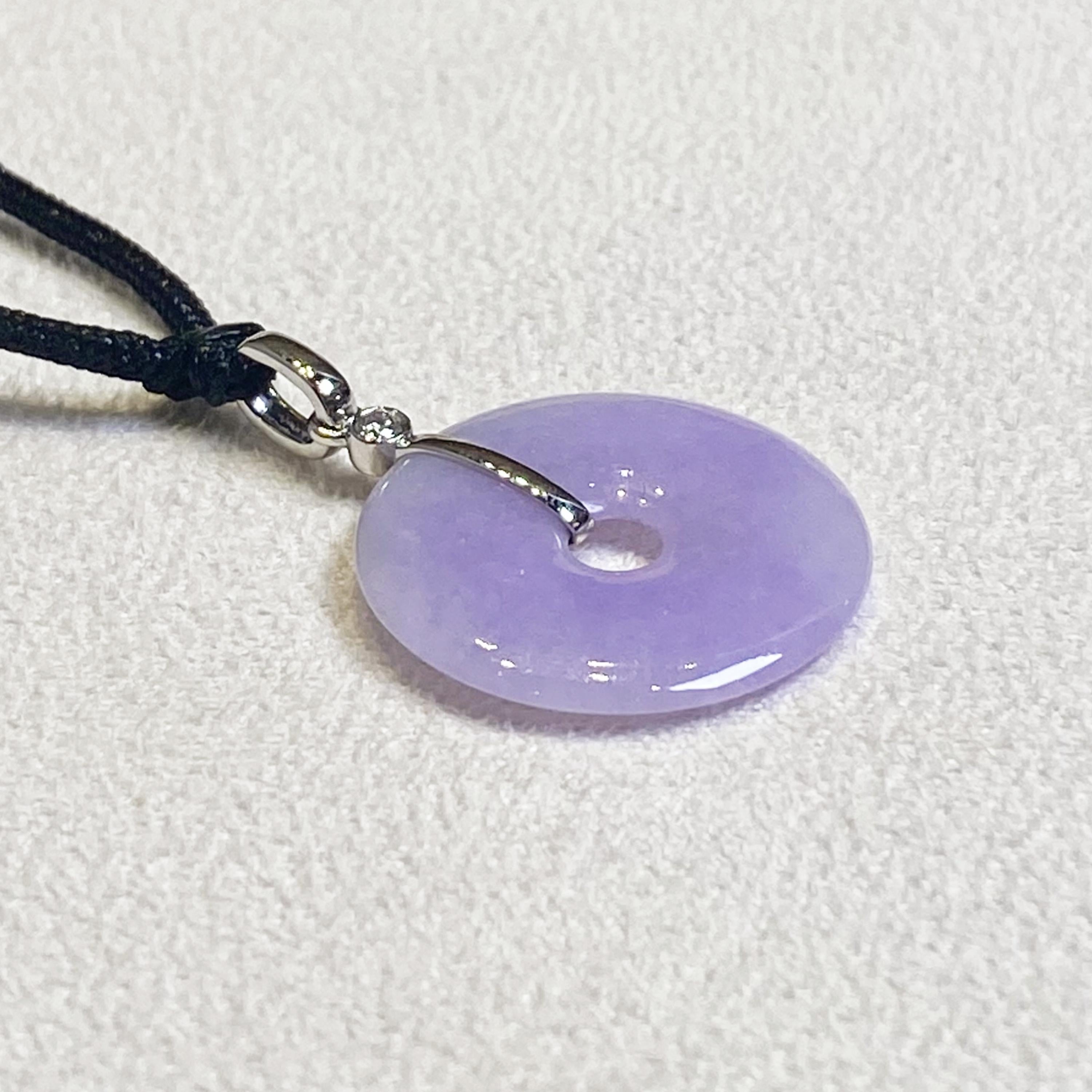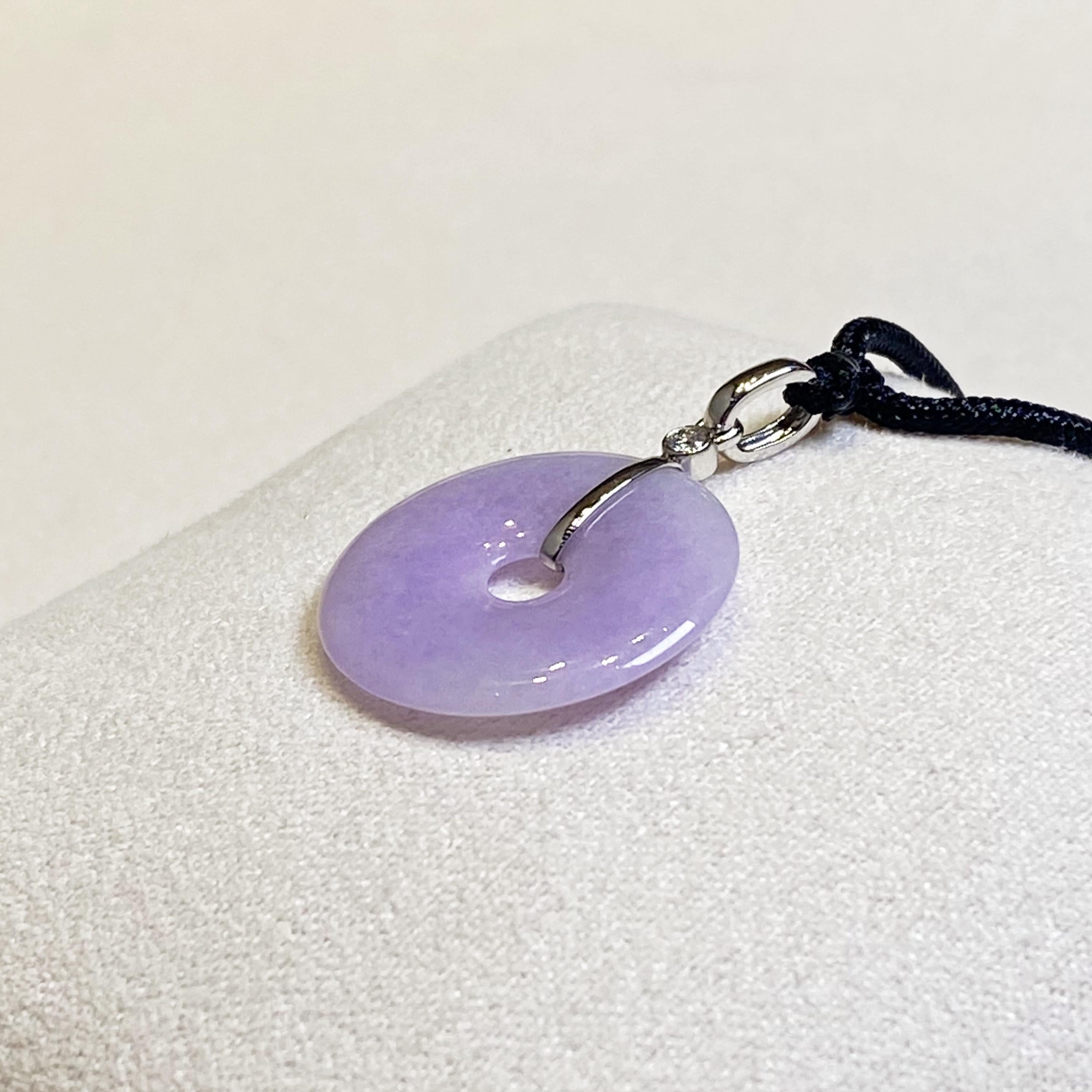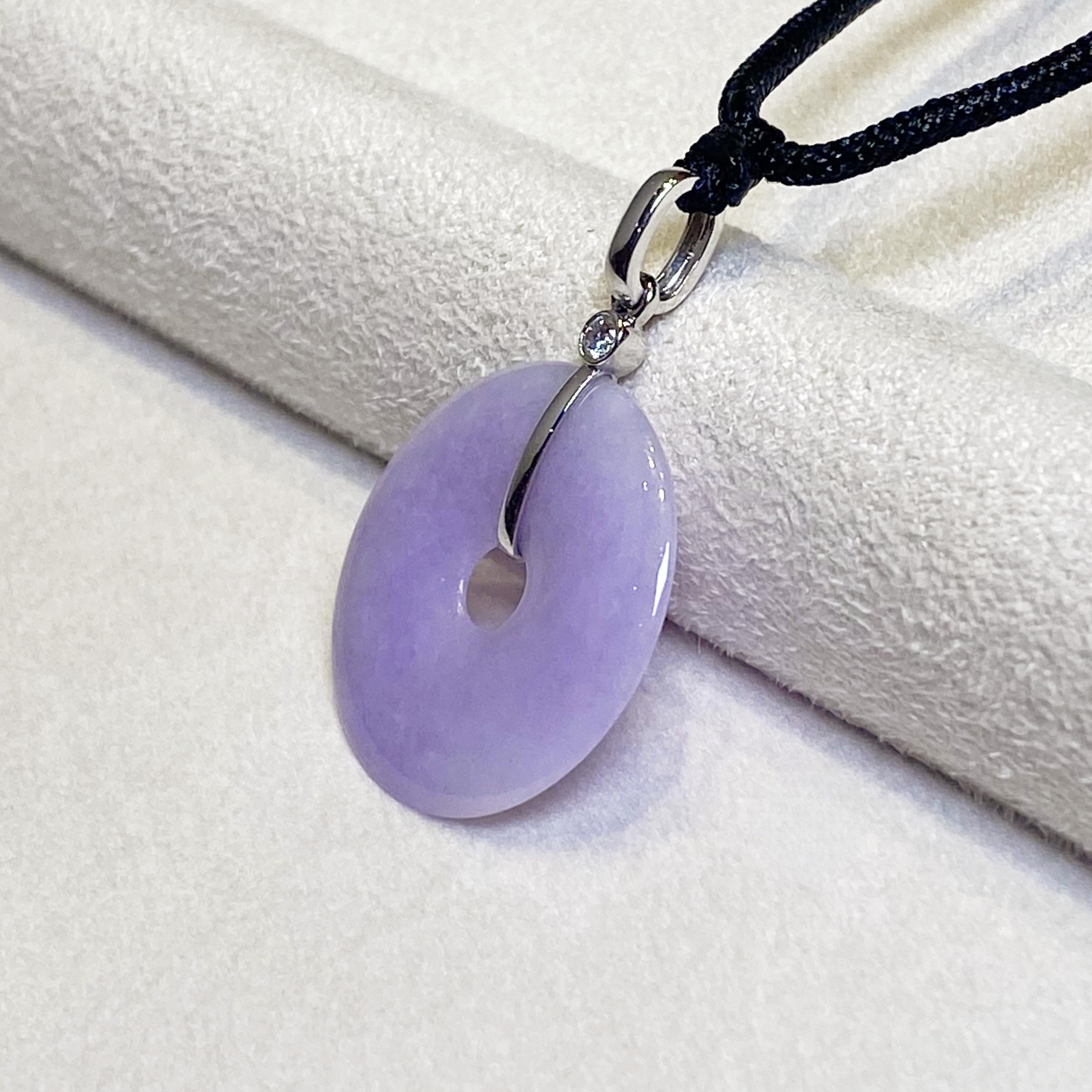 ✅This breathtaking round disc shape jade pendant is crafted from natural, untreated Type-A Burmese jadeite, prized for its natural intense purple hue. Meticulously hand-carved into the auspicious round shape symbol (representing peace and prosperity), the jade showcases mesmerizing color intensity and organic veining, a testament to its genuine, earth-formed beauty. The piece hangs from a premium adjustable silk cord and set in 18k solid white gold bail and diamonds.