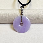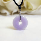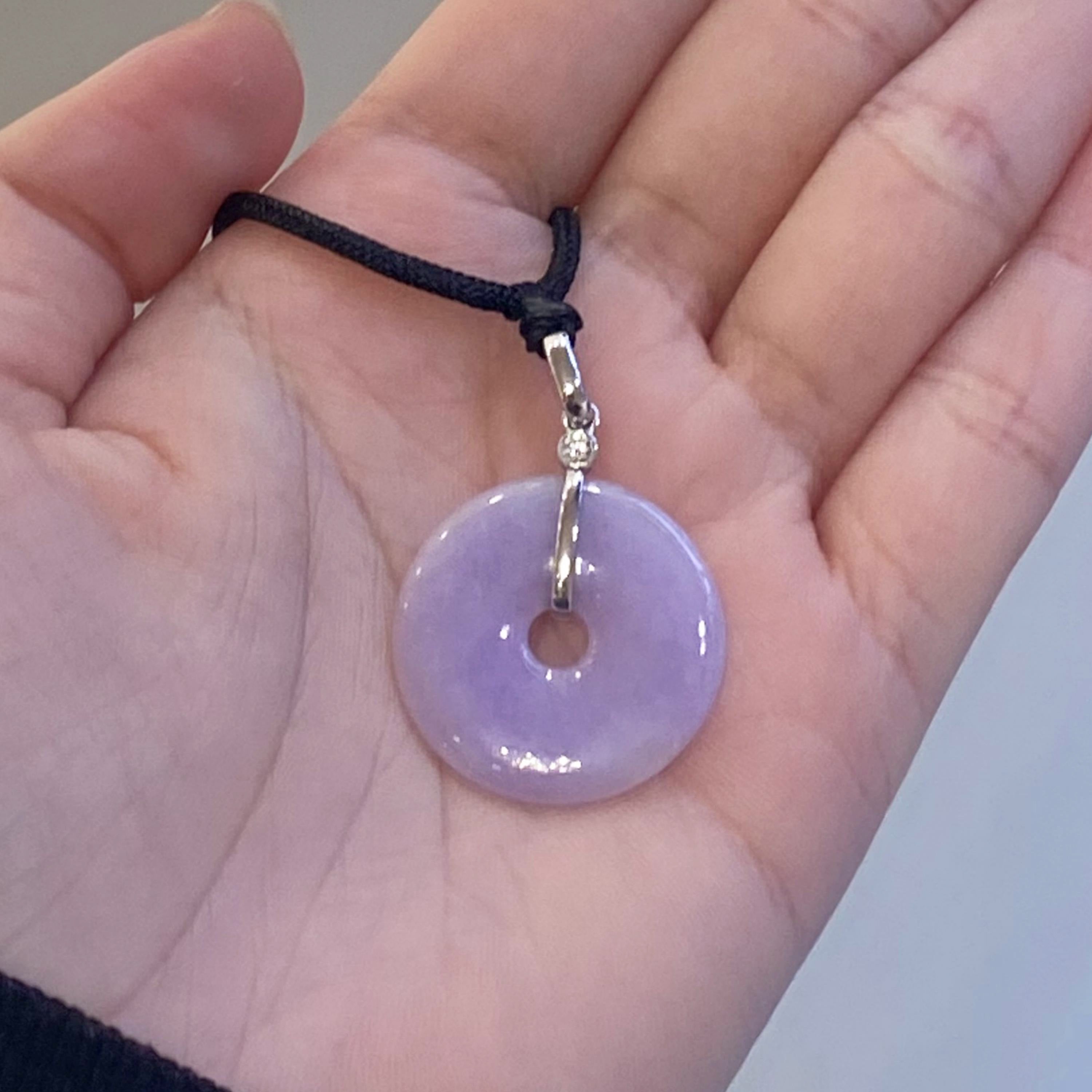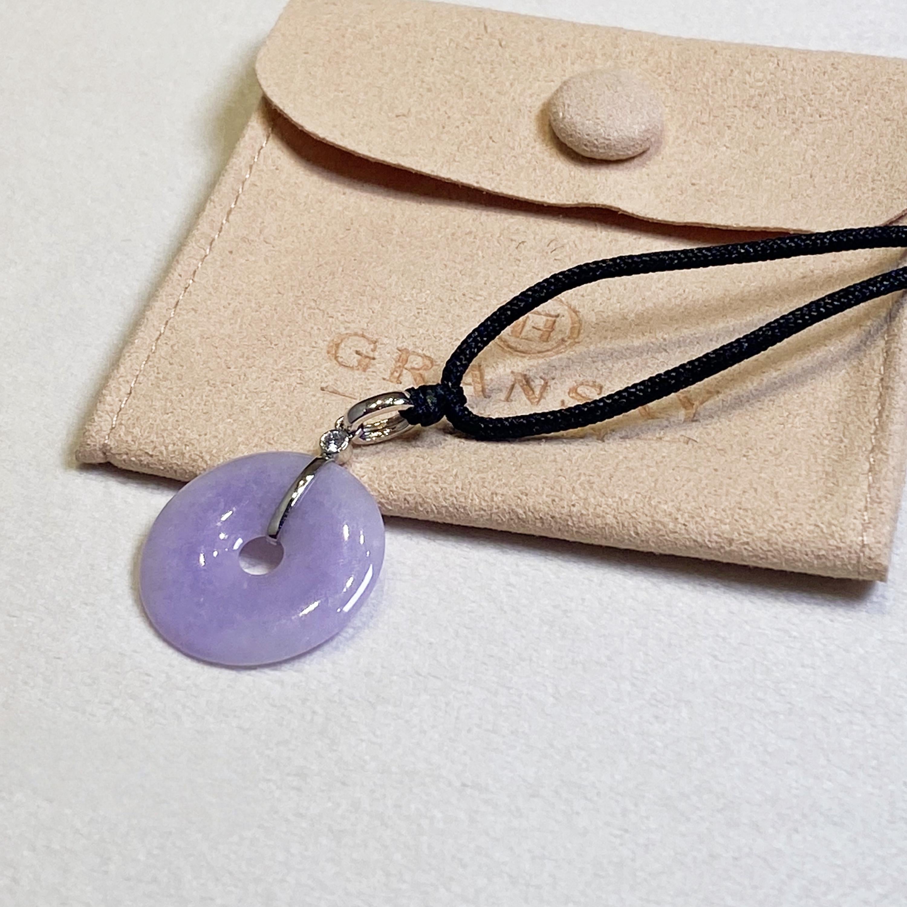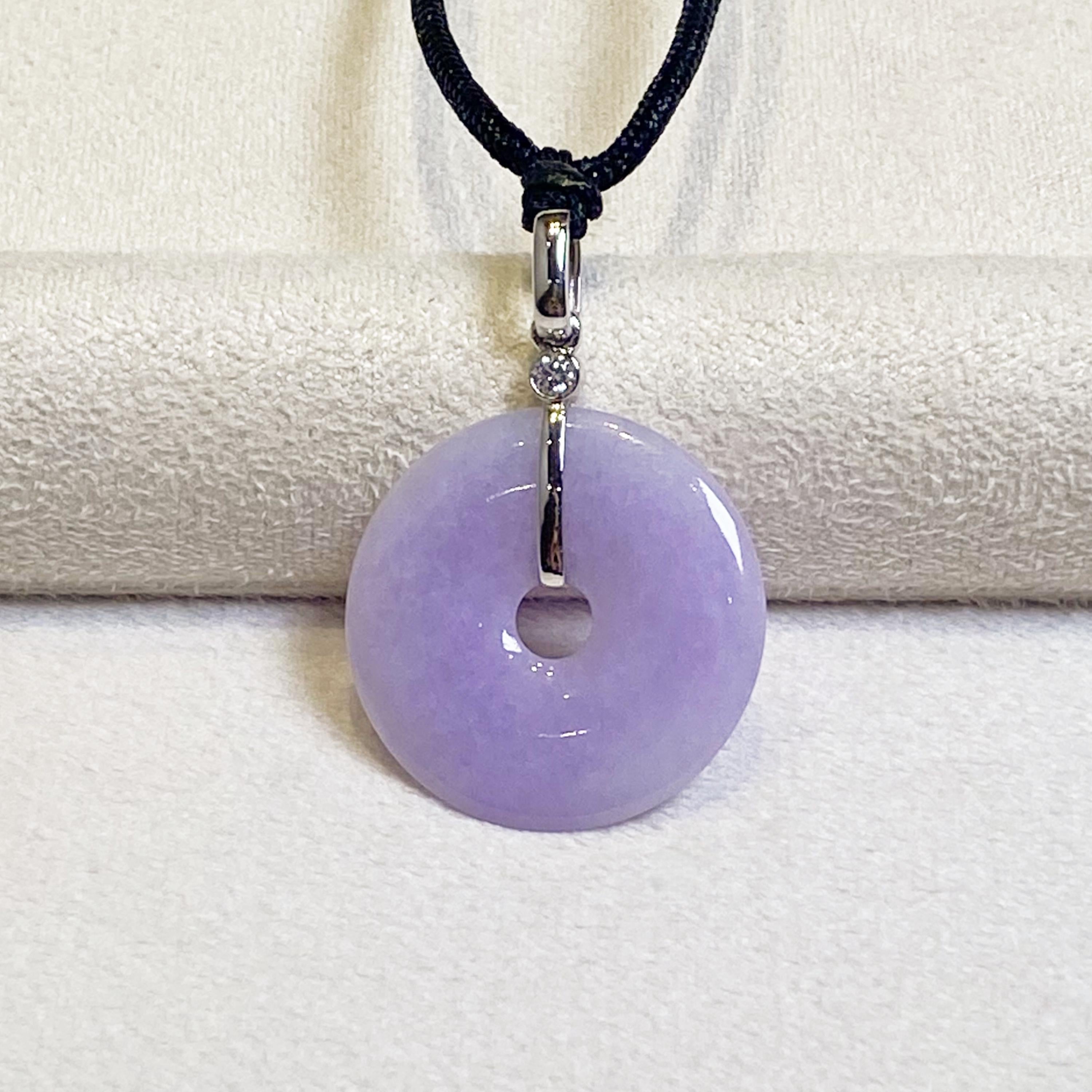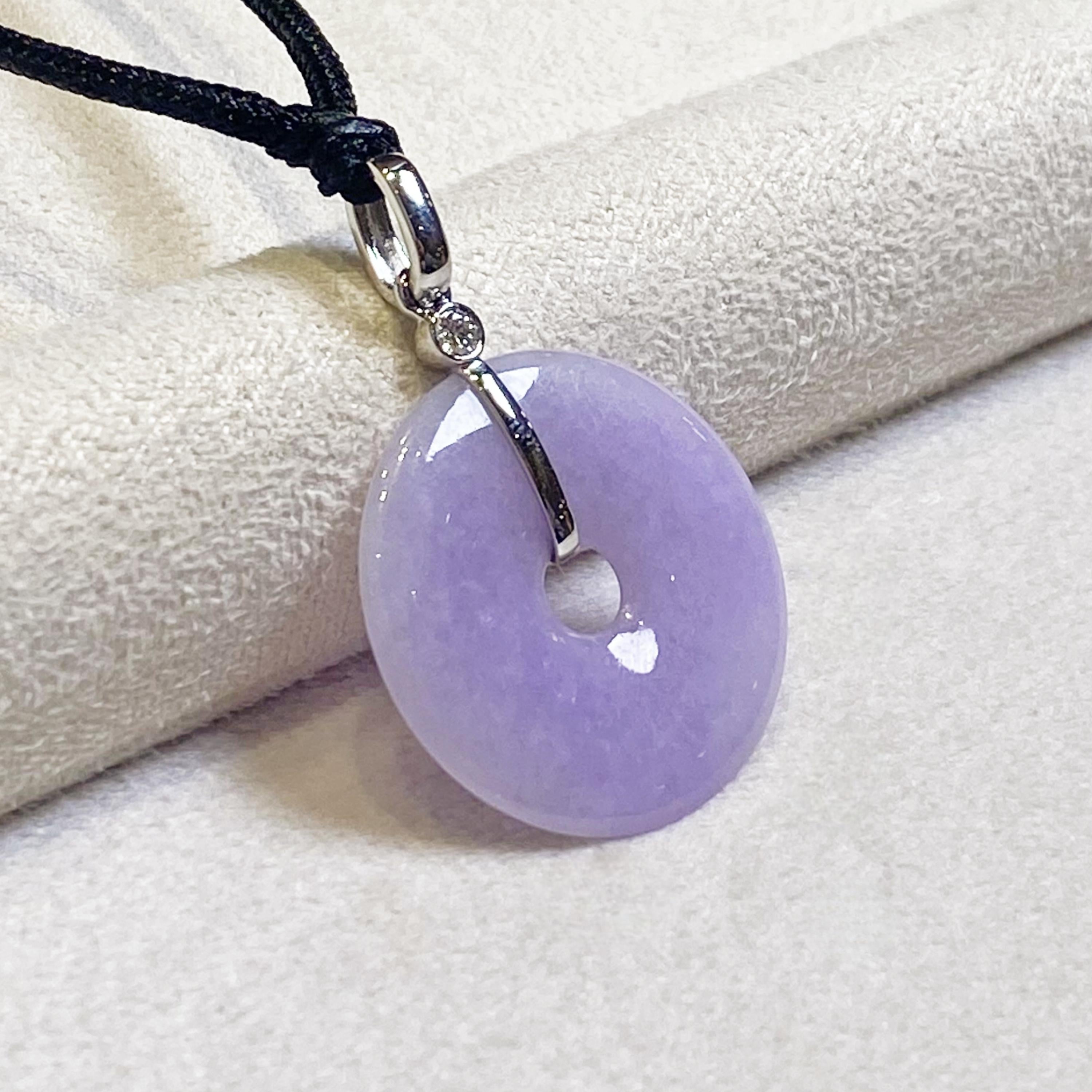 ✅This breathtaking round disc shape jade pendant is crafted from natural, untreated Type-A Burmese jadeite, prized for its natural intense purple hue. Meticulously hand-carved into the auspicious round shape symbol (representing peace and prosperity), the jade showcases mesmerizing color intensity and organic veining, a testament to its genuine, earth-formed beauty. The piece hangs from a premium adjustable silk cord and set in 18k solid white gold bail and diamonds.