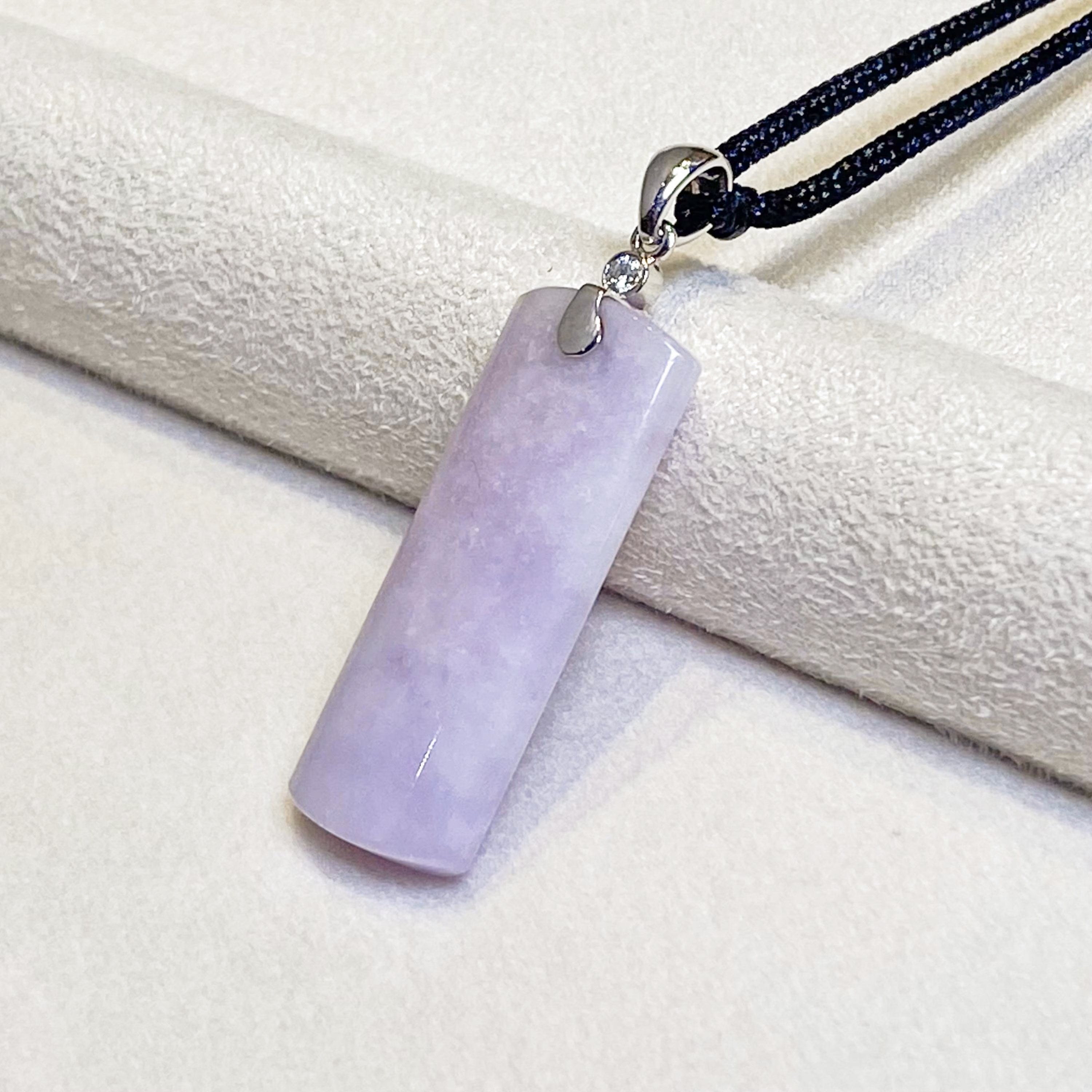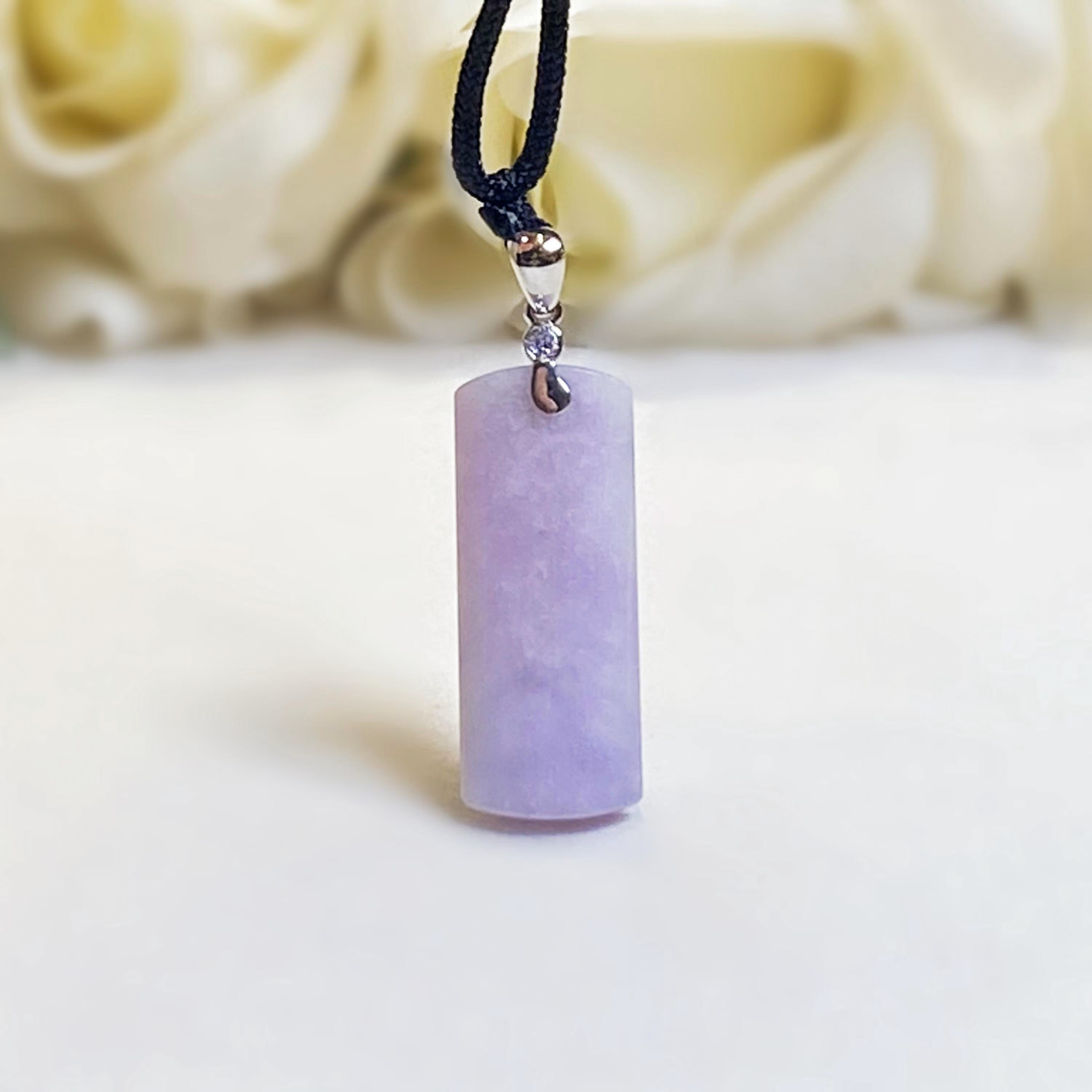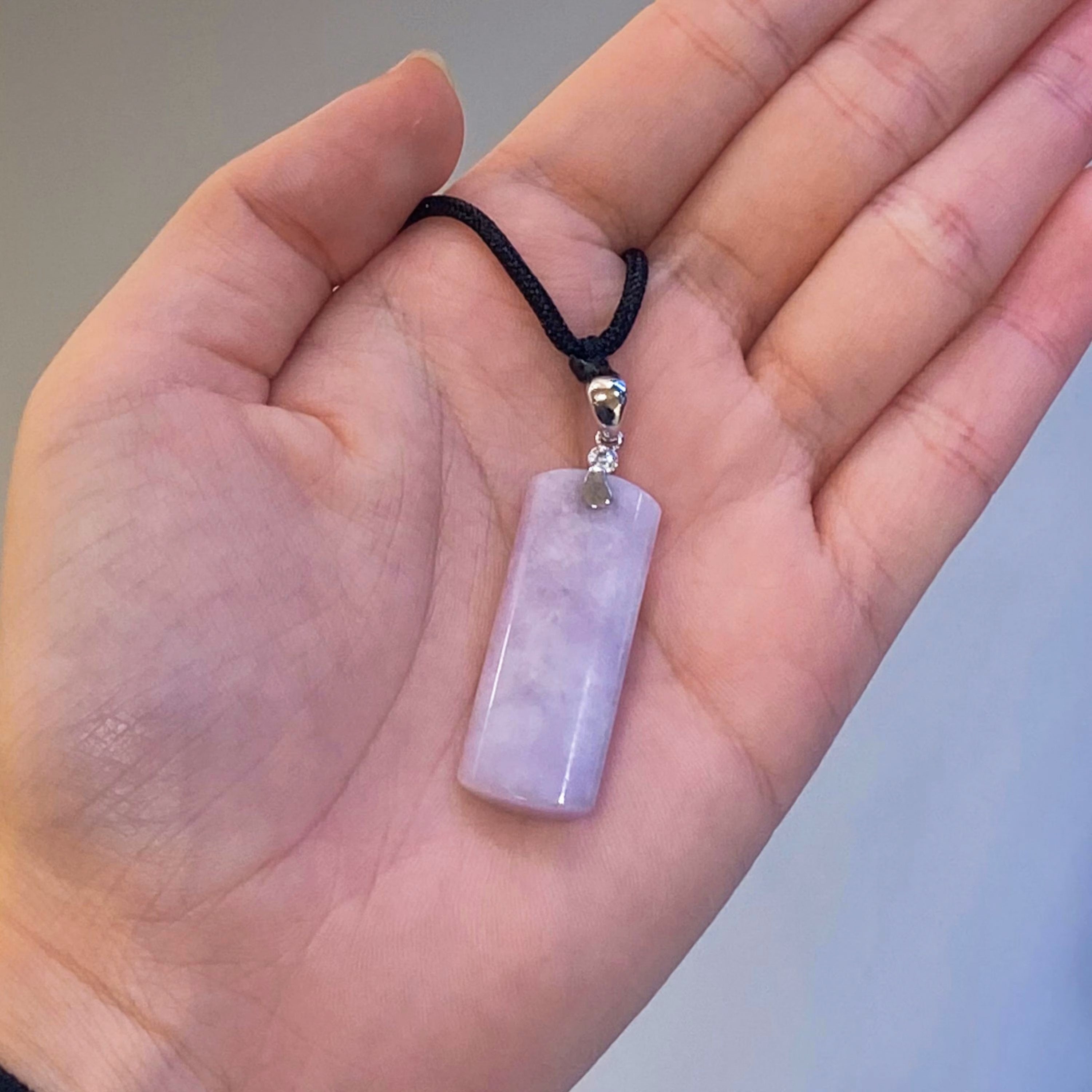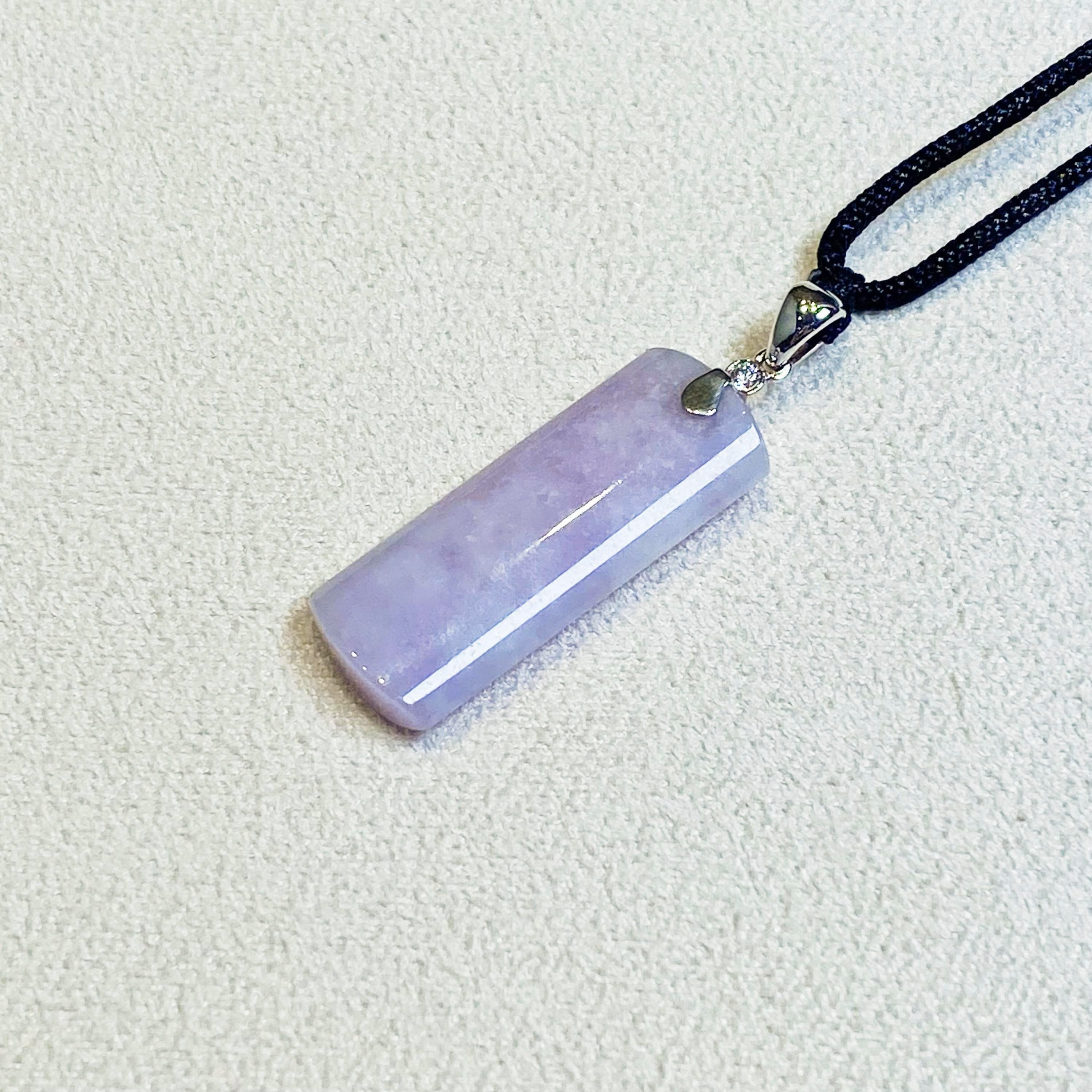 ✅This exquisitely crafted pendant features purple jade in a sleek rectangular shape, symbolizing creativity, balance, and serenity. Meticulously carved and skillfully polished, the pendant, set in 18k white gold bail, are delicately accented with a touch of minimalistic luxury.