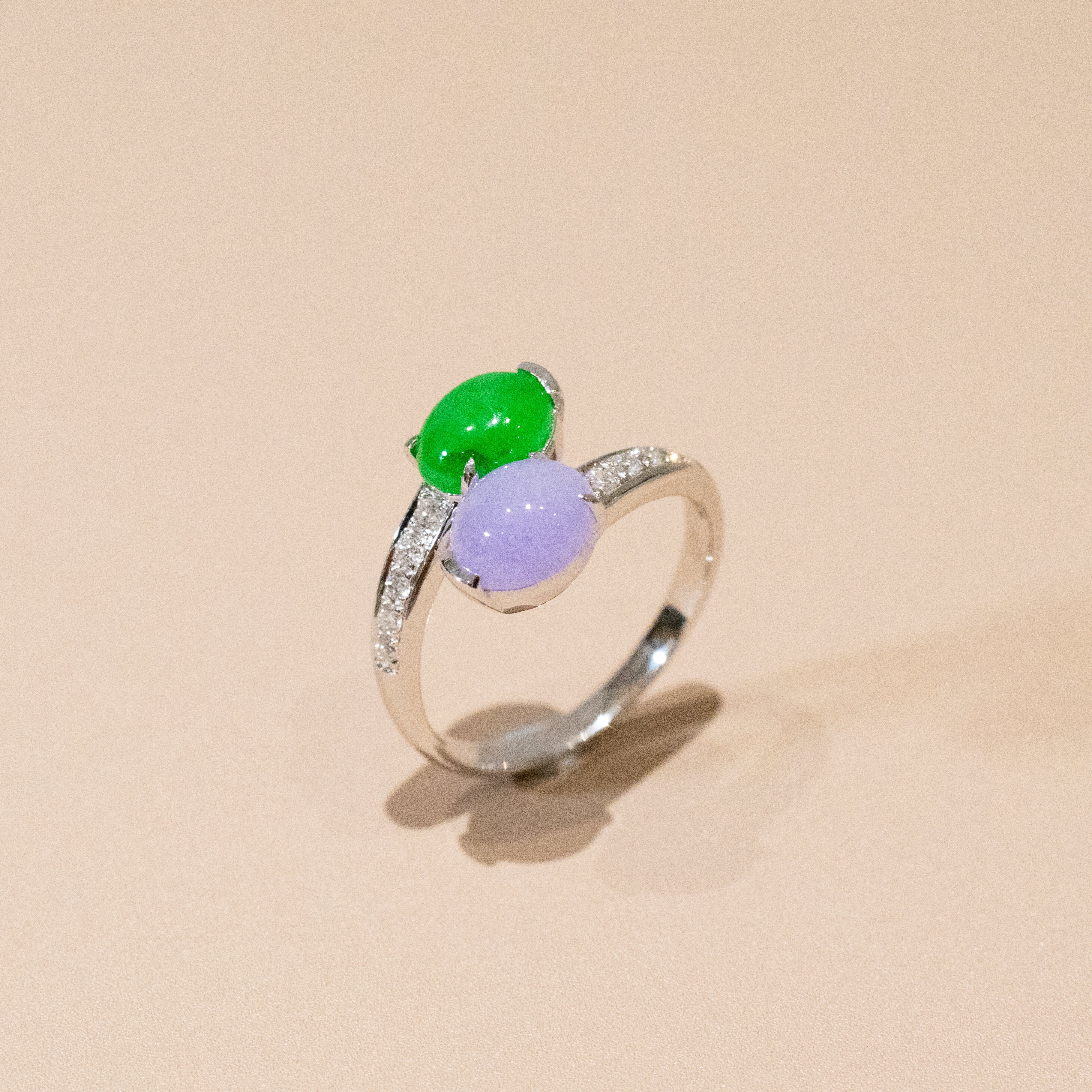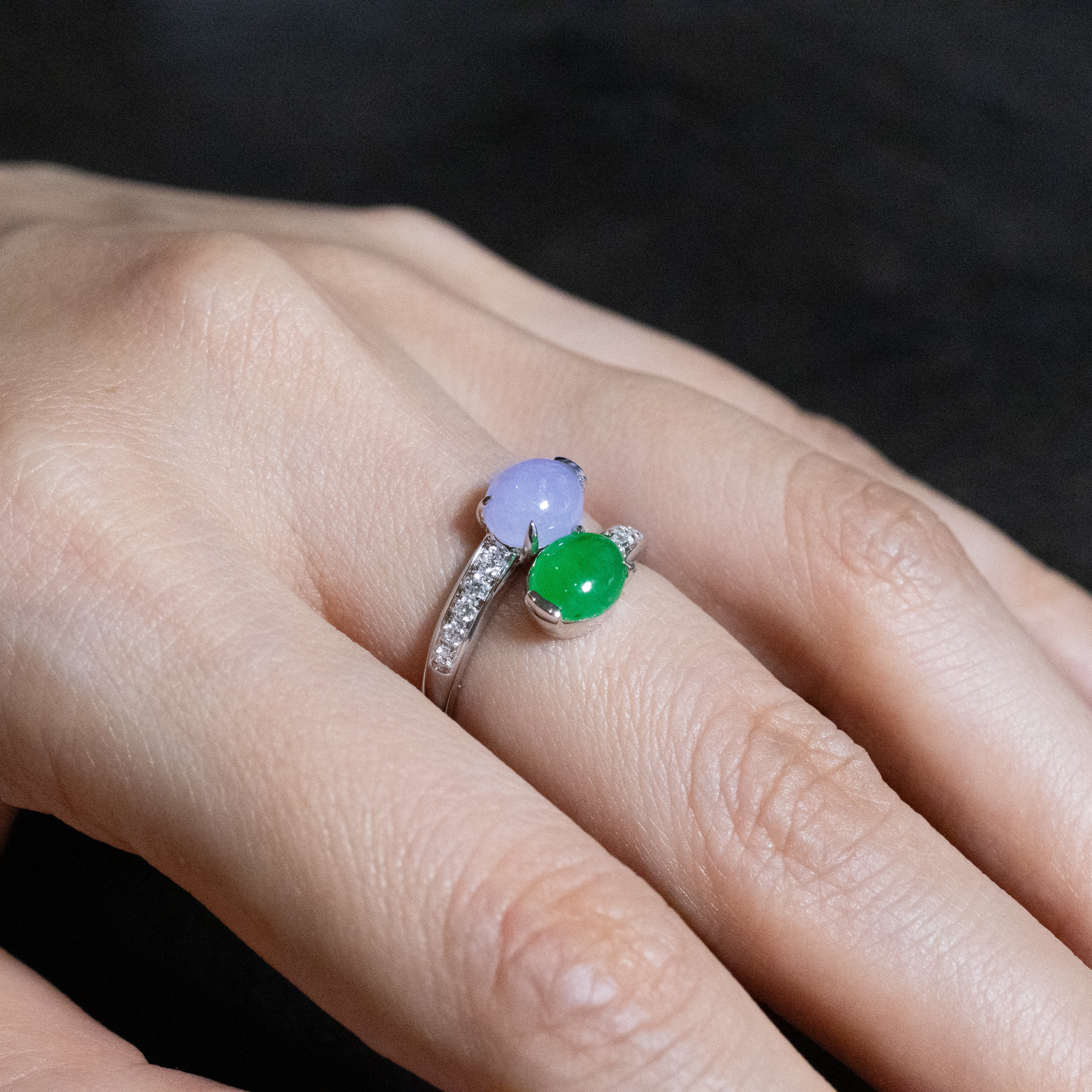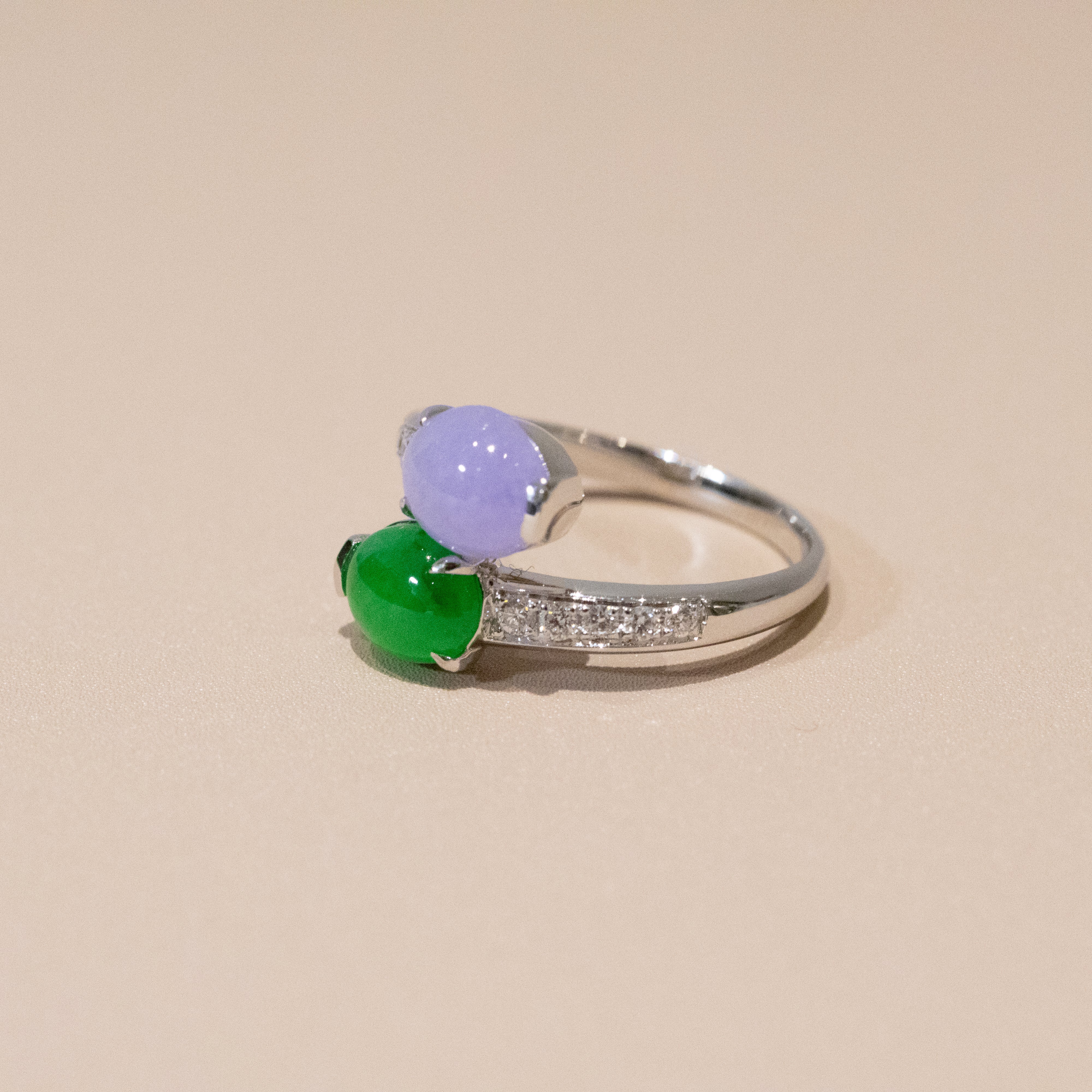 Rare Burmese Jade Cabochon Crossover Ring – Apple Green & Vivid Purple Jadeite, Diamond Accents, 18K White Gold
