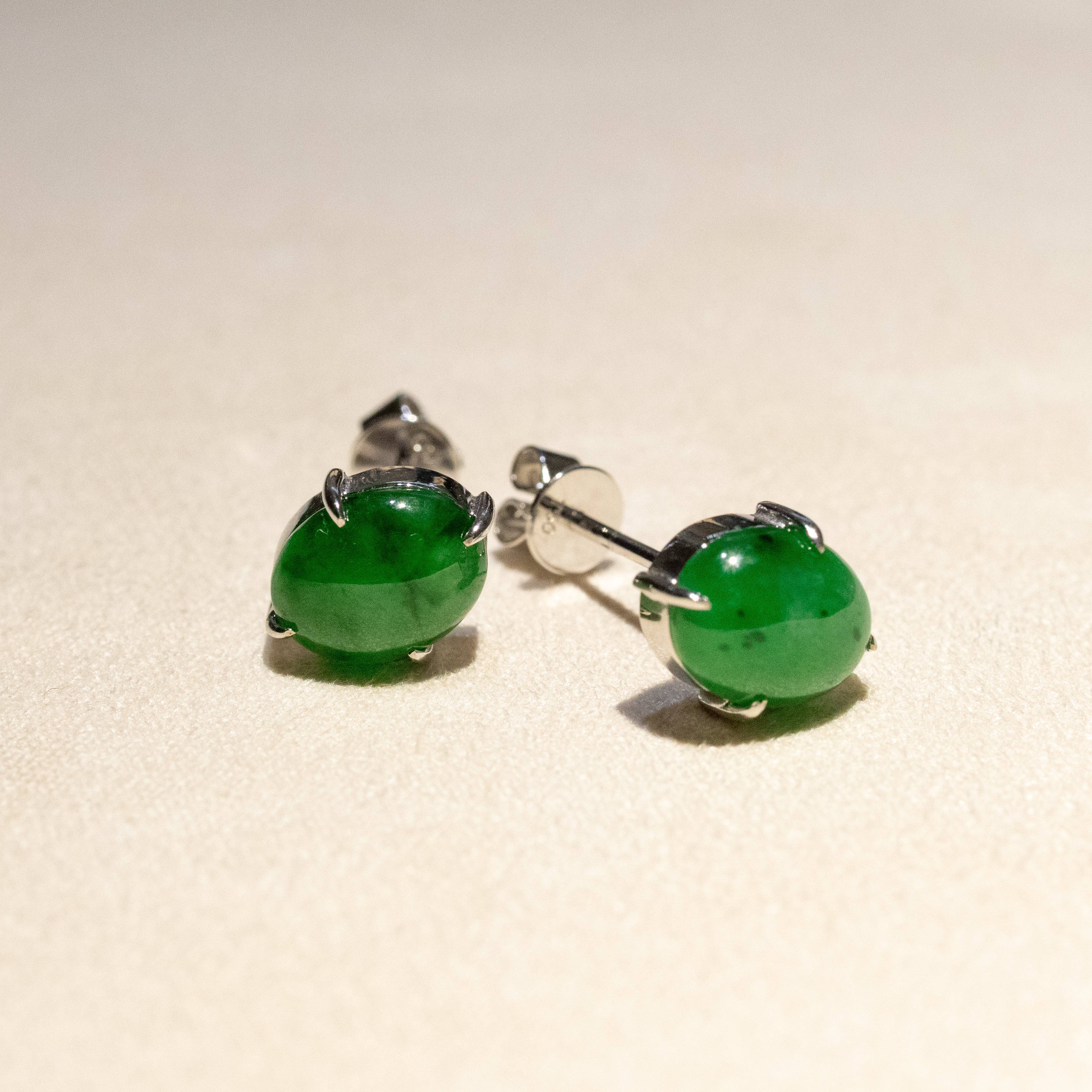 ✅These classic jade stud earrings showcase intense green grade natural Type-A Burmese jadeite, shaped in a classic oval cabochon. The jade displays excellent translucency and a vibrant, saturated green hue, emphasizing the gemstone’s natural depth and elegance.
