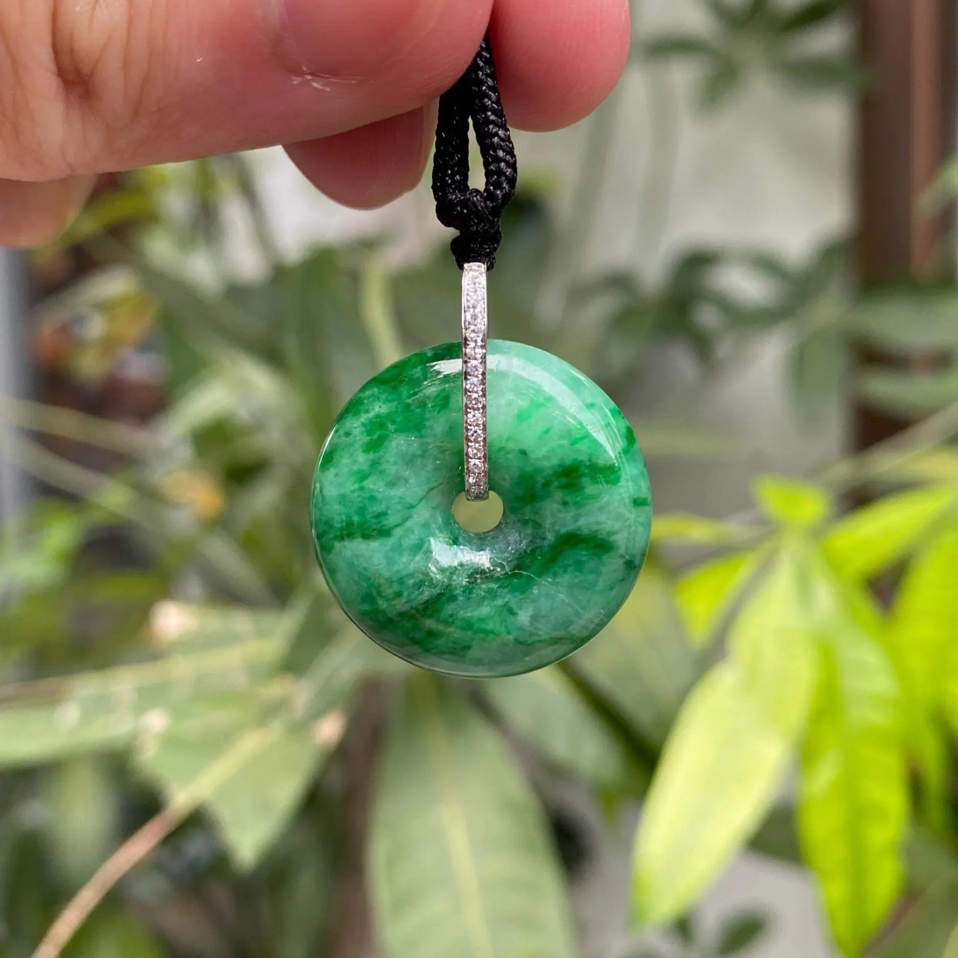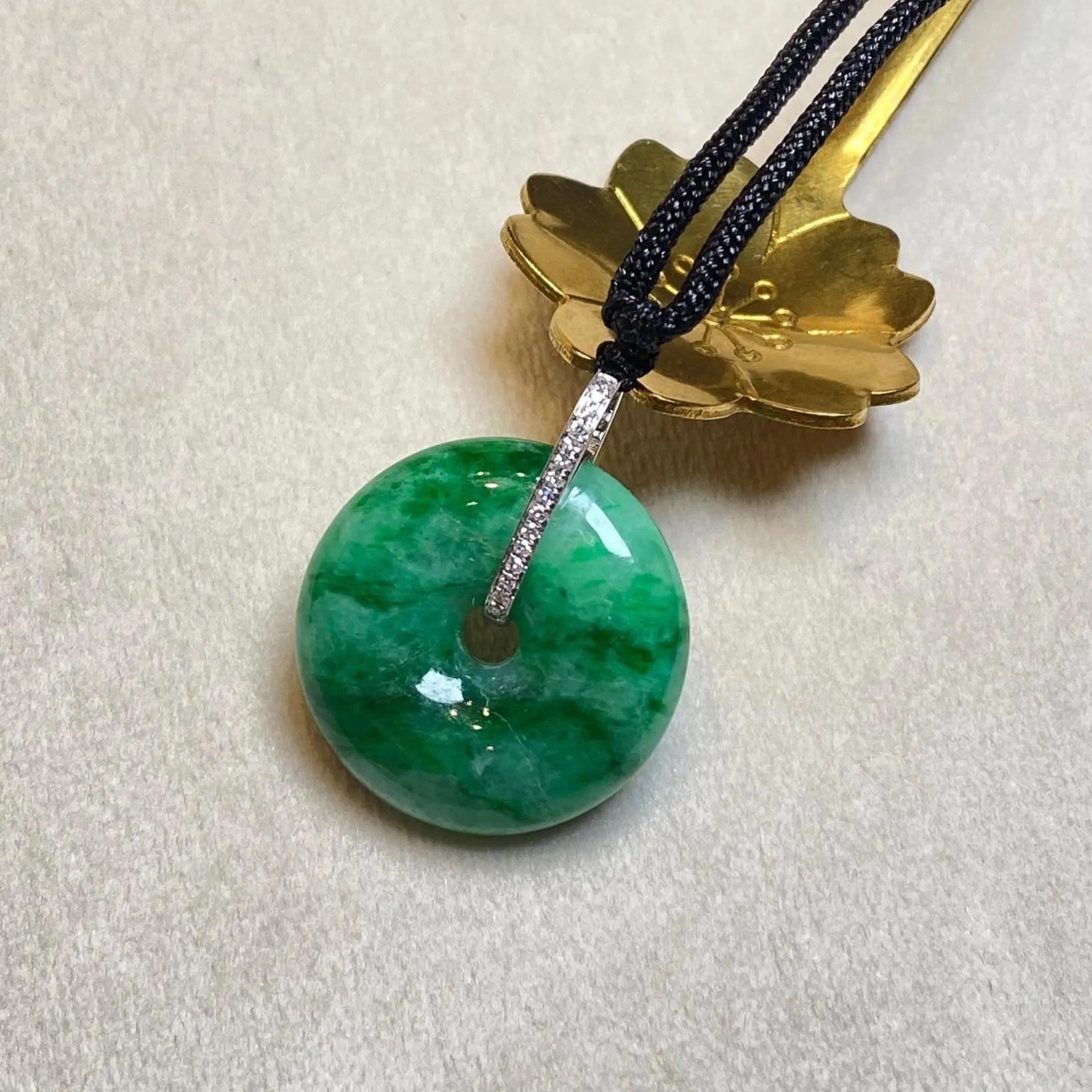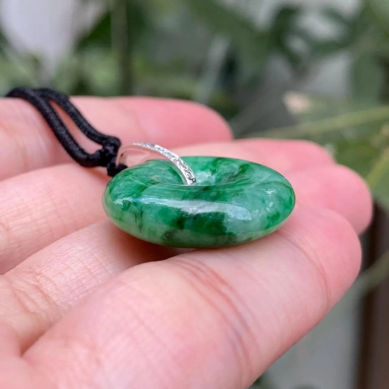 ✅This exquisite donut-shaped pendant showcases a rich, vibrant green jade, elegantly paired with a sparkling 18k white gold bail set with diamonds. A delicate matching green jade bead sits atop the donut, adding a touch of refined detail. Crafted from natural Type-A jadeite, this pendant is a true standout—measuring 29.9mm in length, 24.1mm in width, and 7mm thick. The lush green hue and diamond accents make it a luxurious yet wearable piece, perfect for special occasions or elevating everyday style.