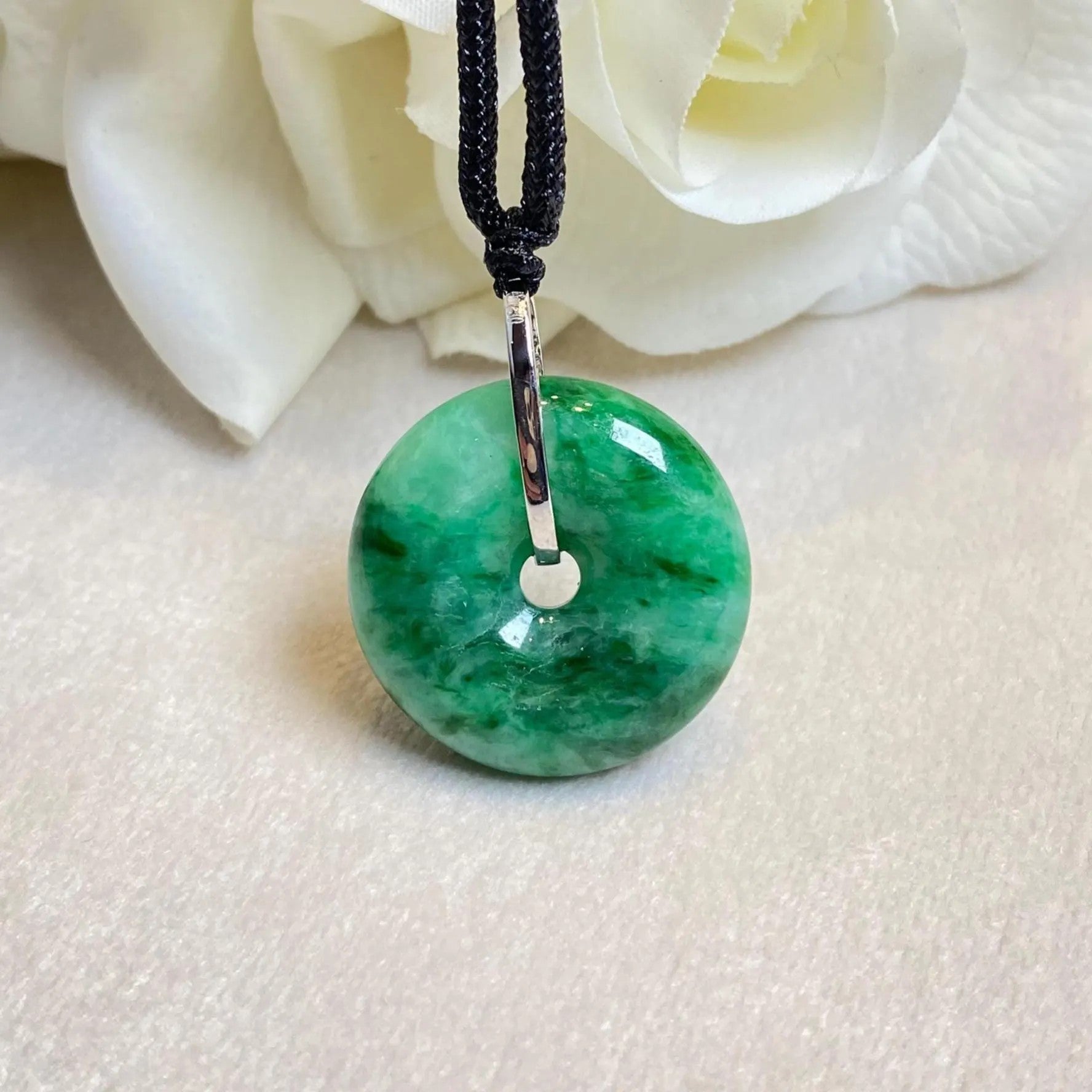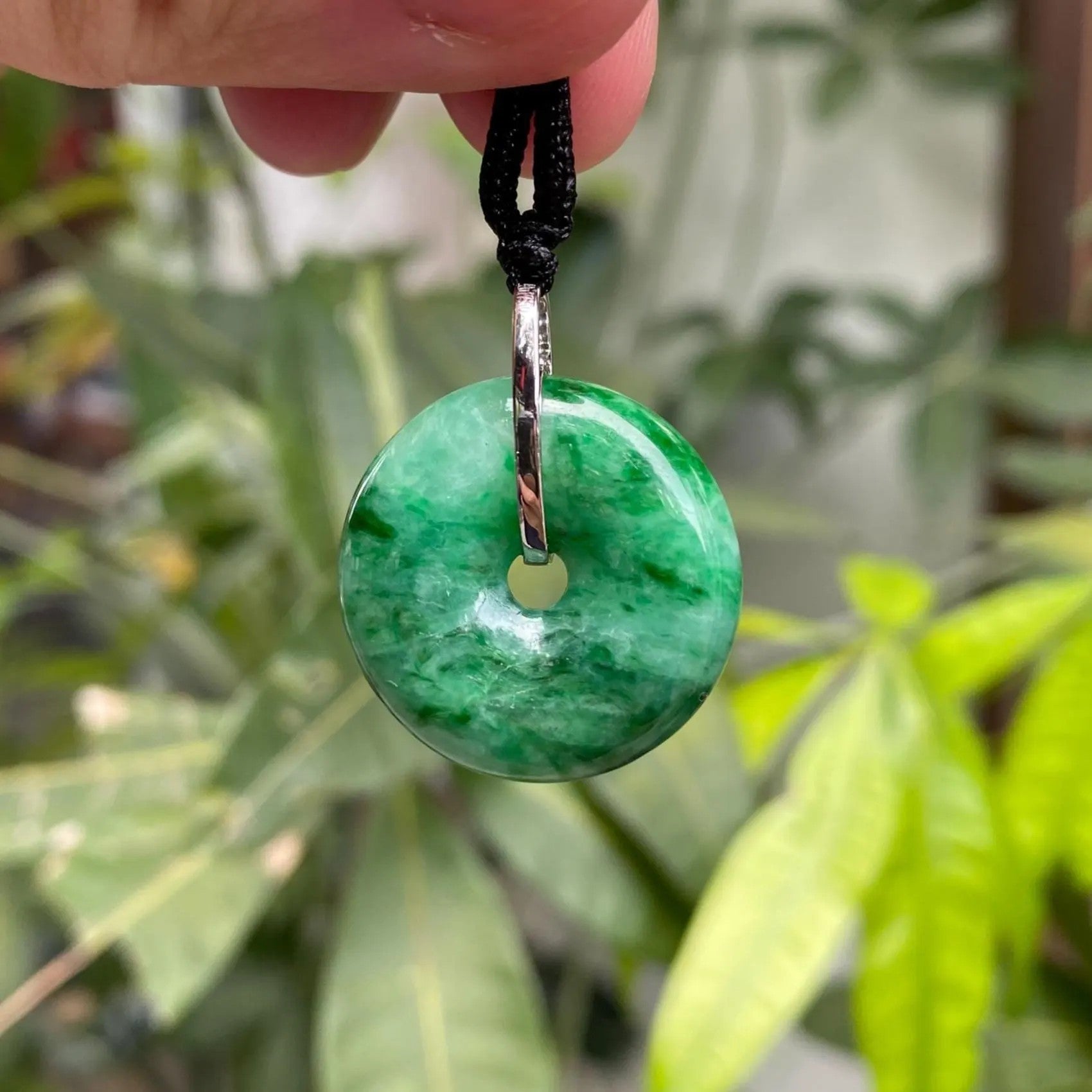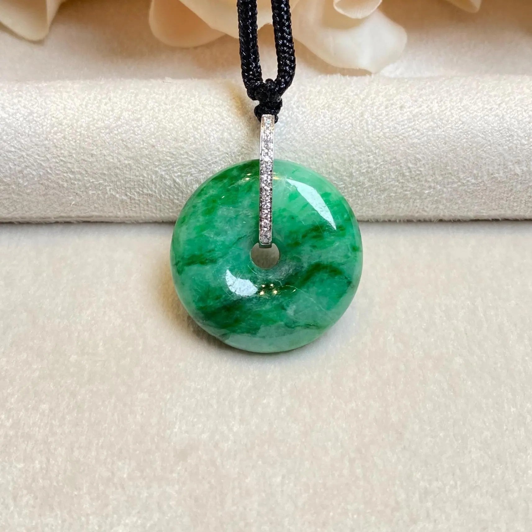 ✅This exquisite donut-shaped pendant showcases a rich, vibrant green jade, elegantly paired with a sparkling 18k white gold bail set with diamonds. A delicate matching green jade bead sits atop the donut, adding a touch of refined detail. Crafted from natural Type-A jadeite, this pendant is a true standout—measuring 29.9mm in length, 24.1mm in width, and 7mm thick. The lush green hue and diamond accents make it a luxurious yet wearable piece, perfect for special occasions or elevating everyday style.