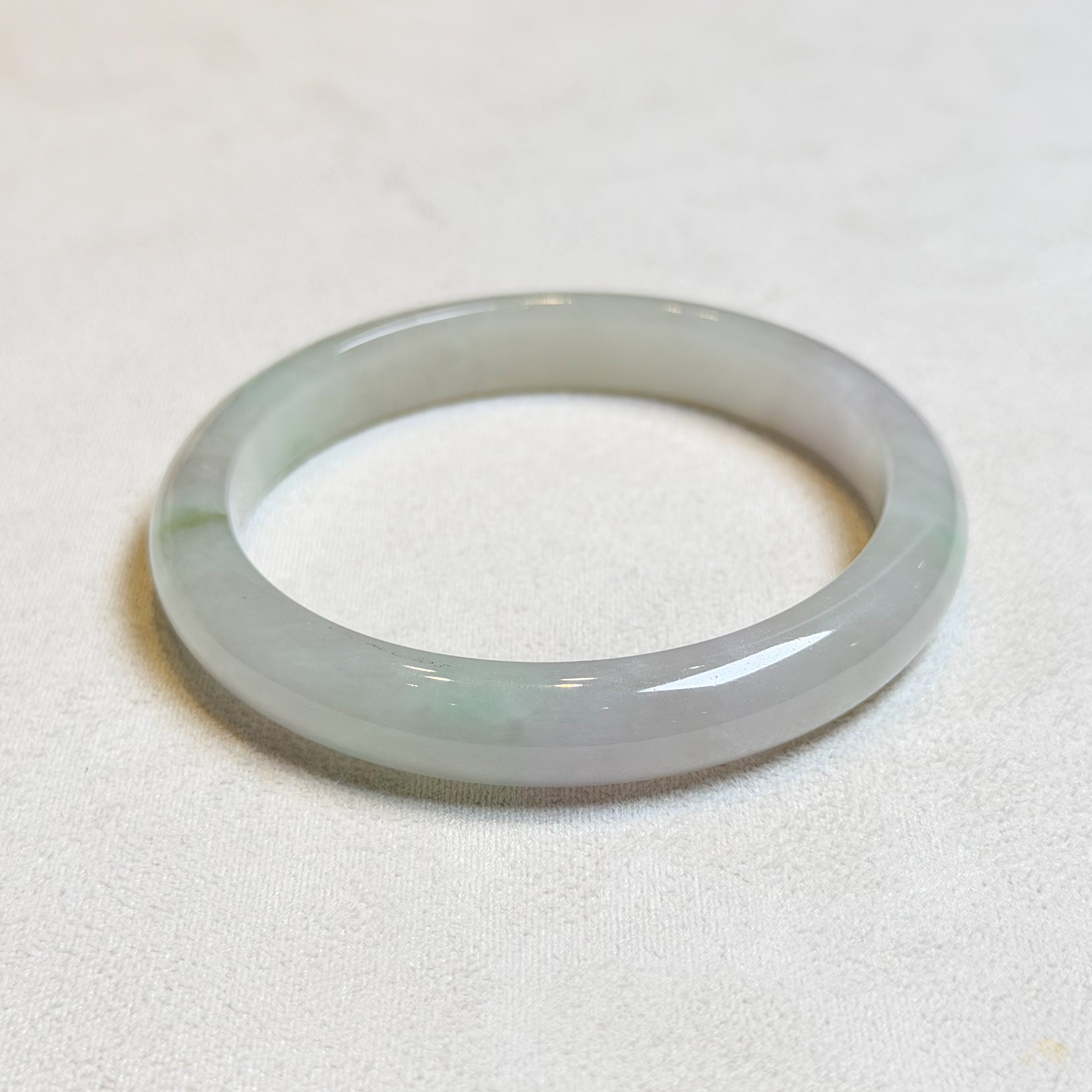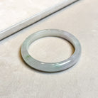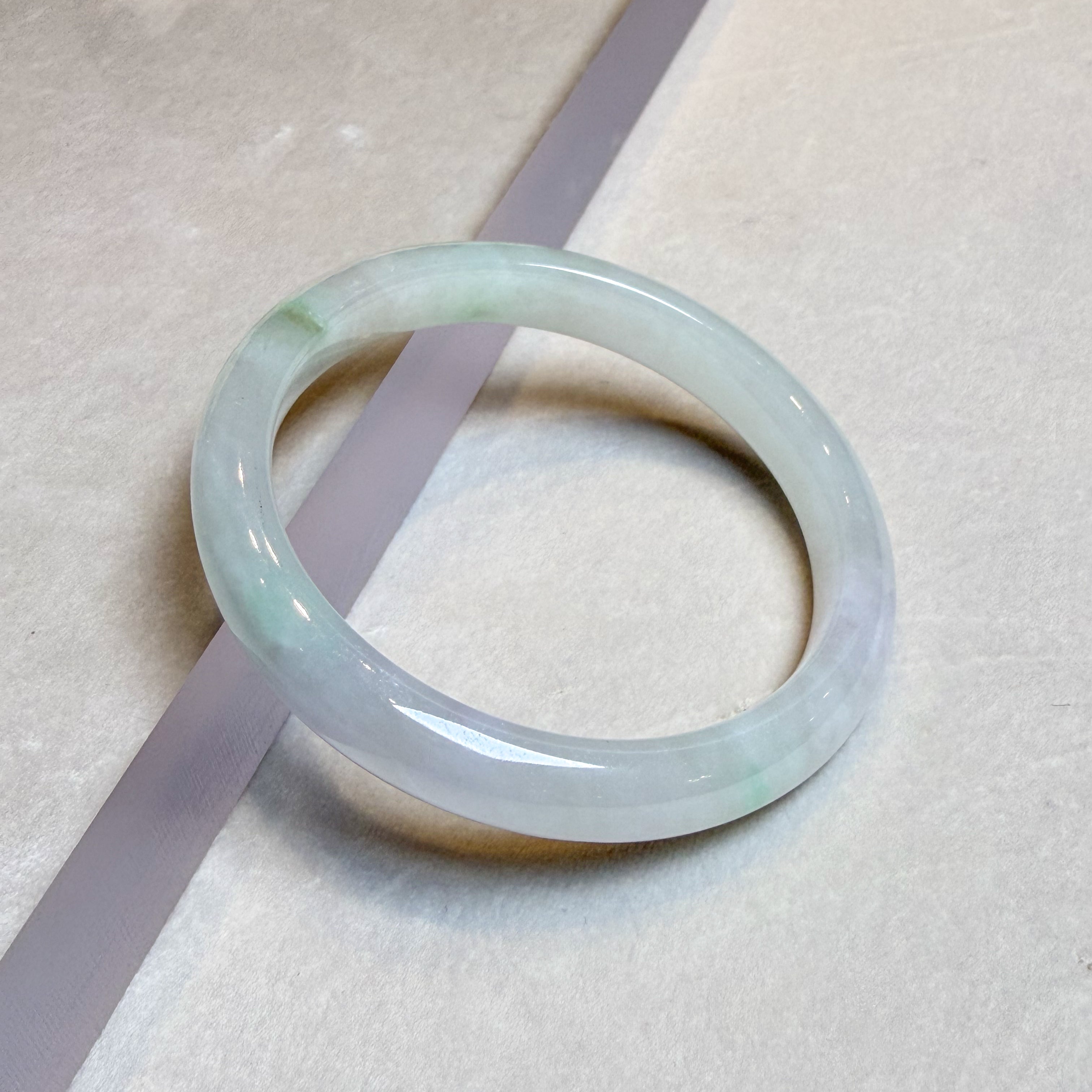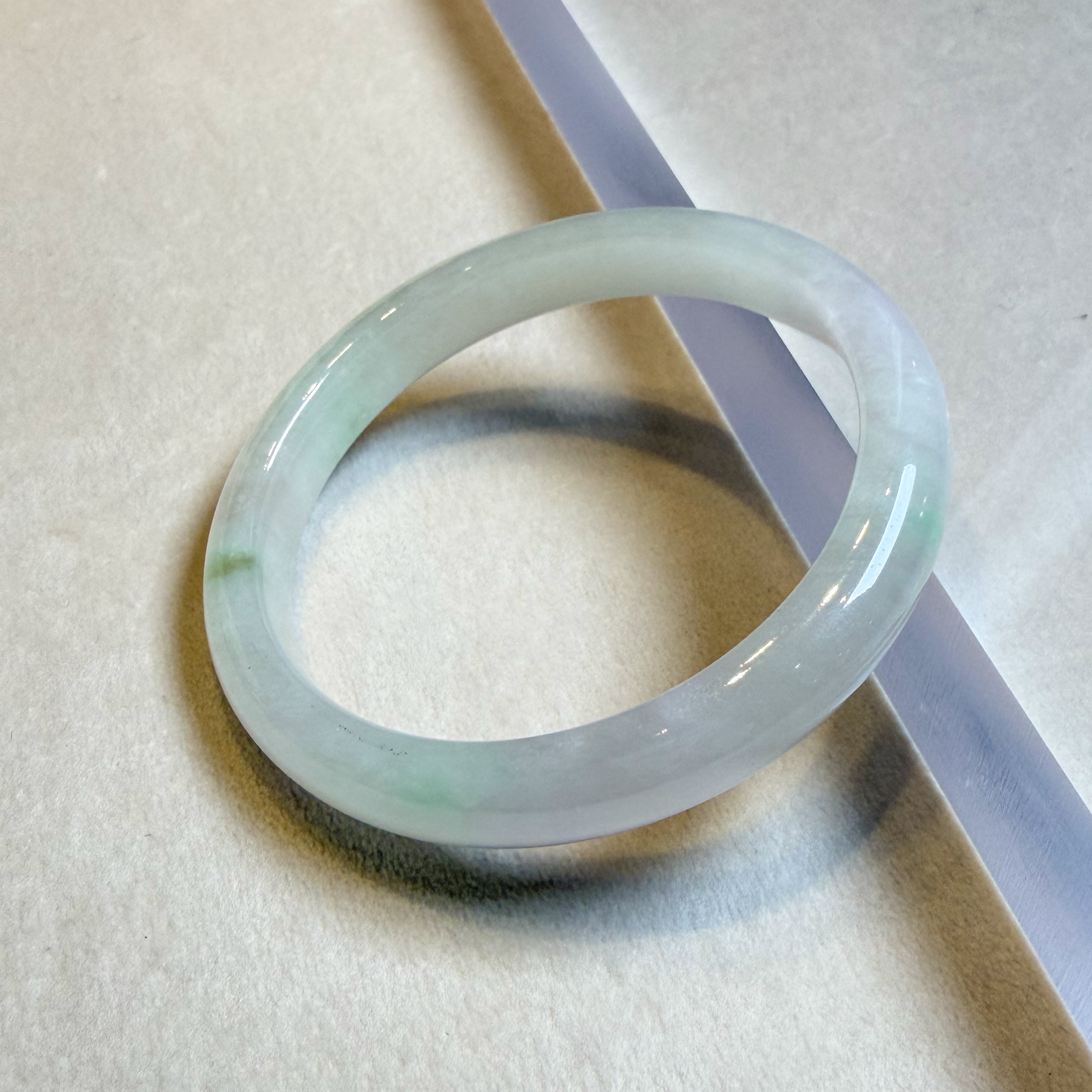 ✅This exquisite 56.8mm natural Burmese jade bangle bracelet showcases a unique flat inner surface and convex outer design, featuring a 10mm width and 7.5mm thickness. Crafted from untreated Type A jade with scattered apple green hues and excellent translucency, this authentic piece from Burma offers timeless elegance, ideal for gifting or personal wear.