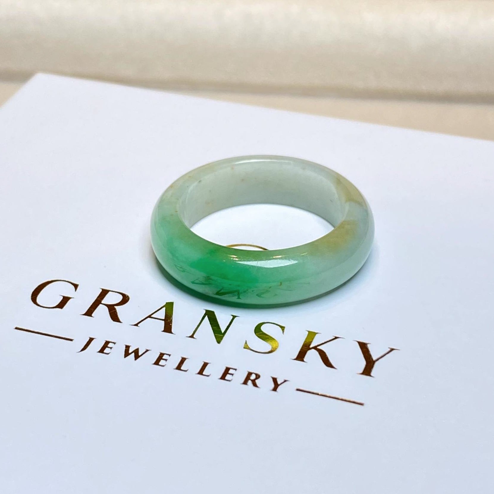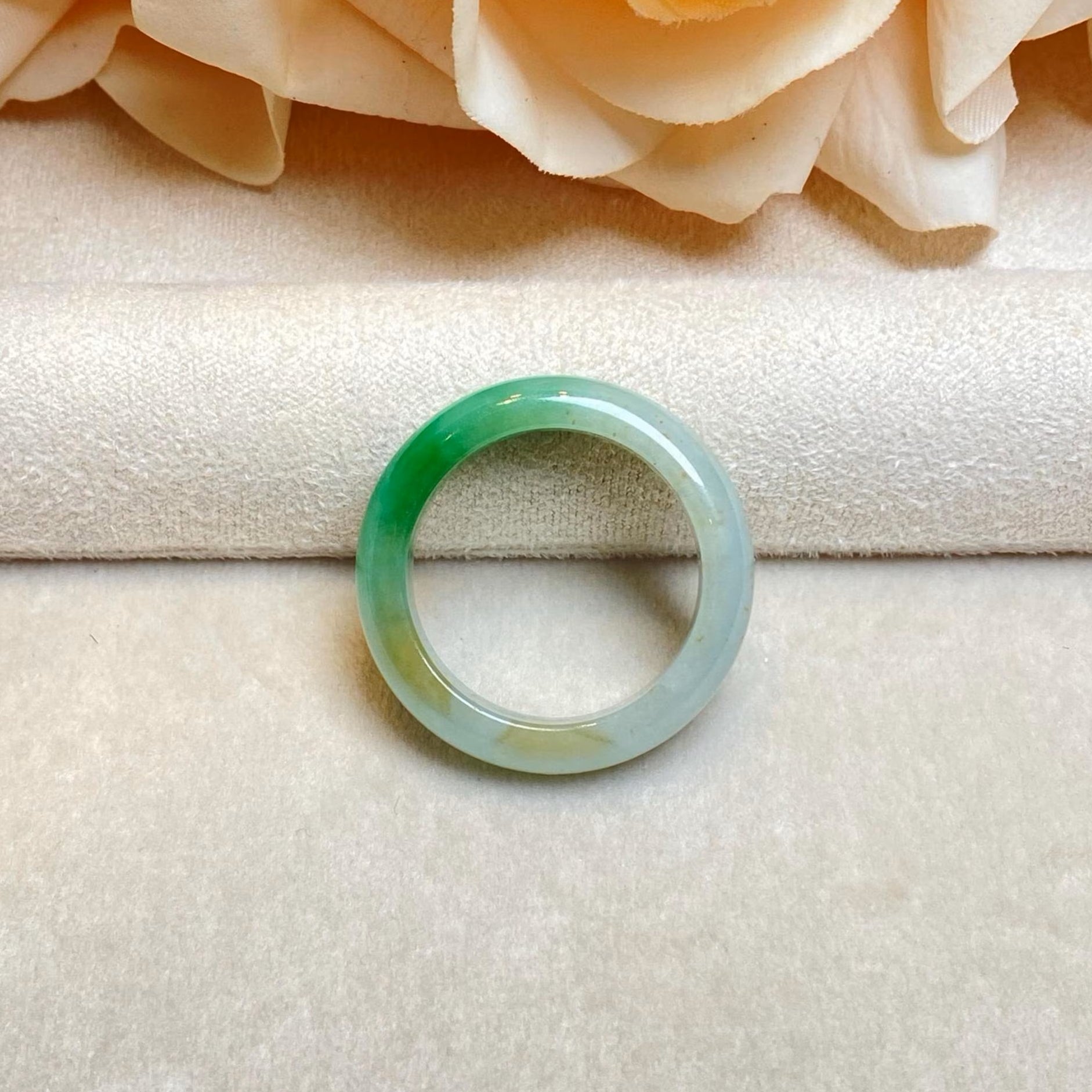 ✅This Type-A Burmese Green Jade Saddle Ring exudes bold sophistication with its striking color contrast. The vibrant green jade gracefully cascades across the top of the saddle design, while the rest of the ring features smooth, luminous white and brown jade—creating a mesmerizing natural unique pattern. Expertly crafted for a flawless fit, this ring is sized at US 9.25 (inner diameter 19.2mm). A rare and captivating piece, it symbolizes passion and purity, making it a standout gift or a treasured addition to any jewelry collection.