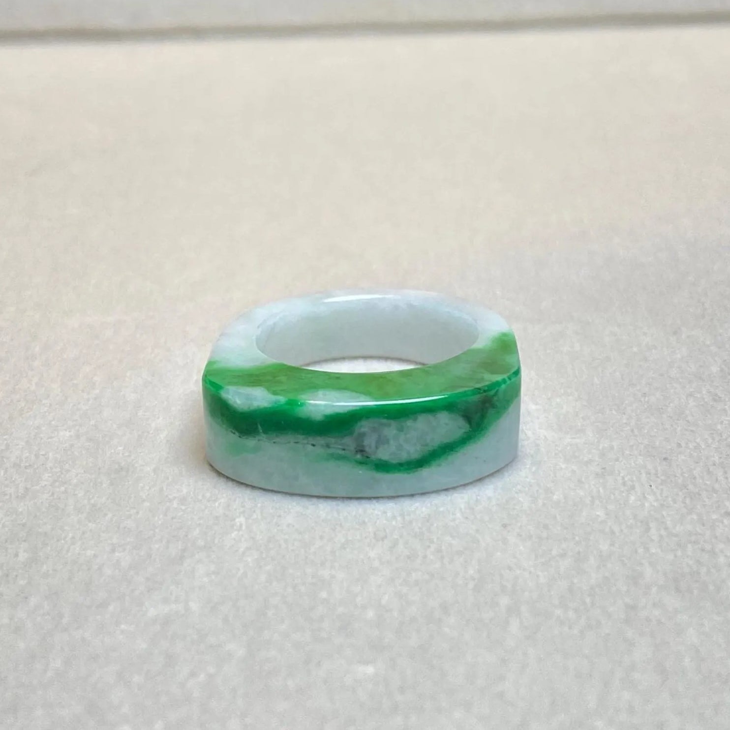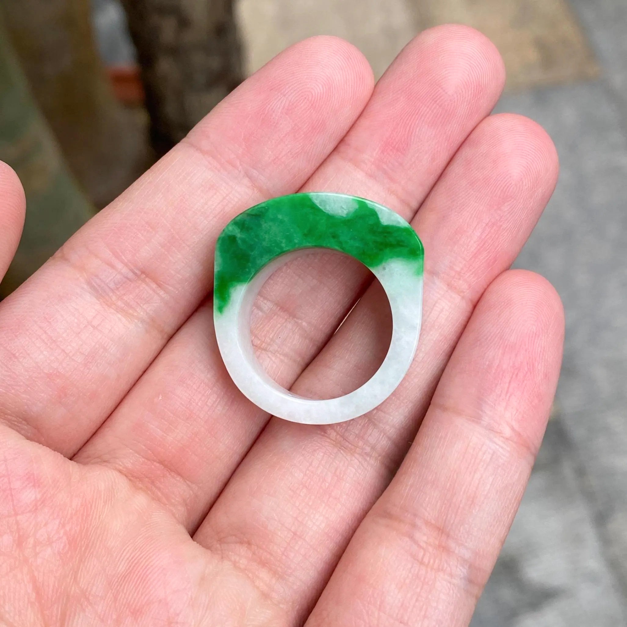✅These Type-A Burmese Green Jade Saddle Rings exude bold sophistication with its striking color contrast. The vibrant green jade gracefully cascades across the top of the saddle design, while the rest of the ring features smooth, luminous white jade—creating a mesmerizing natural unique pattern. Expertly crafted for a flawless fit, these rings are available in sizes US 9.25 (inner diameter 19.2mm). A rare and captivating piece, it symbolizes passion and purity, making it a standout gift or a treasured addition to any jewelry collection.