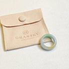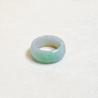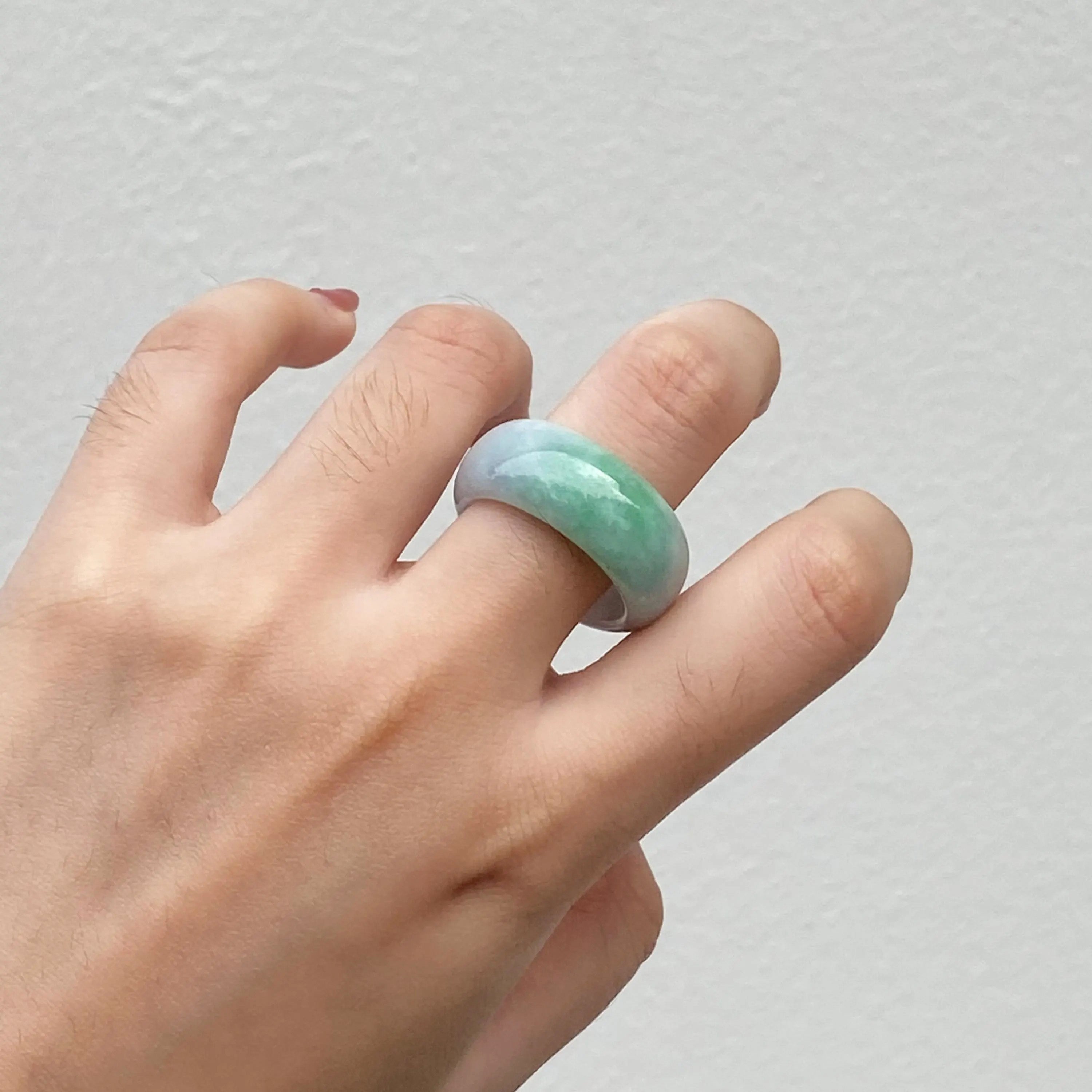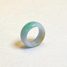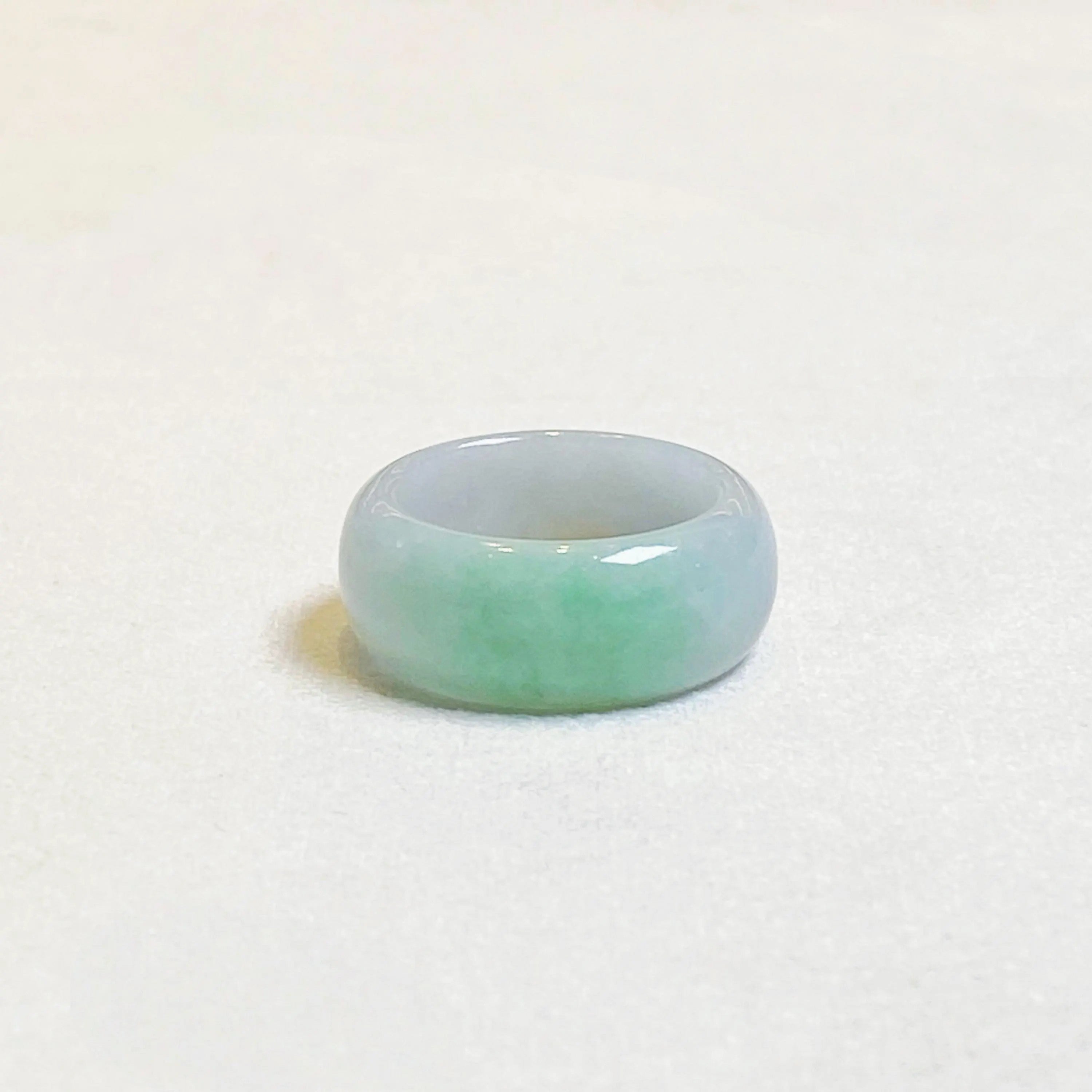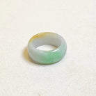 A distinctive jadeite ring featuring a natural blend of green and warm brown hues, creating an earthy and balanced aesthetic. Crafted from untreated Type A Burmese jadeite, this US 9.5 ring showcases a smooth 10 mm wide band with a 3.5 mm thickness for comfortable everyday wear. Its gradient color distribution and polished finish make it a refined piece for collectors and jade lovers alike.