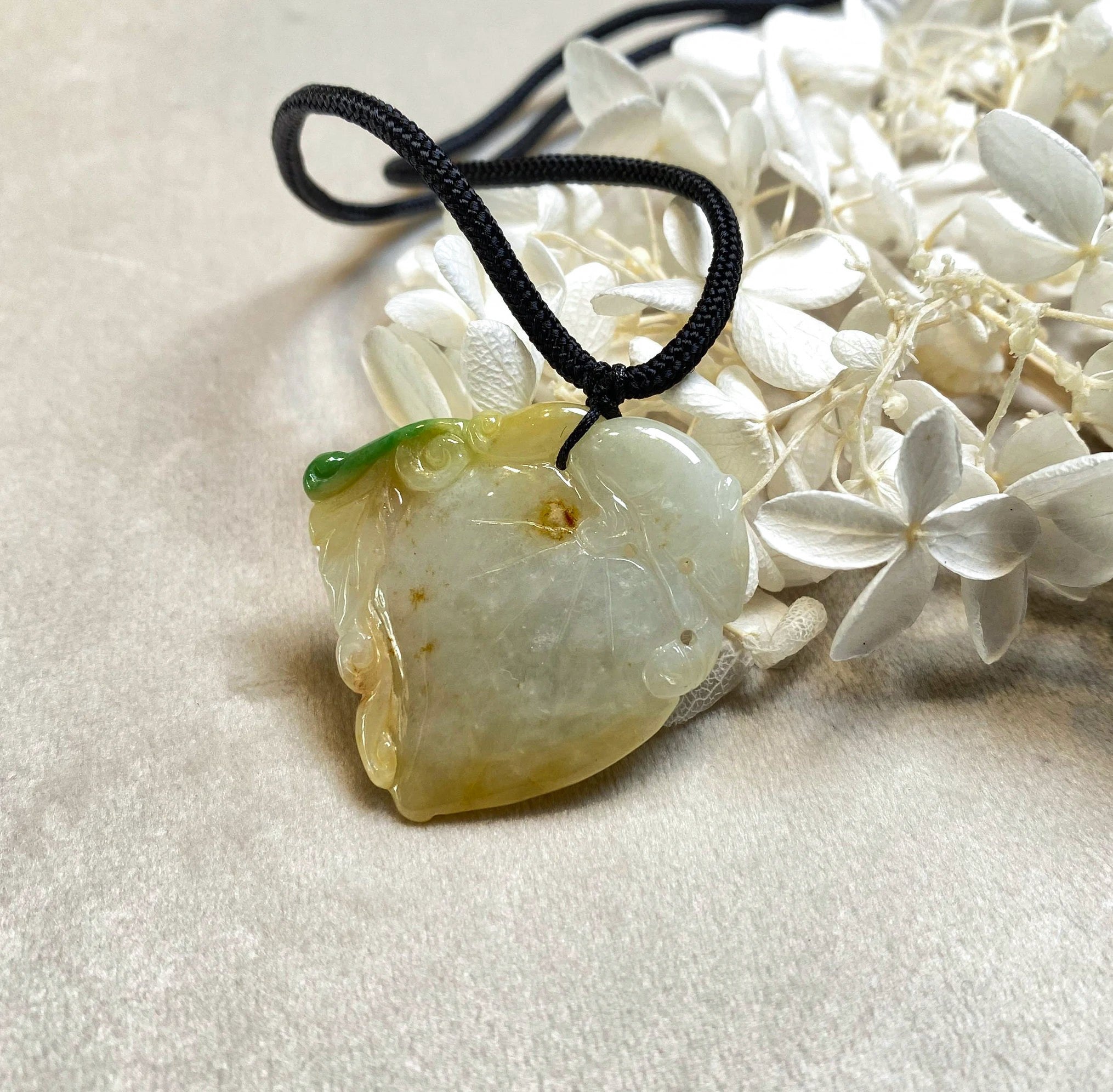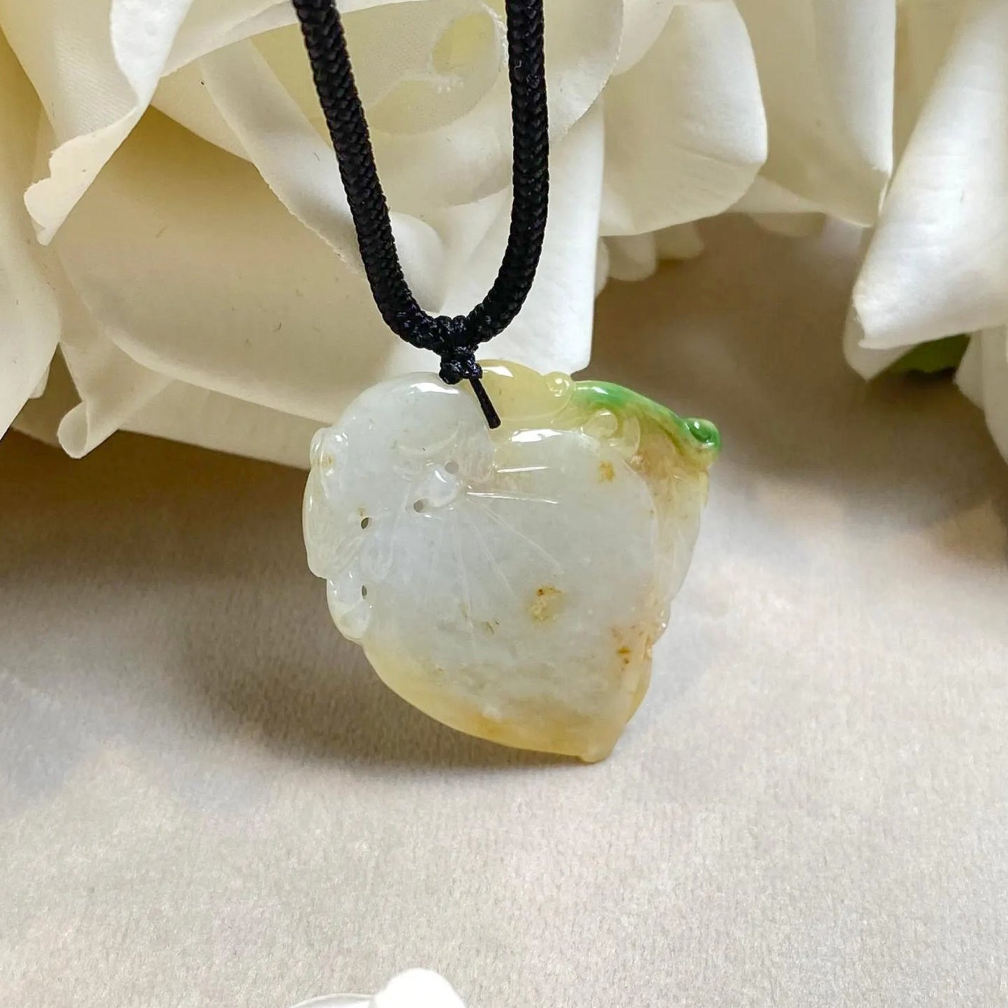 ✅This enchanting gradient orange peach-shaped jadeite pendant embodies timeless grace with its hand-carved, organic silhouette. Suspended from a sleek, adjustable black cord, the pendant features a lustrous, polished surface that transitions seamlessly from soft mint to deep emerald green. The natural gradient hues and intricate carving ensure each piece is one-of-a-kind, celebrating the artistry of jade.