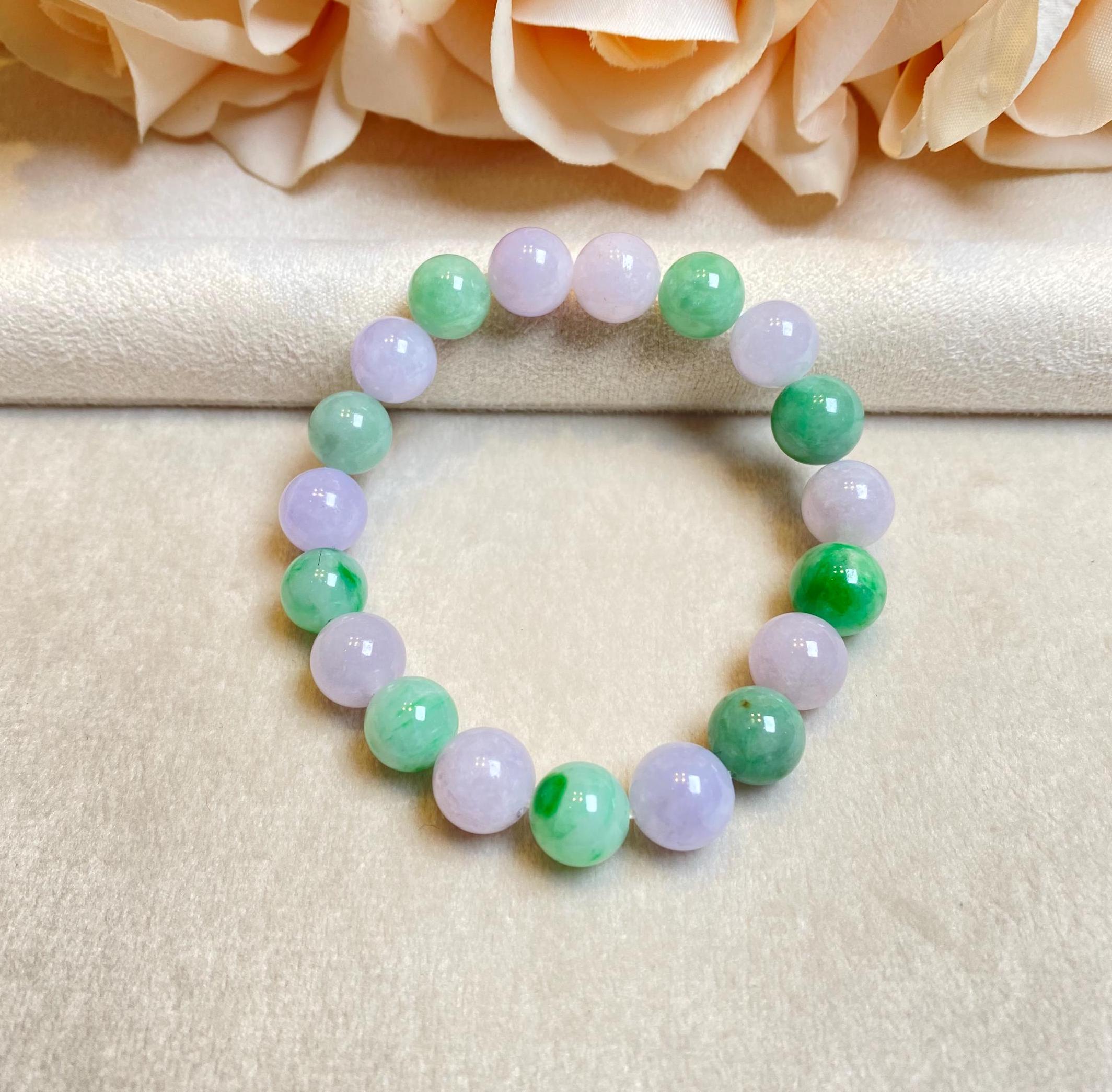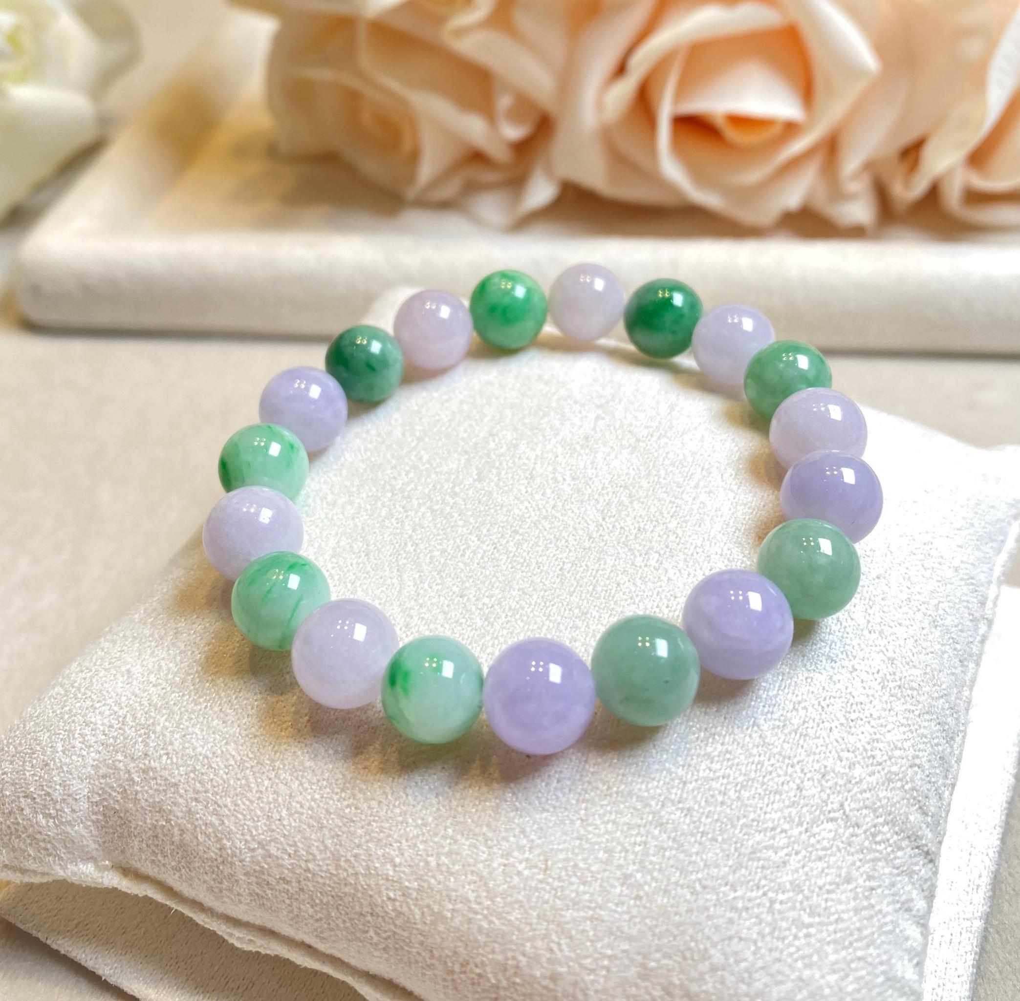 Alternating Green and Purple Jade Beaded Bracelet - 9-9.5mm Beads, 17cm, Natural Jadeite