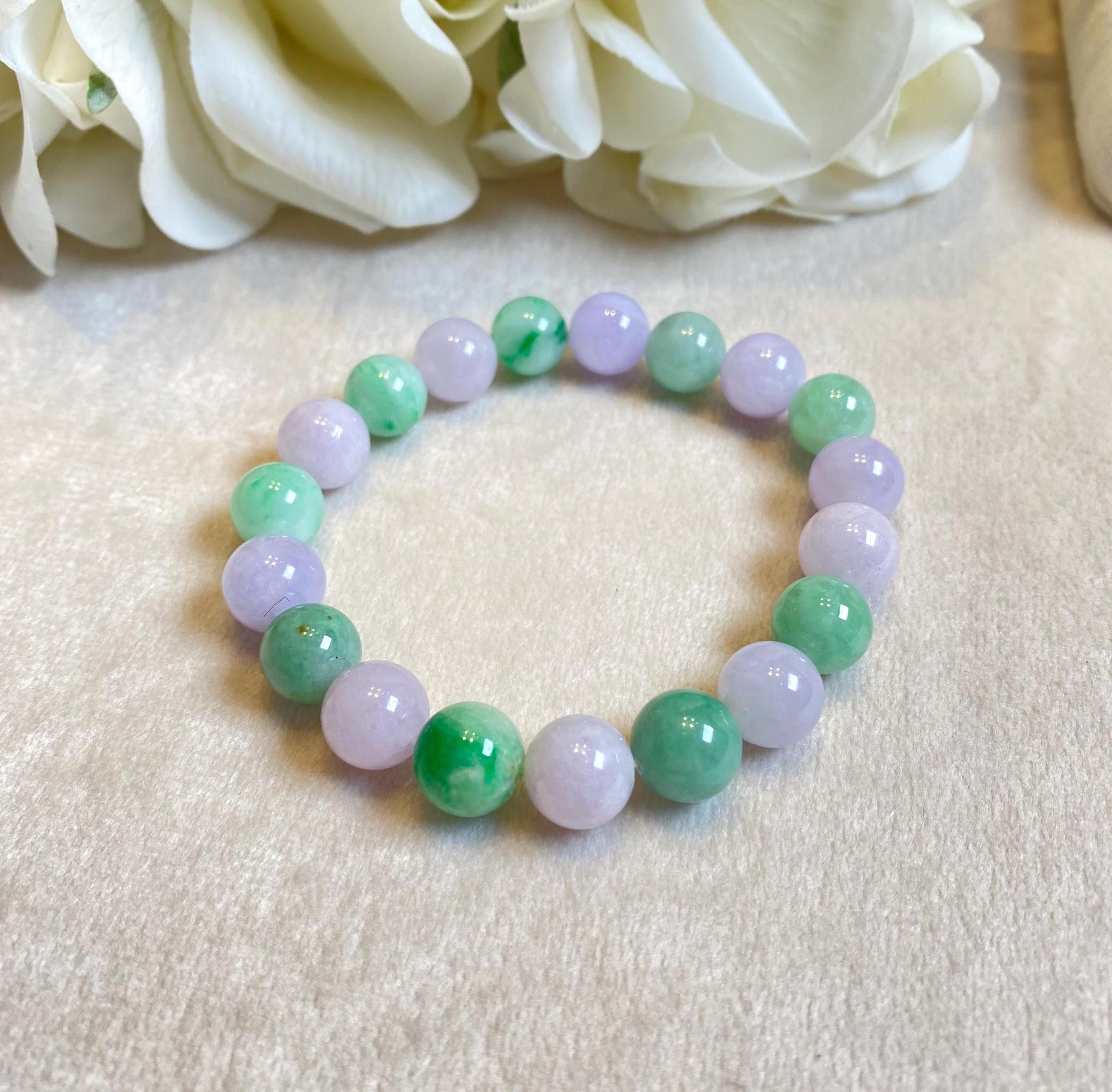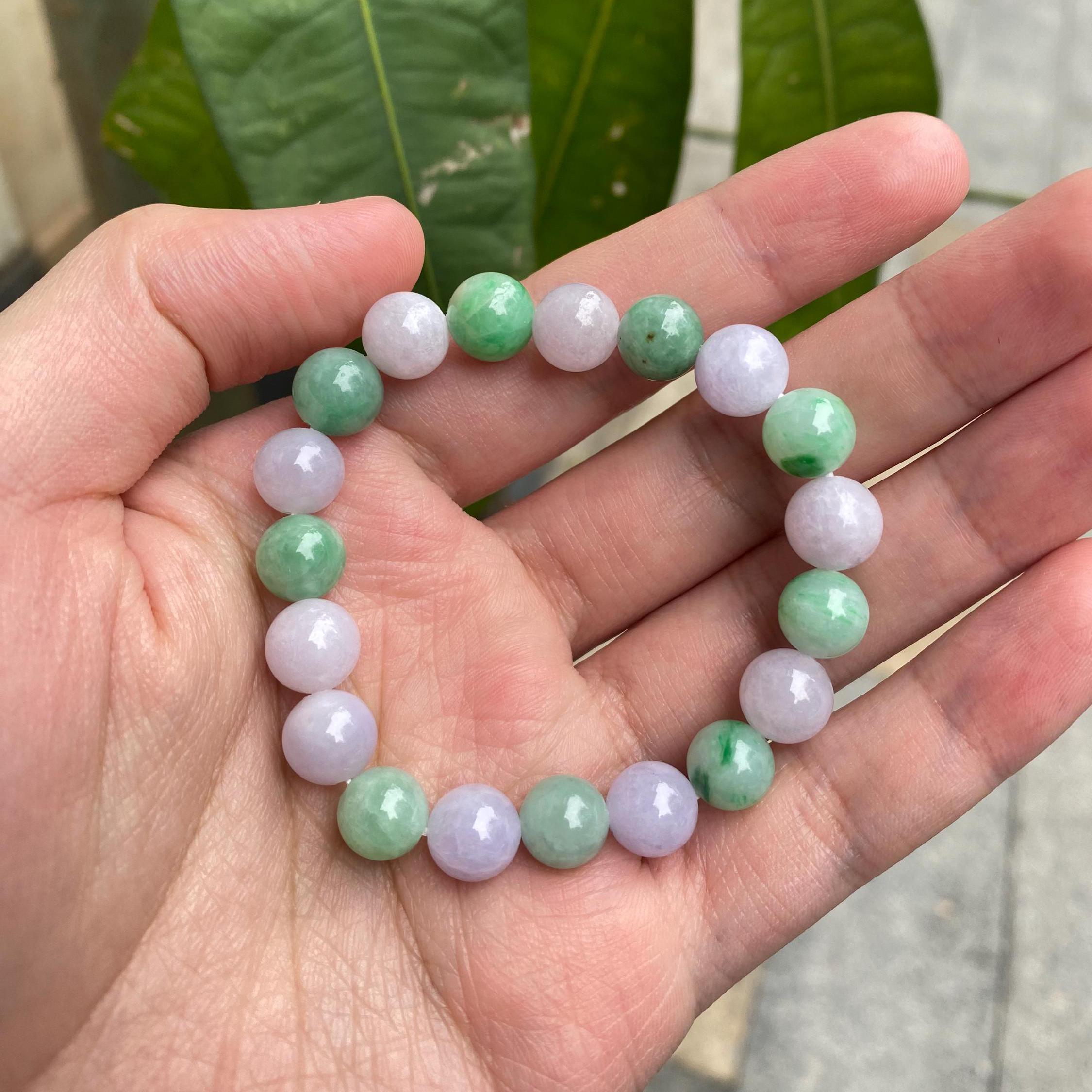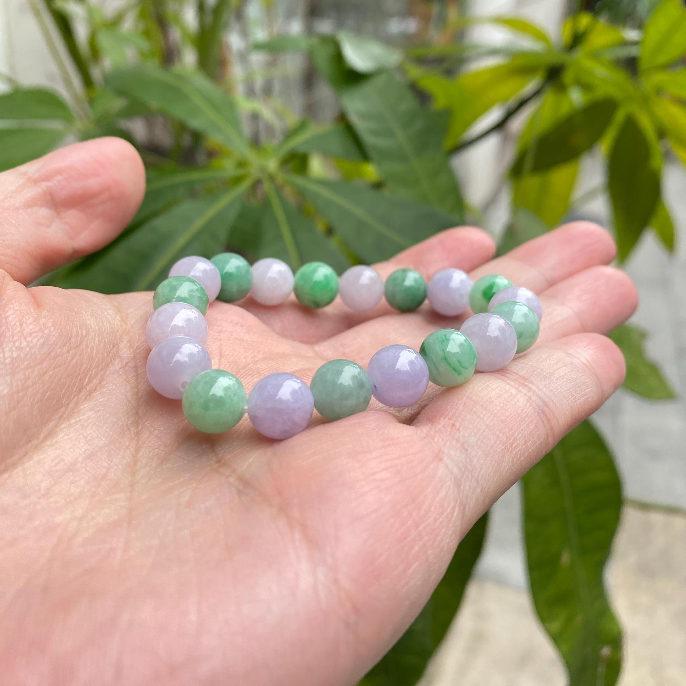 ✅This captivating jade beaded bracelet features 19 beads, alternating between vibrant green and rich purple hues, crafted from natural jadeite and strung on a durable elastic string. With bead sizes ranging from approximately 9 to 9.5mm, this 17cm bracelet offers a perfect fit for your wrist. The interplay of green and purple creates a mesmerizing, harmonious design that exudes natural elegance, making it a versatile accessory for any occasion. Beyond its striking appearance, this jade combination is believed to promote mental well-being, blending the calming energy of green with the serene balance of purple to help reduce stress and anxiety. Ideal for those seeking both style and tranquility in their daily lives, this bracelet is a unique fusion of beauty and peaceful energy.