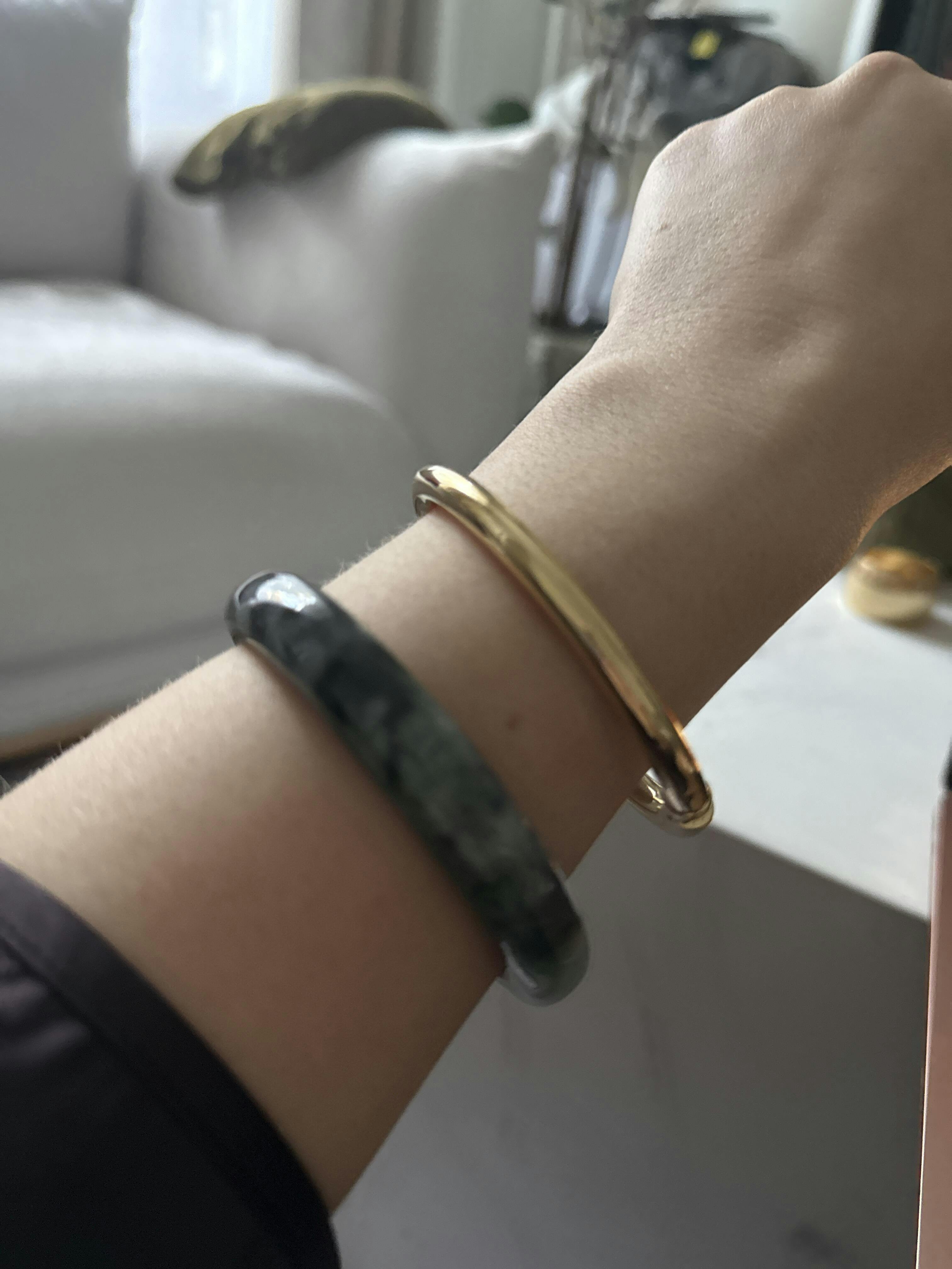 ✅This exquisite bangle features an inner diameter of 60mm and showcases a beautiful gradient of grey and light green that flow beautifully throughout the piece. Renowned for its calming properties, wearing jade can enhance emotional balance and well-being, making it an ideal accessory for meditation and mindfulness practices. This elegant bangle not only adds a unique touch to any outfit but also serves as a meaningful piece that promotes harmony and good fortune in your daily life.