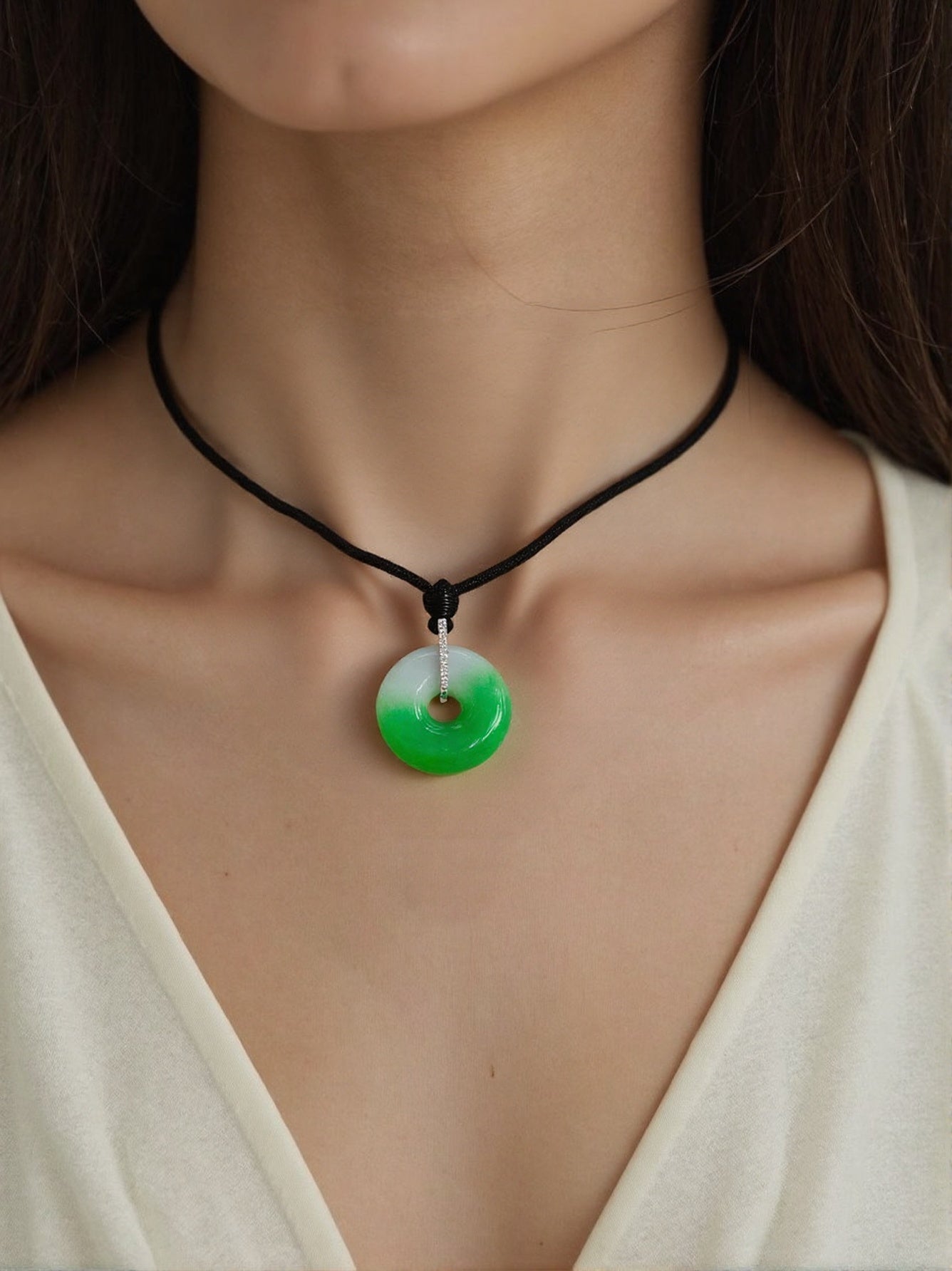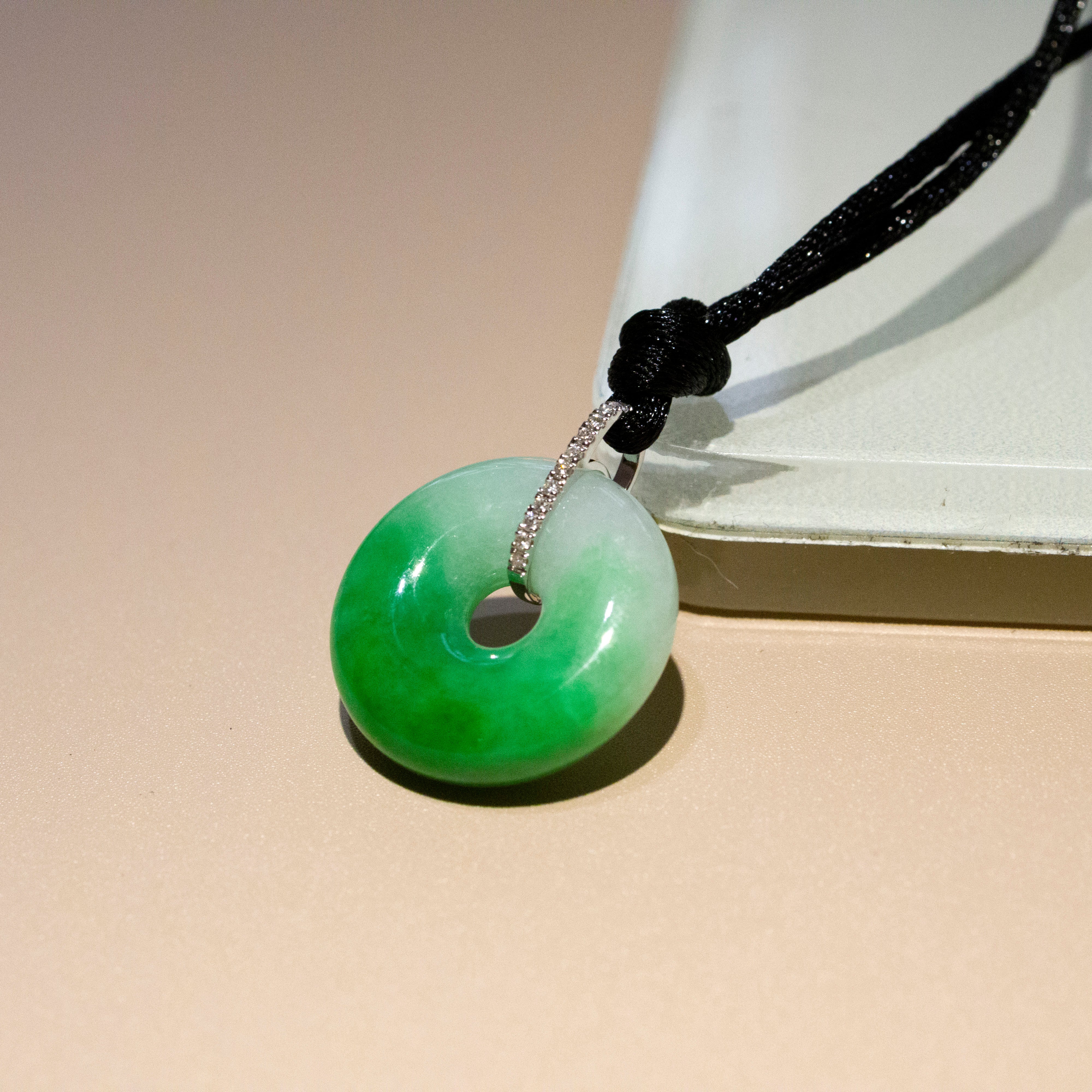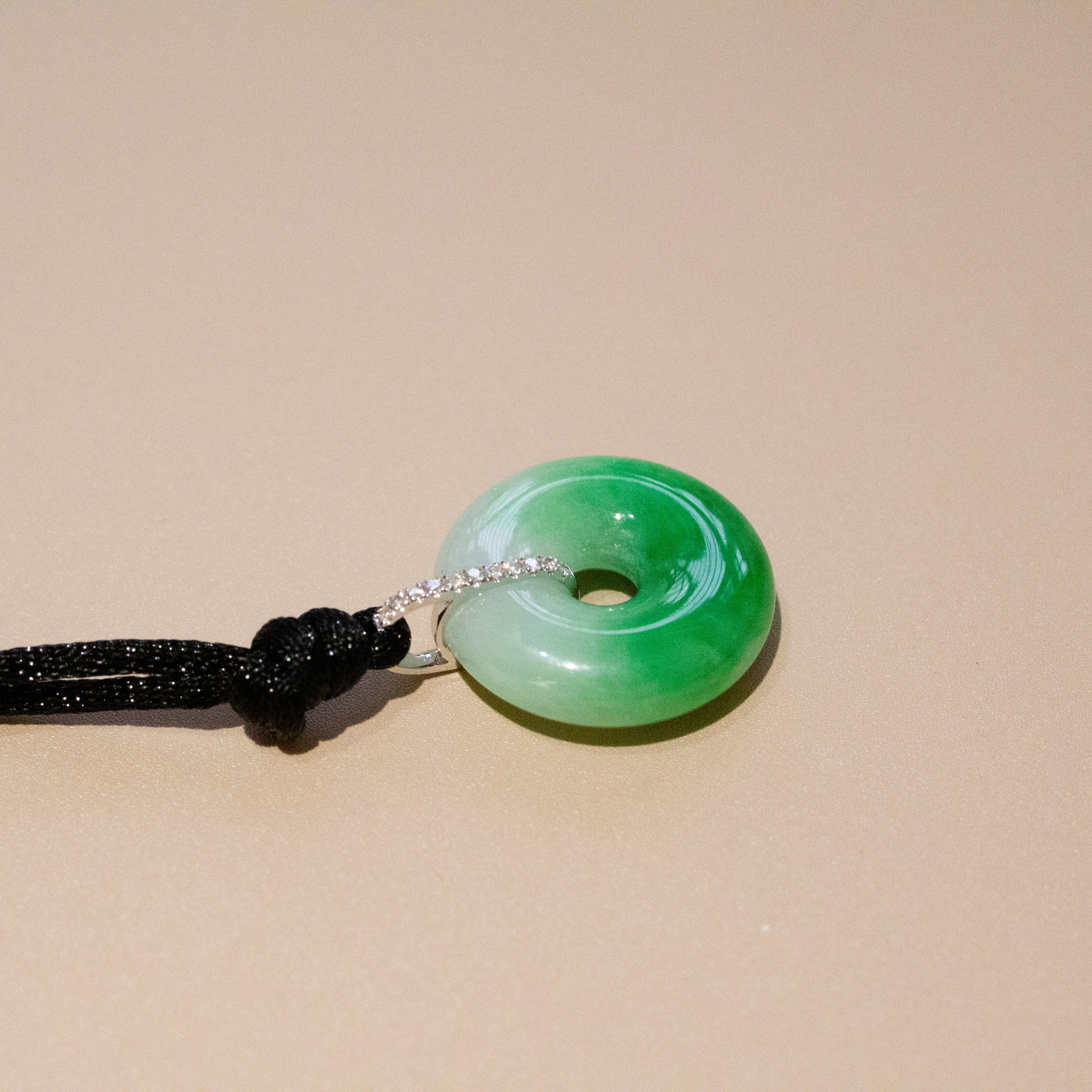 ✅This charming Apple Green Jade Donut Pendant Necklace is a delightful blend of playful elegance and modern simplicity. The vibrant, bright green jade is expertly carved into a smooth, donut-shaped disc, boasting a width of 18.9mm and a thickness of 5.7mm. It’s suspended from a sleek 18K white gold bail encrusted with sparkling diamonds, adding a touch of luxury. The pendant, with a total length of 23.2mm including the bail, comes paired with a black adjustable cord for a comfortable, custom fit.