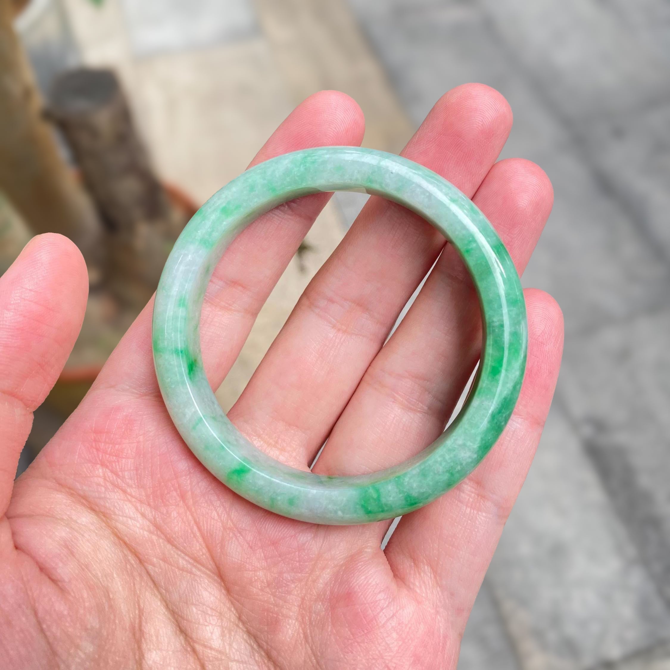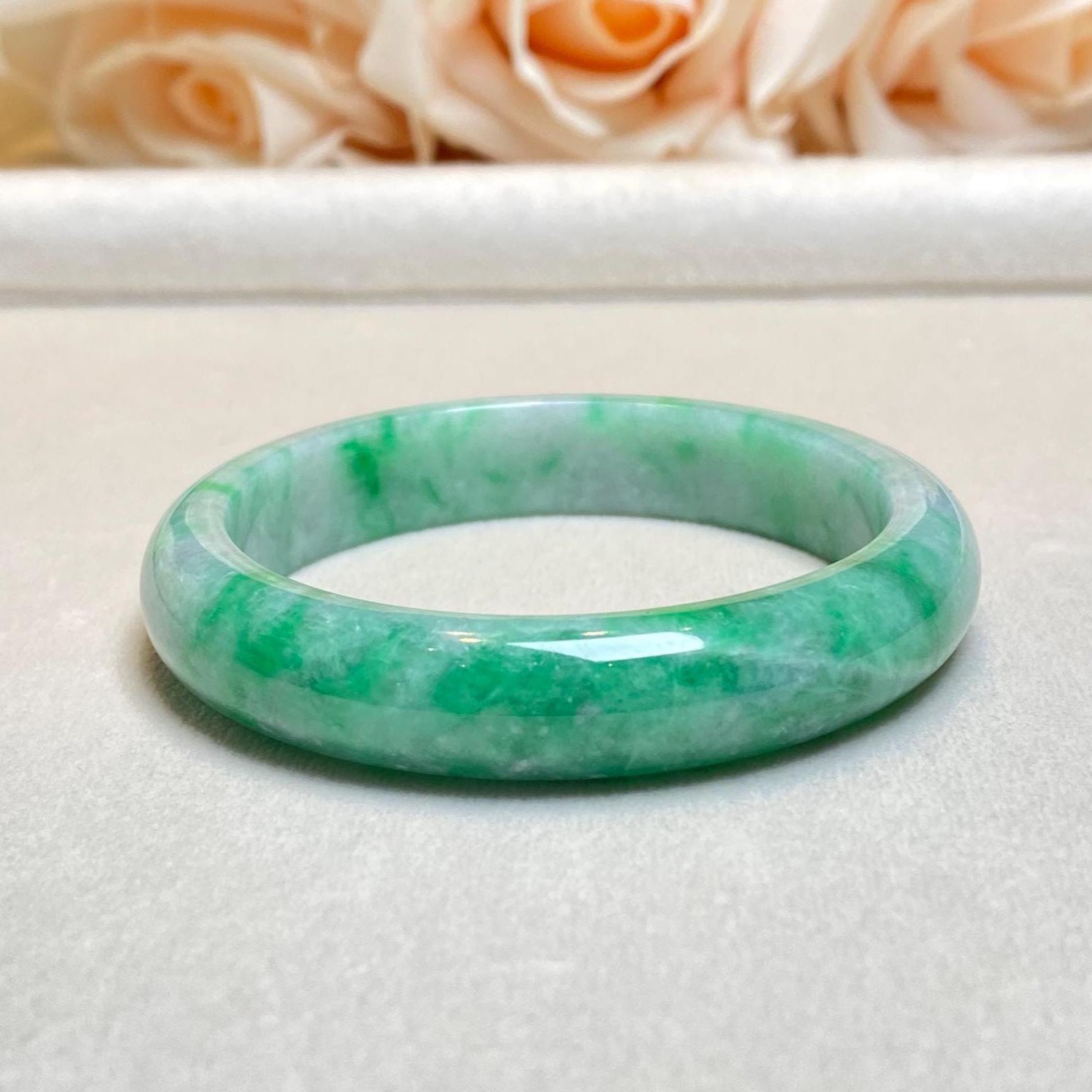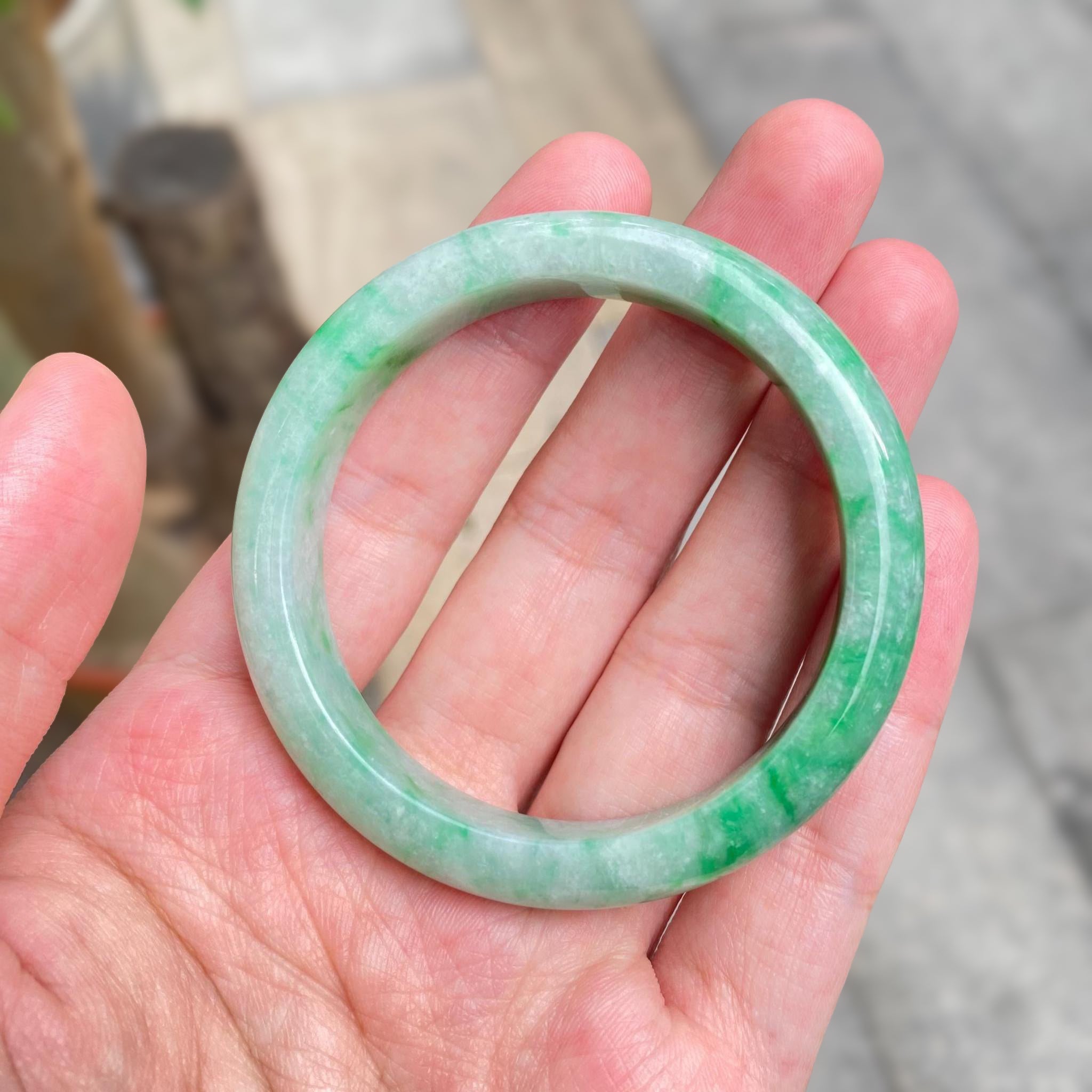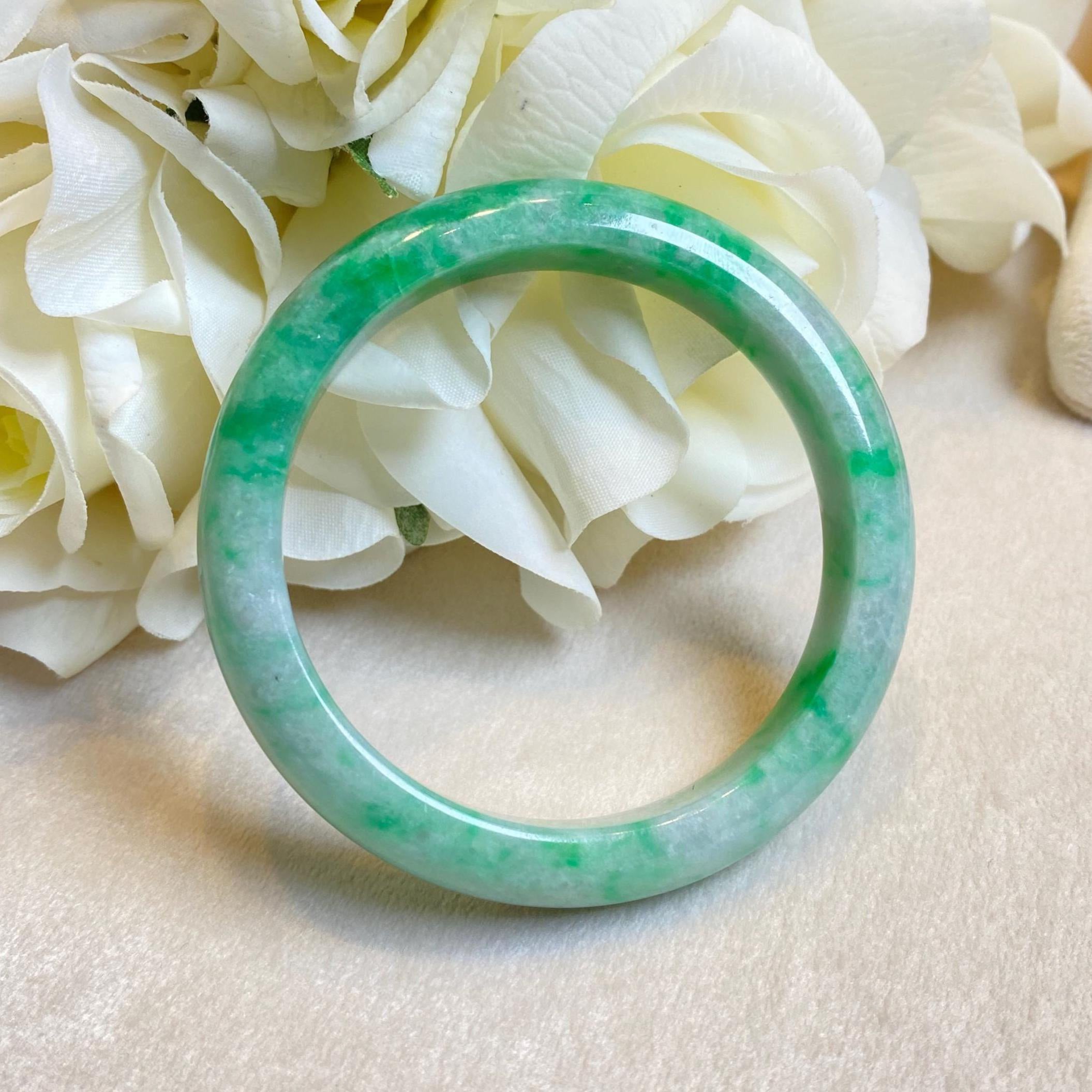 ✅This stunning green jadeite bangle features untreated Type-A jadeite in an intense green color, crafted in a classic round shape with a 52.6mm inner diameter and a flat inner surface for a comfortable fit and timeless elegance. The smooth, polished design highlights the vibrant green hue, making it a standout accessory. Please note that there is a visible crack line on the bangle; however, this crack does not affect the durability of the bangle when worn normally. Known for its harmonizing properties, this bangle is perfect for meditation, mindfulness, or as a meaningful everyday accessory.