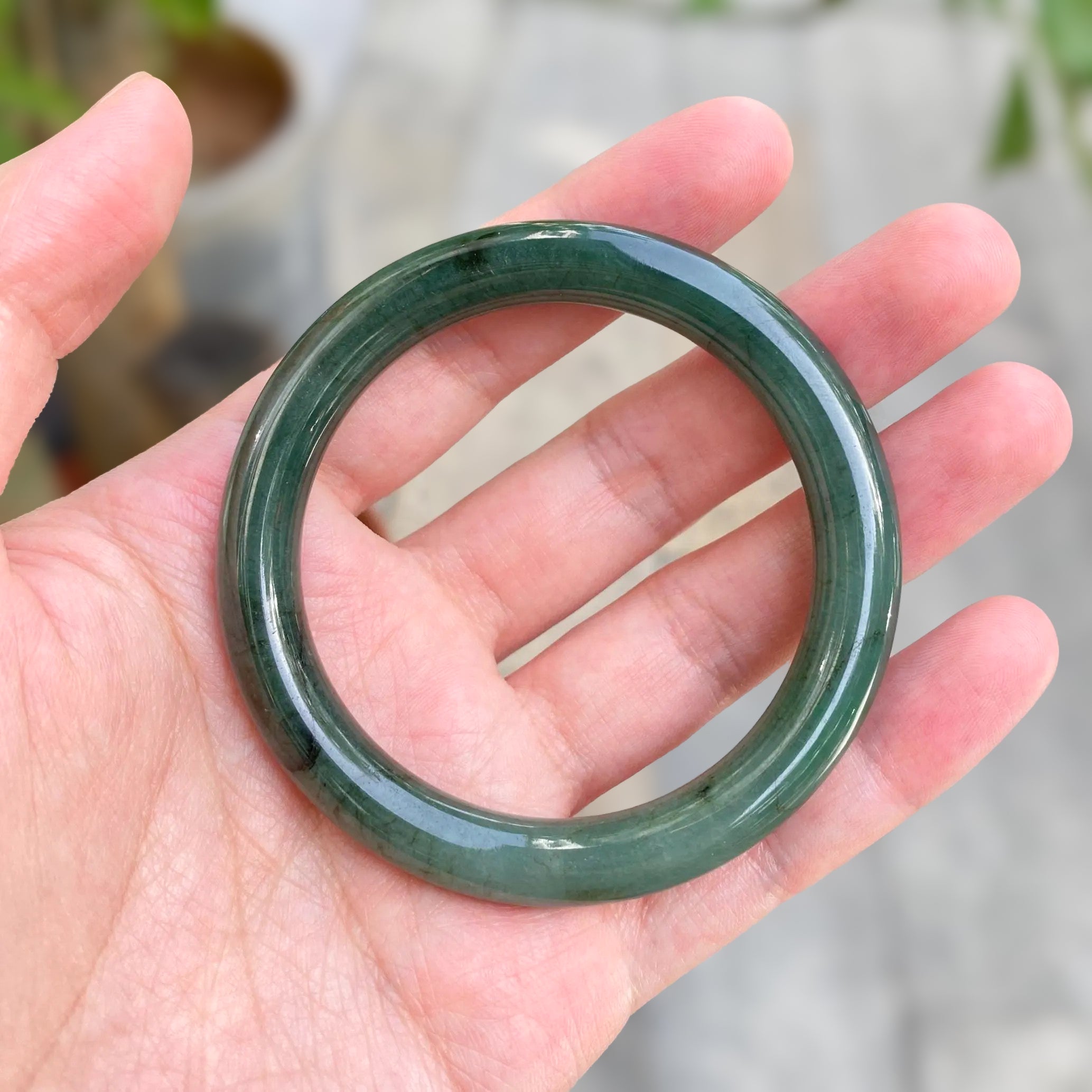 ✅This stunning deep green jadeite bangle bracelet features untreated Type-A Burmese jadeite in a smooth blend of green, and black hues. Crafted in a classic round shape with a 56.6mm inner diameter, it offers a comfortable fit and timeless elegance. Known for its harmonizing properties, this bangle is perfect for meditation, mindfulness, or as a meaningful everyday accessory.